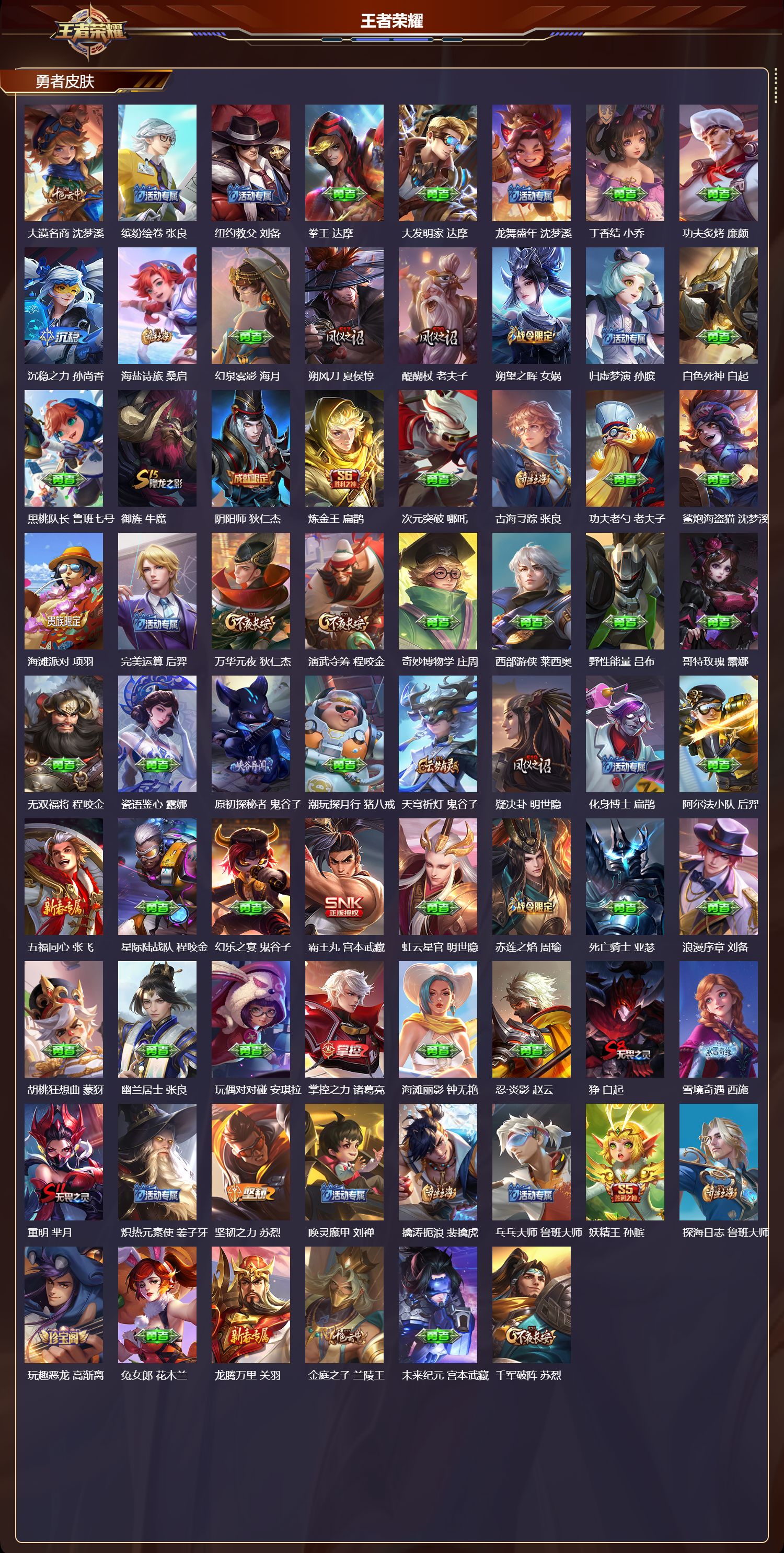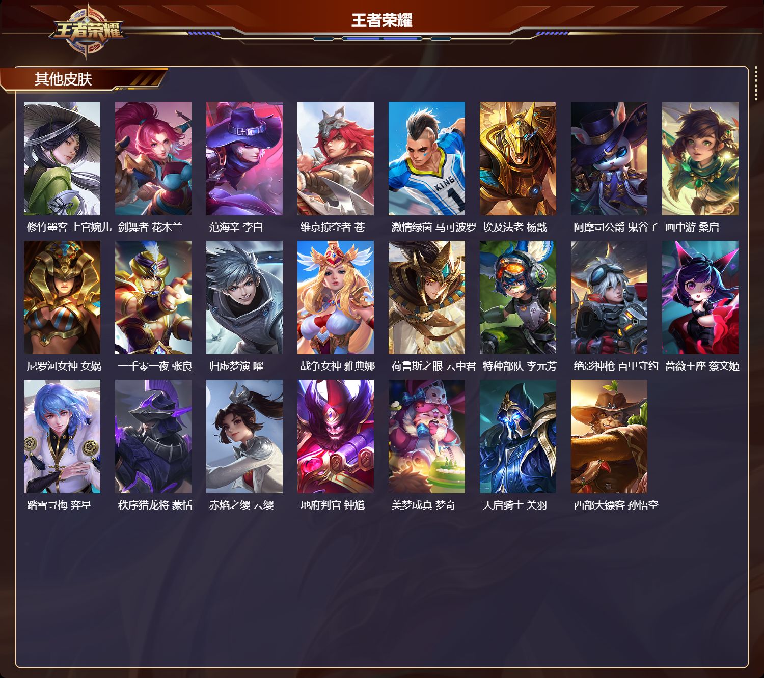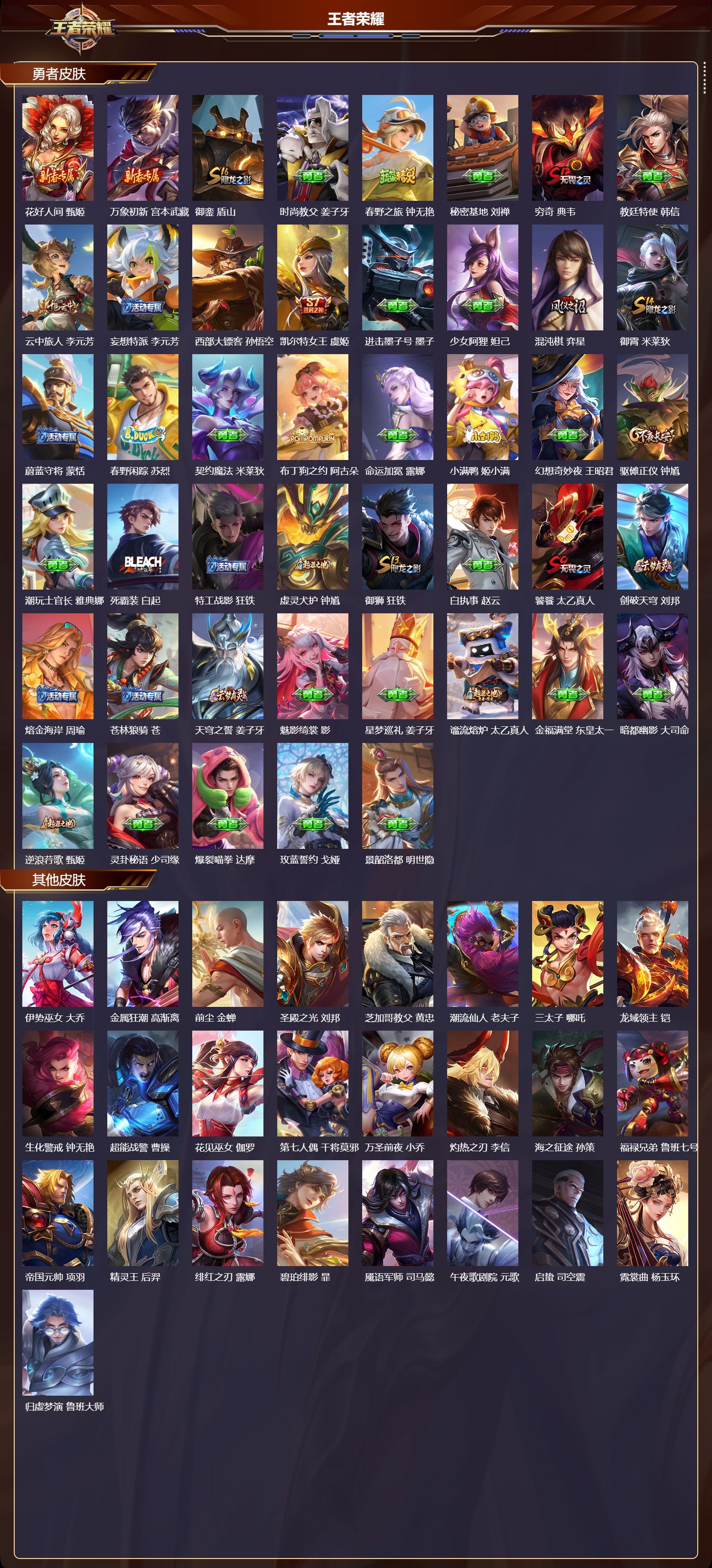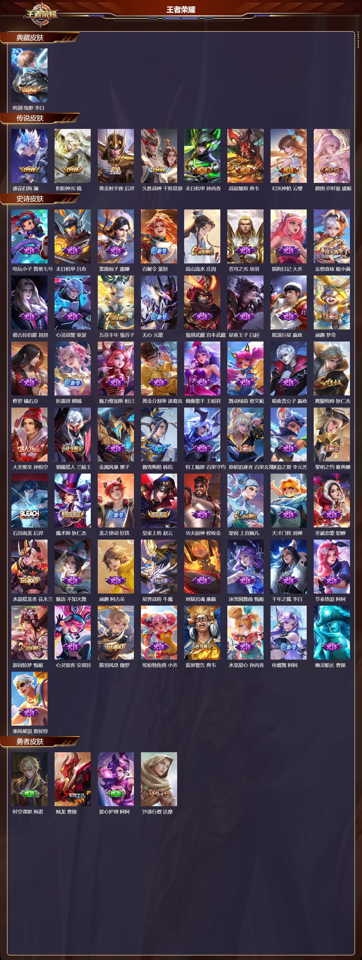 安卓qq/永恒钻石/232皮肤/127英雄/1典藏/0珍品无双/0无双/0珍品传说/8传说/57史诗/9稀有英雄【1 典藏皮肤】鸣剑·曳影 李白【8 传说皮肤】逐花归海 澜炽阳神光 镜黄金射手座 后羿久胜战神 干将莫邪末日机甲 孙尚香战鼓燎原 典韦幻光神呛 云缨愿照·岁时盈 虞姬【57 史诗皮肤】电玩小子 鲁班七号末日机甲 吕布紫霞仙子 露娜百解令 蒙犽