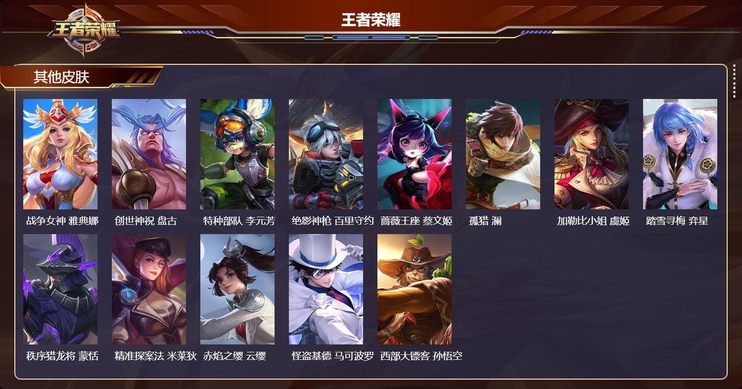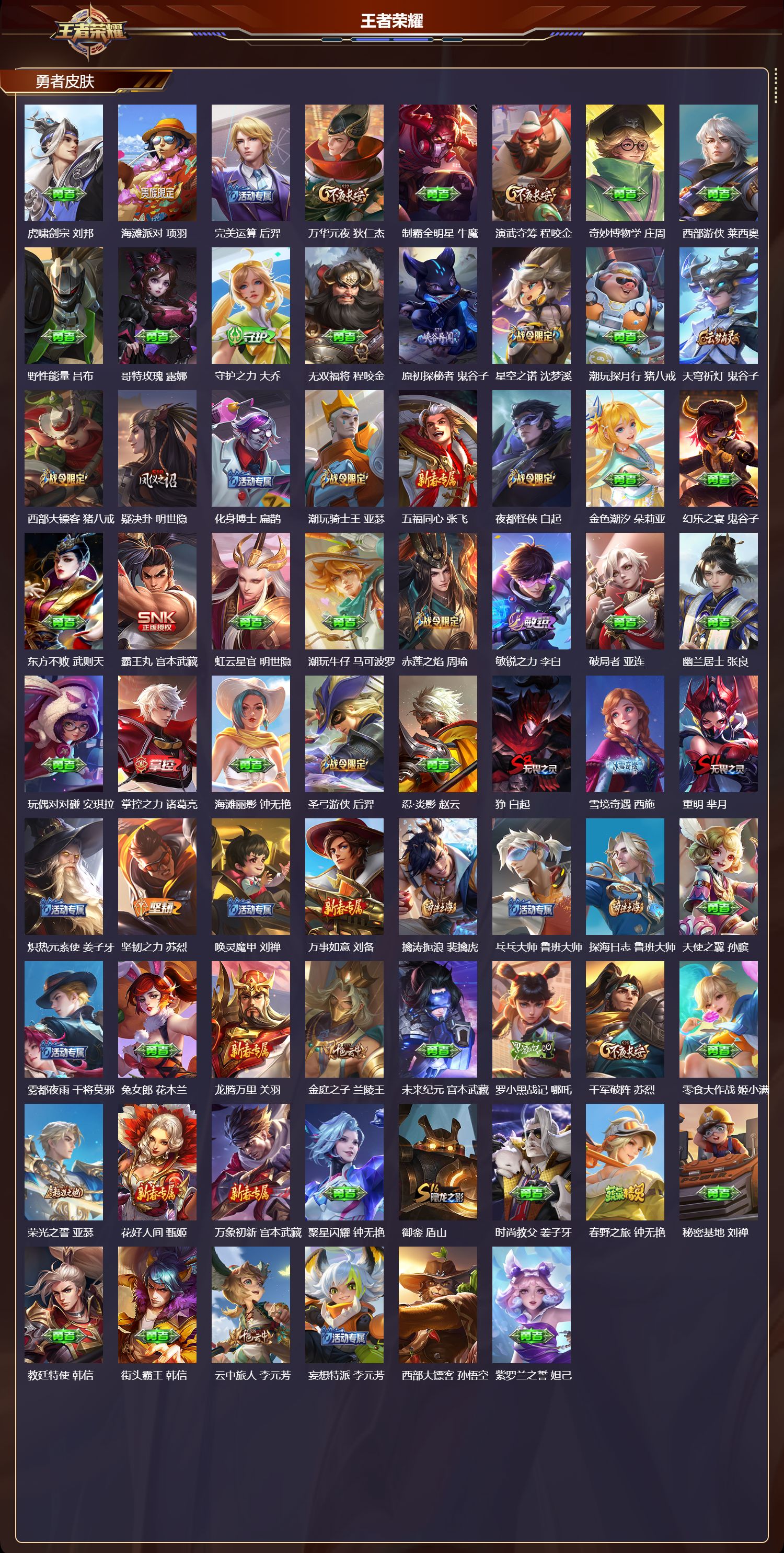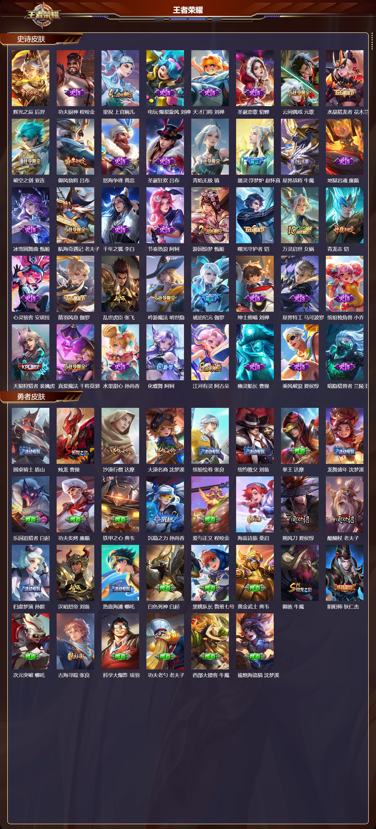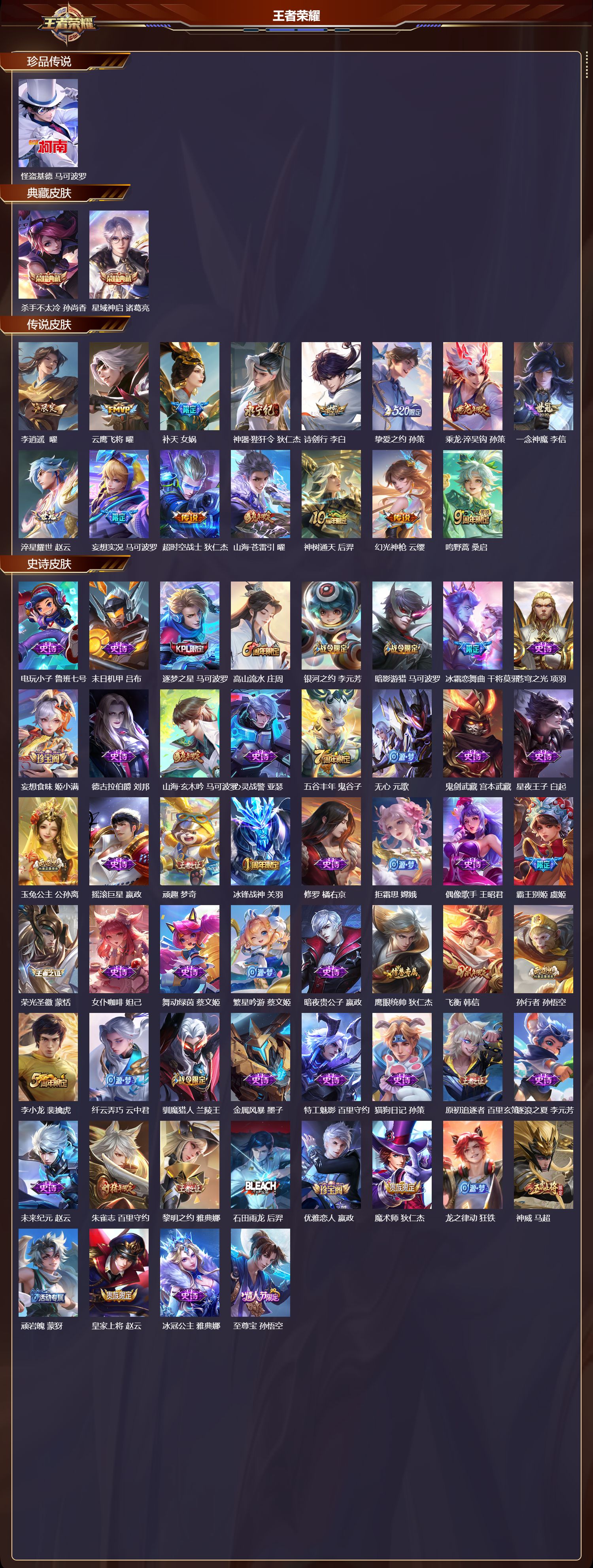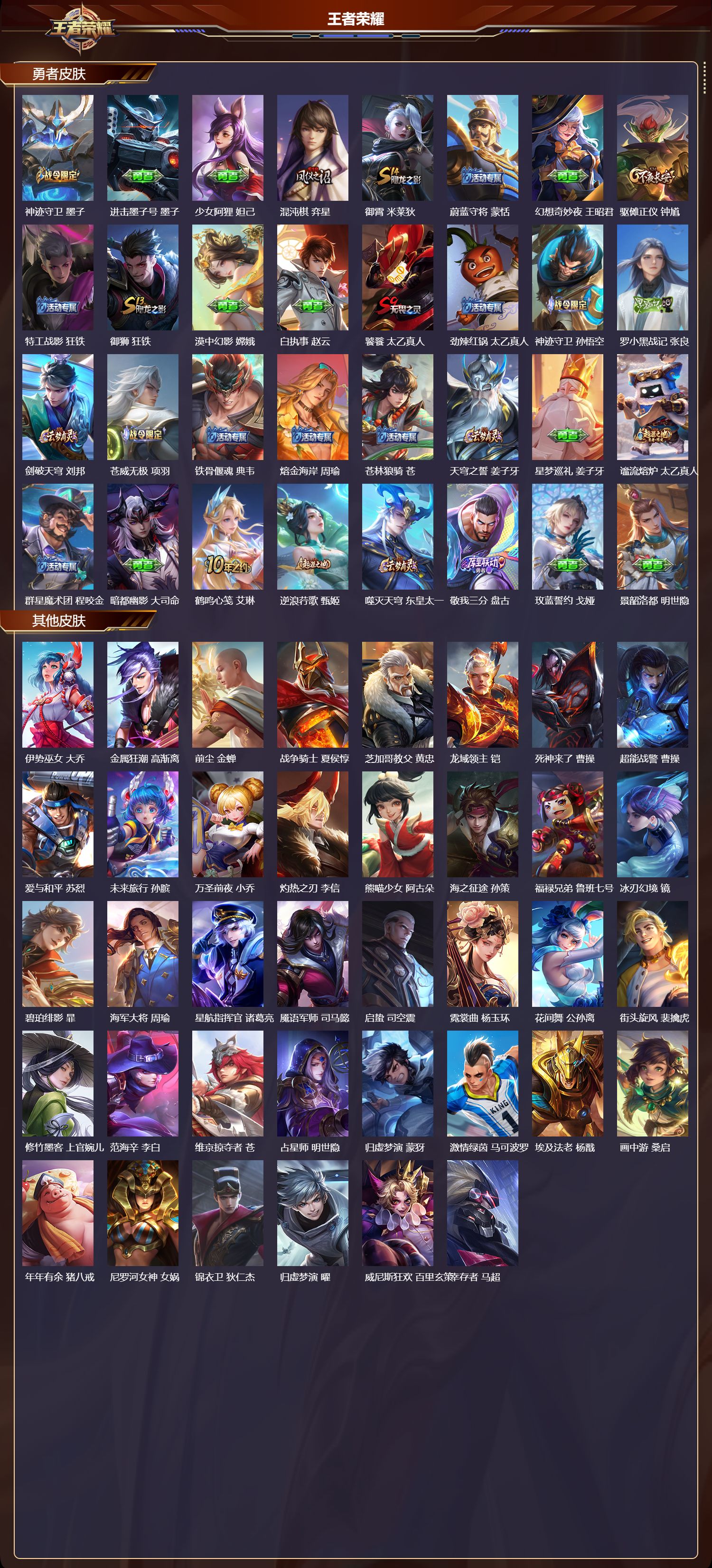 安卓qq/无双王者/292皮肤/127英雄/2典藏/0珍品无双/0无双/1珍品传说/15传说/92史诗/9稀有英雄【1 珍品传说】怪盗基德 马可波罗【2 典藏皮肤】杀手不太冷 孙尚香星域神启 诸葛亮【15 传说皮肤】李 曜云鹰飞将 曜补天 女娲神器·狴犴令 狄仁杰诗剑行 李白挚爱之约 孙策乘龙·淬吴钩 孙策一念神魔 李信淬星耀世 赵云妄想实况 马可