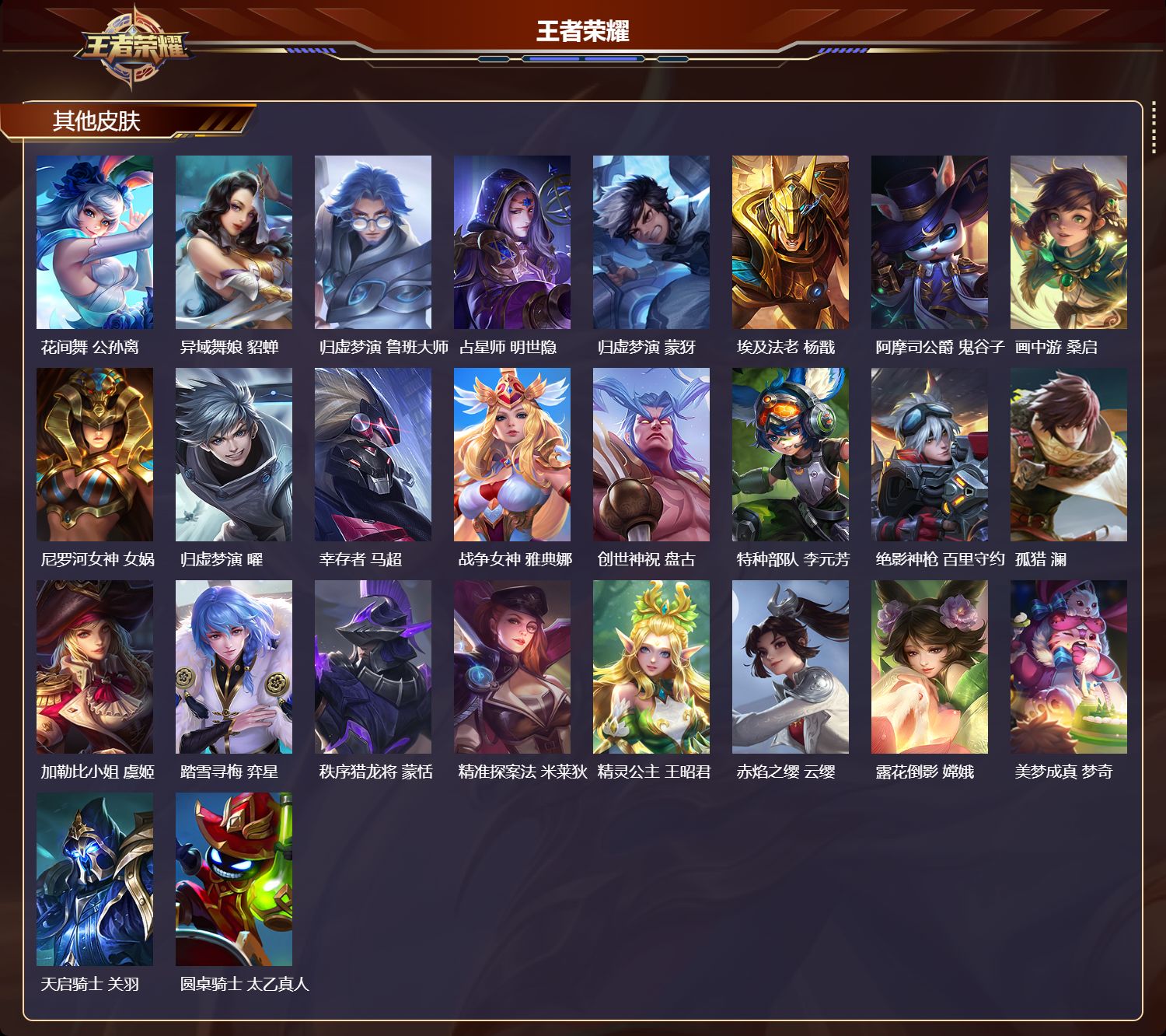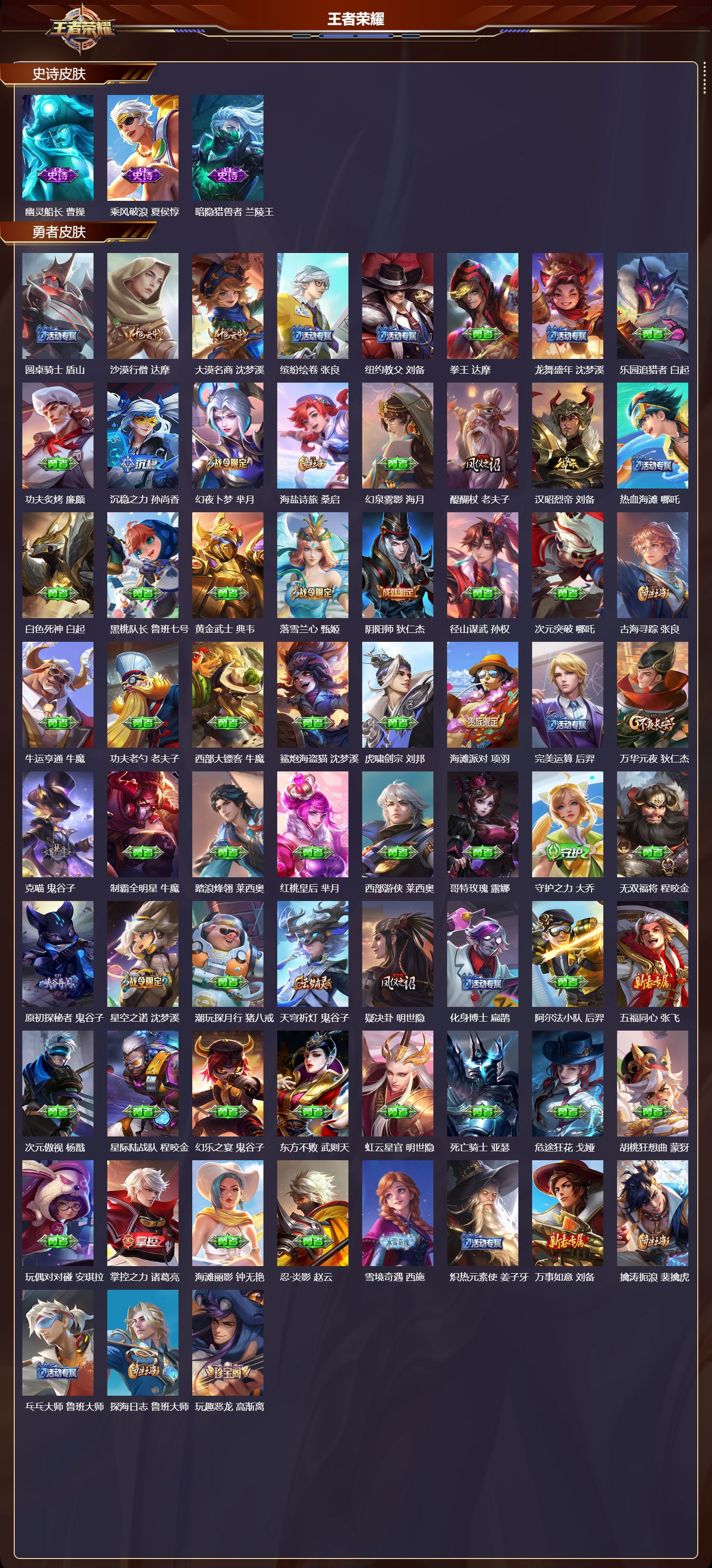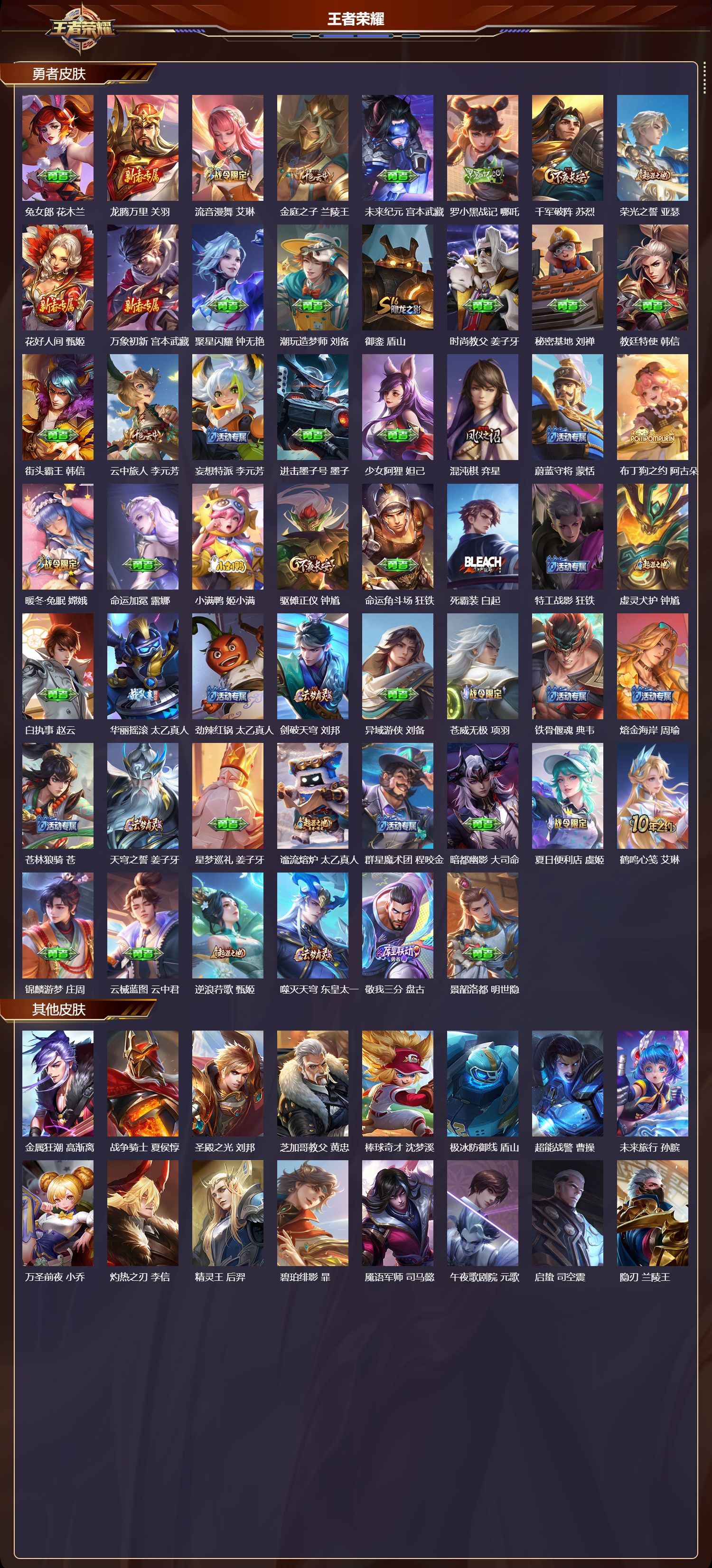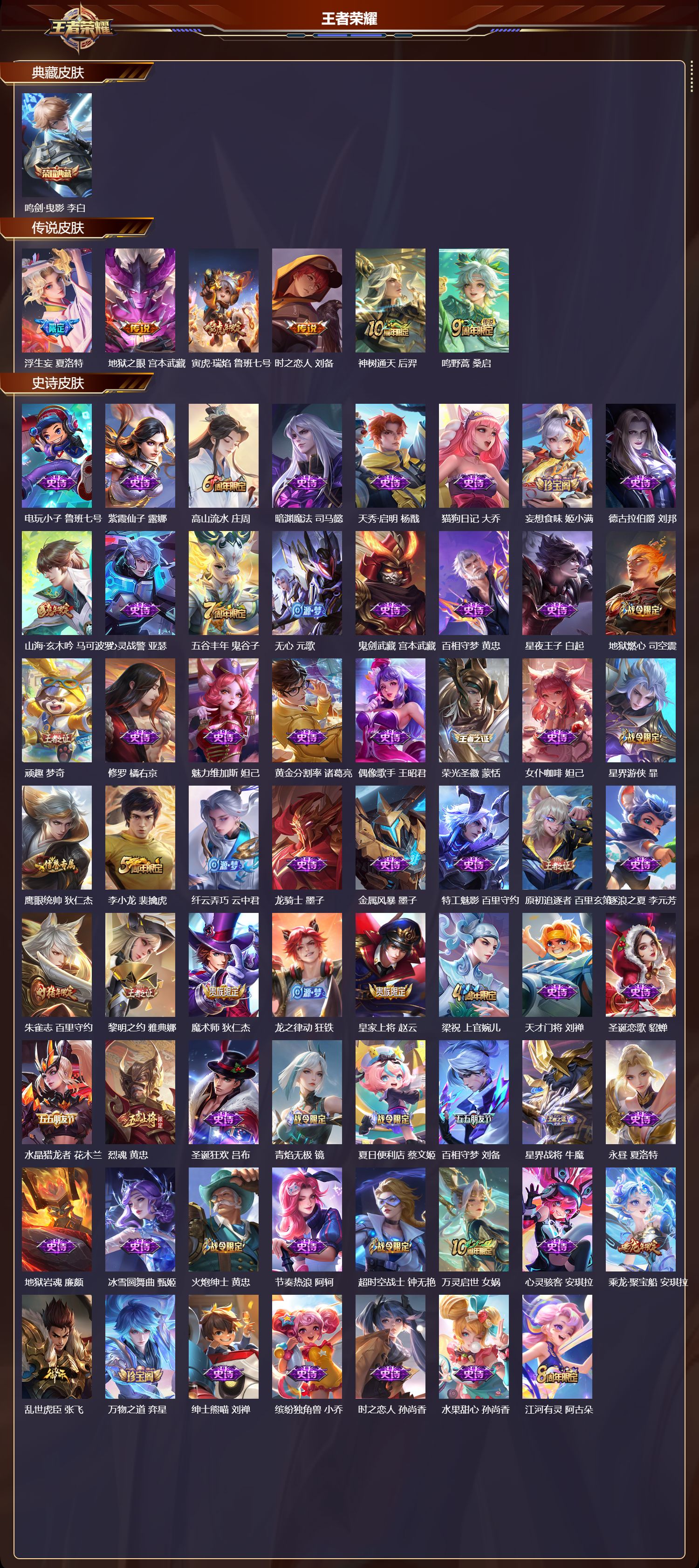 安卓qq/荣耀王者/236皮肤/125英雄/1典藏/0珍品无双/0无双/0珍品传说/6传说/66史诗/7稀有英雄【1 典藏皮肤】鸣剑·曳影 李白【6 传说皮肤】浮生妄 夏洛特地狱之眼 宫本武藏寅虎·瑞焰 鲁班七号时之恋人 刘备神树通天 后羿鸣野蒿 桑启【66 史诗皮肤】电玩小子 鲁班七号紫霞仙子 露娜高山流水 庄周暗渊魔法 司马懿天秀·启明 杨戬猫狗日记