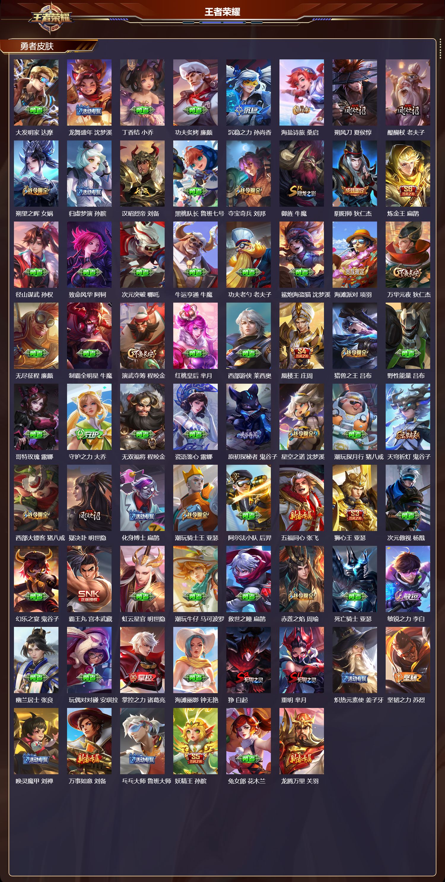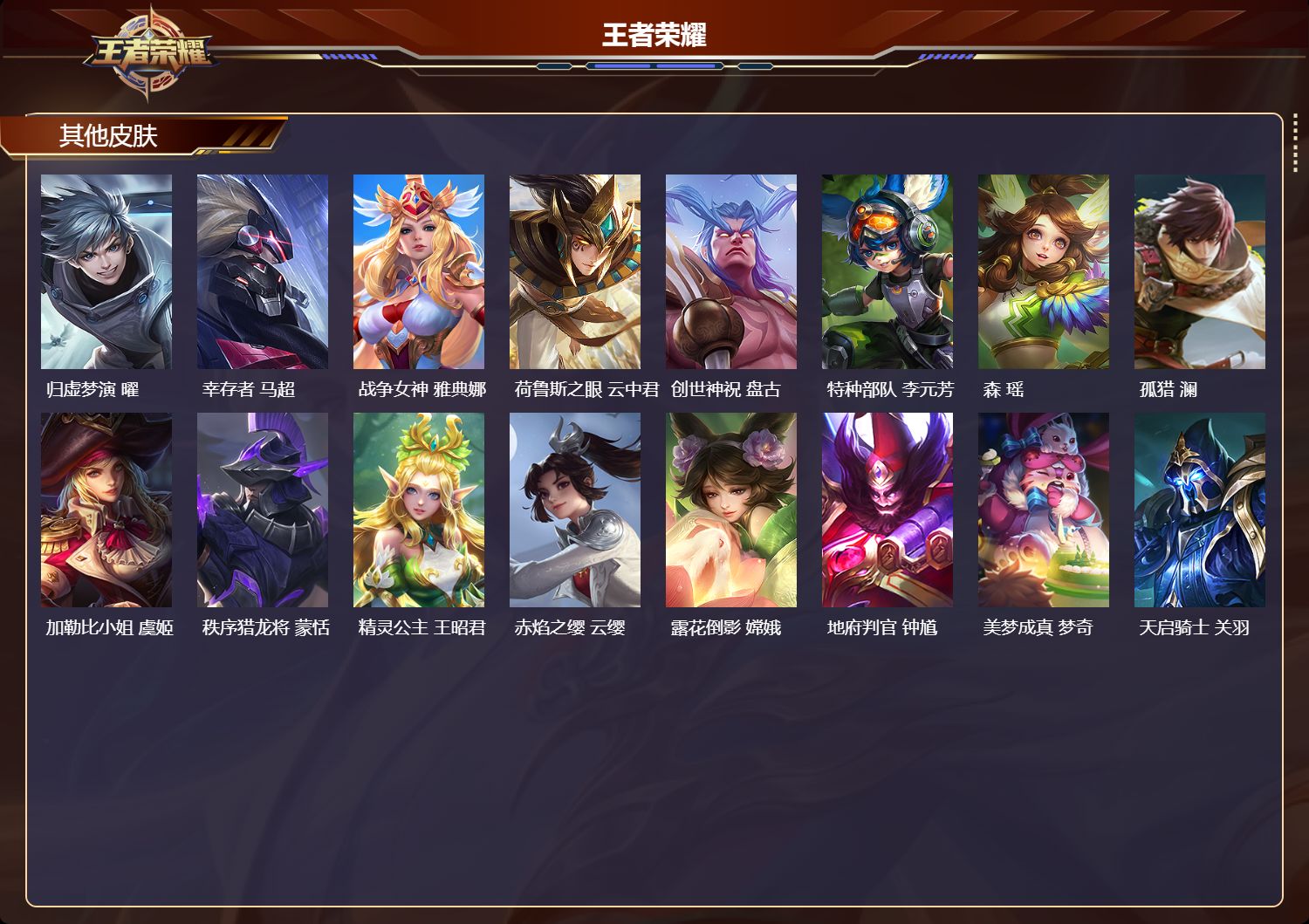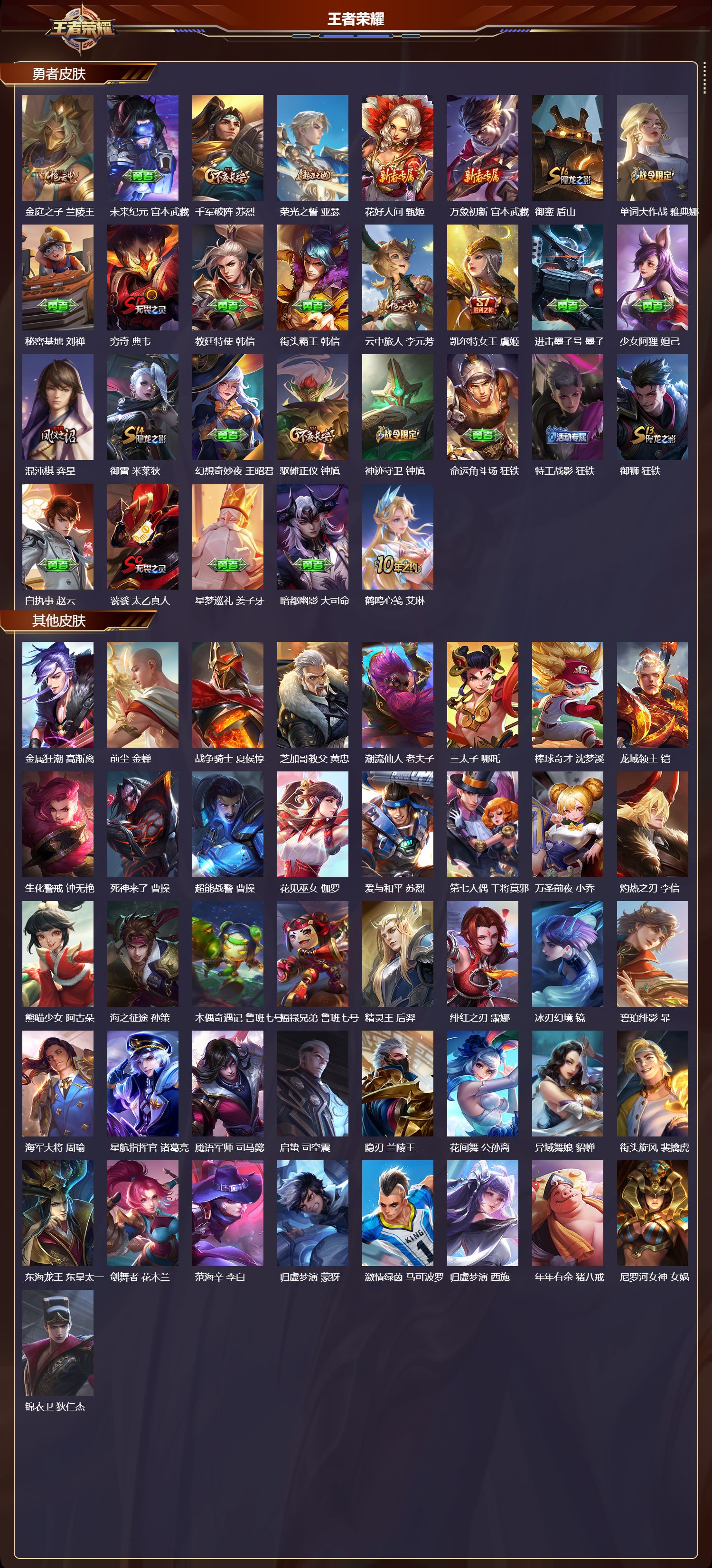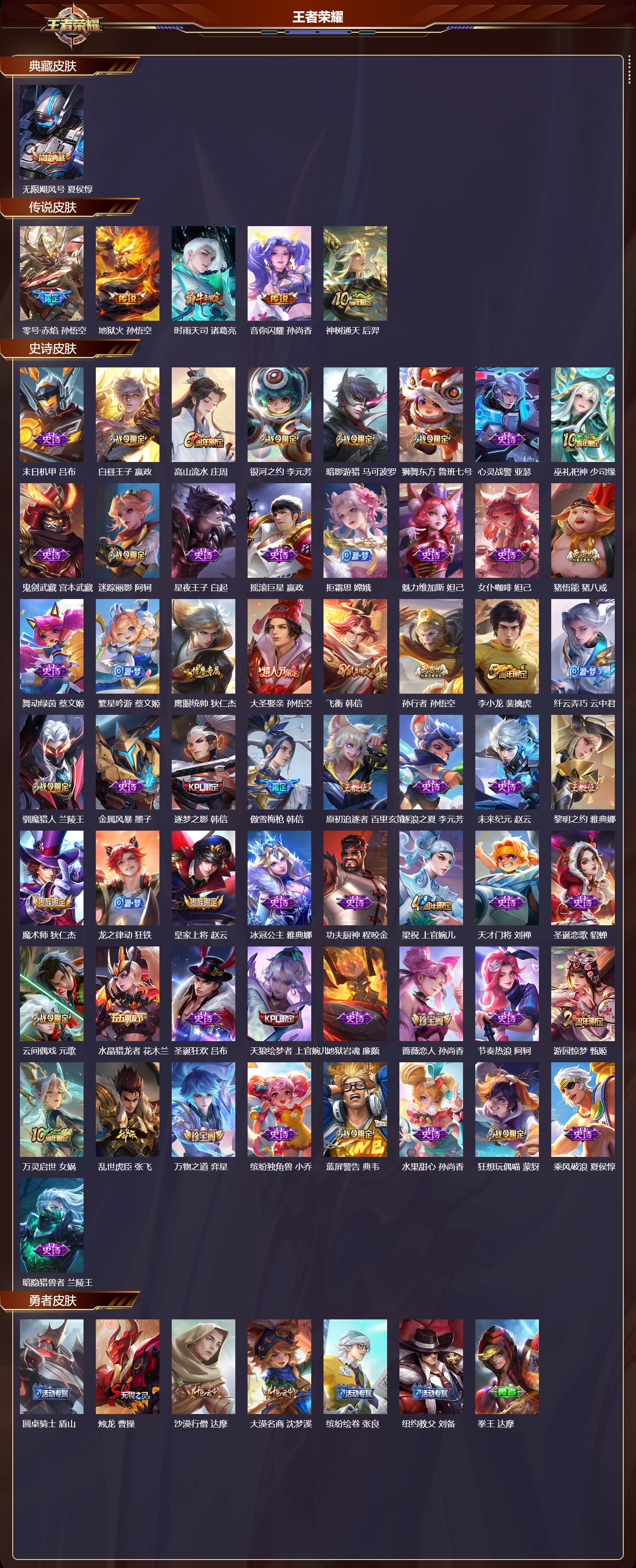 安卓qq/至尊星耀/227皮肤/126英雄/1典藏/0珍品无双/0无双/0珍品传说/5传说/57史诗/8稀有英雄【1 典藏皮肤】无限飓风号 夏侯惇【5 传说皮肤】零号·赤焰 孙悟空地狱火 孙悟空时雨天司 诸葛亮音你闪耀 孙尚香神树通天 后羿【57 史诗皮肤】末日机甲 吕布白昼王子 嬴政高山流水 庄周银河之约 李元芳暗影游猎 马可波罗狮舞东方 鲁班七号心灵