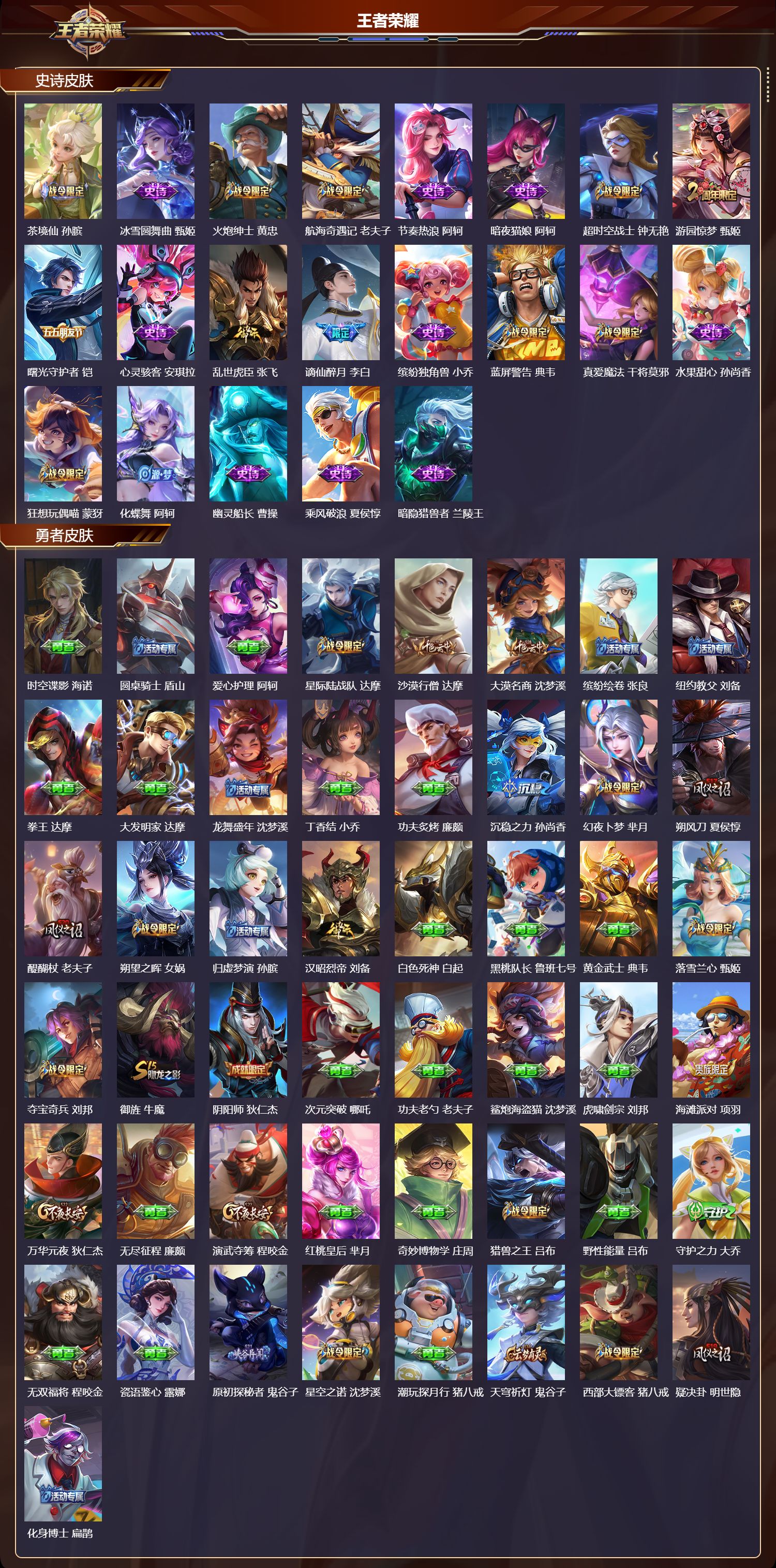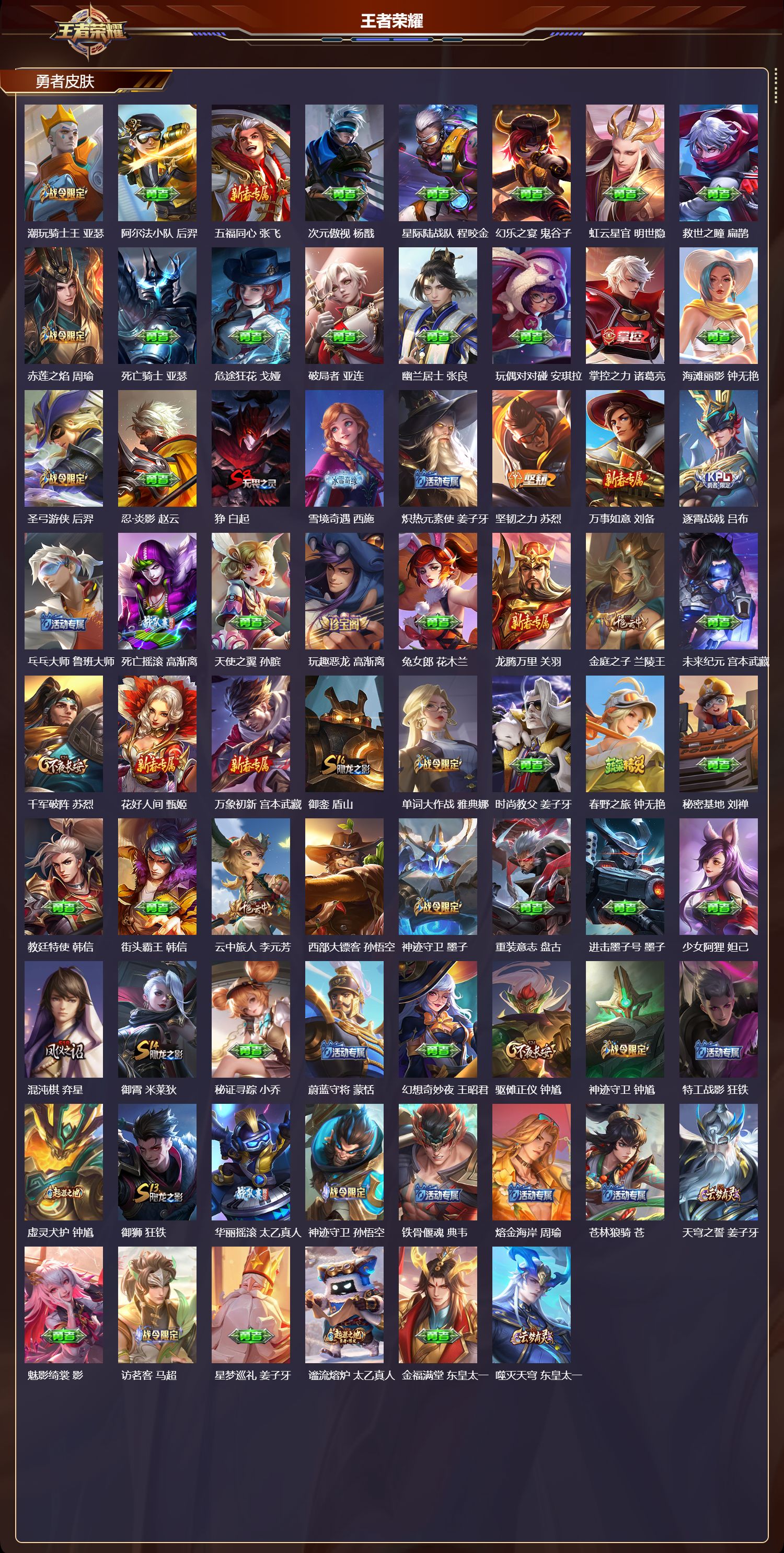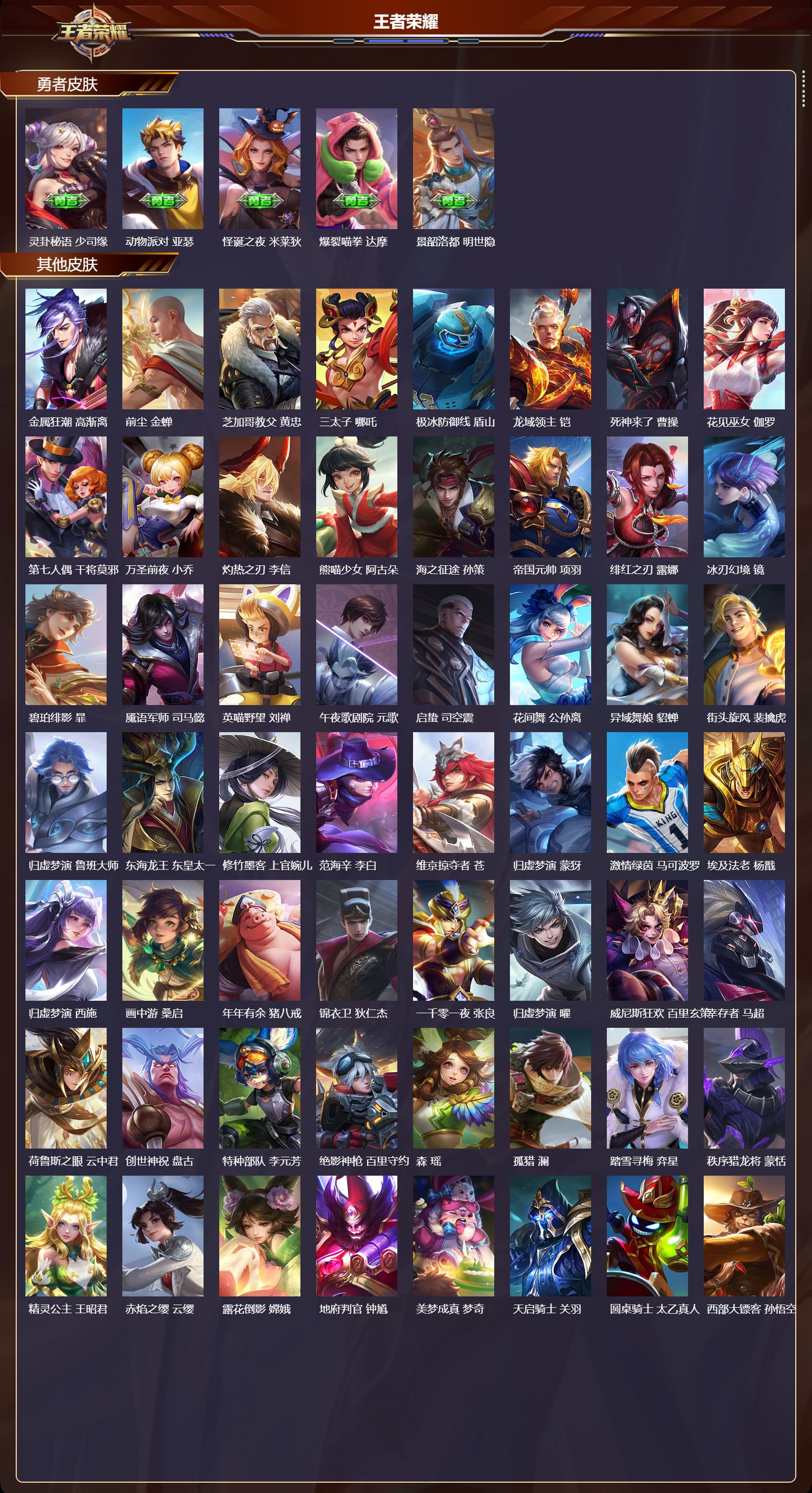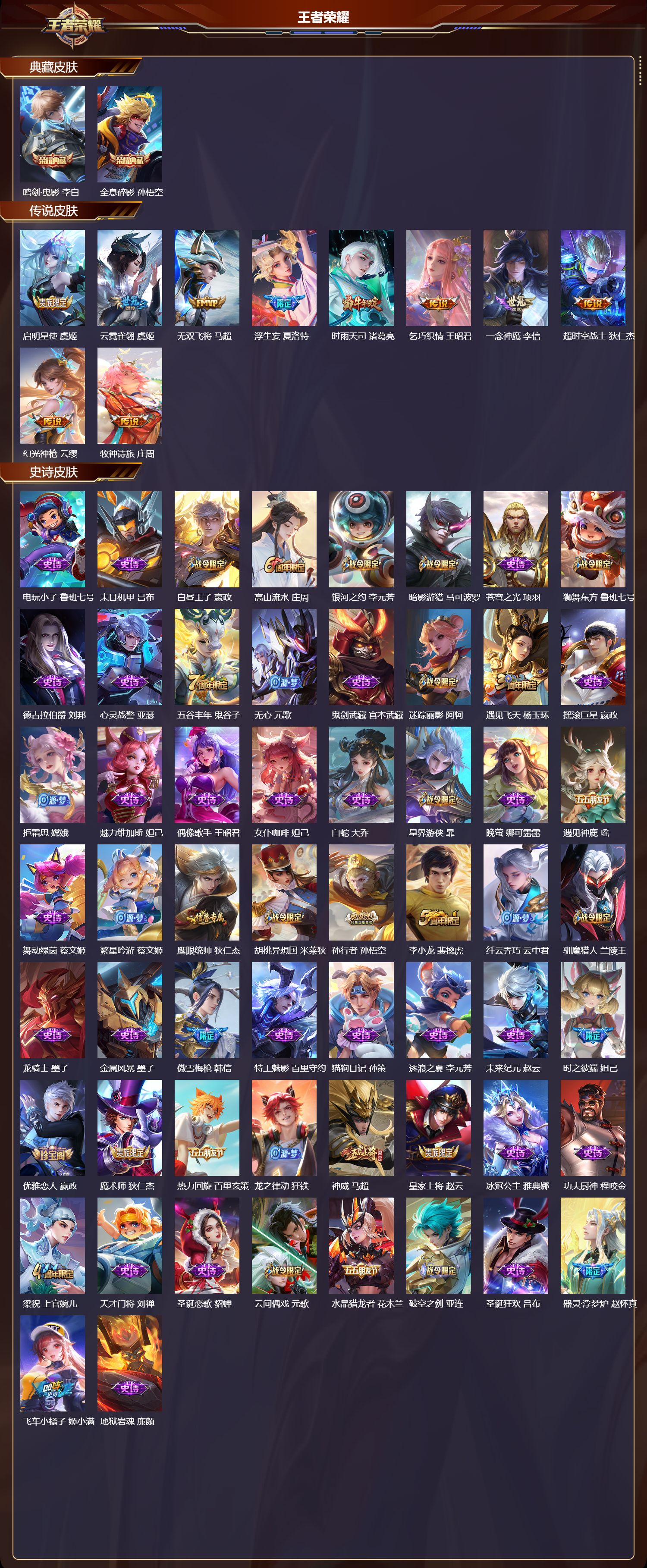 安卓qq/至尊星耀/270皮肤/127英雄/2典藏/0珍品无双/0无双/0珍品传说/10传说/79史诗/9稀有英雄【2 典藏皮肤】鸣剑·曳影 李白全息碎影 孙悟空【10 传说皮肤】启明星使 虞姬云霓雀翎 虞姬无双飞将 马超浮生妄 夏洛特时雨天司 诸葛亮乞巧织情 王昭君一念神魔 李信超时空战士 狄仁杰幻光神呛 云缨牧神诗旅 庄周【79 史诗皮肤】电玩小子