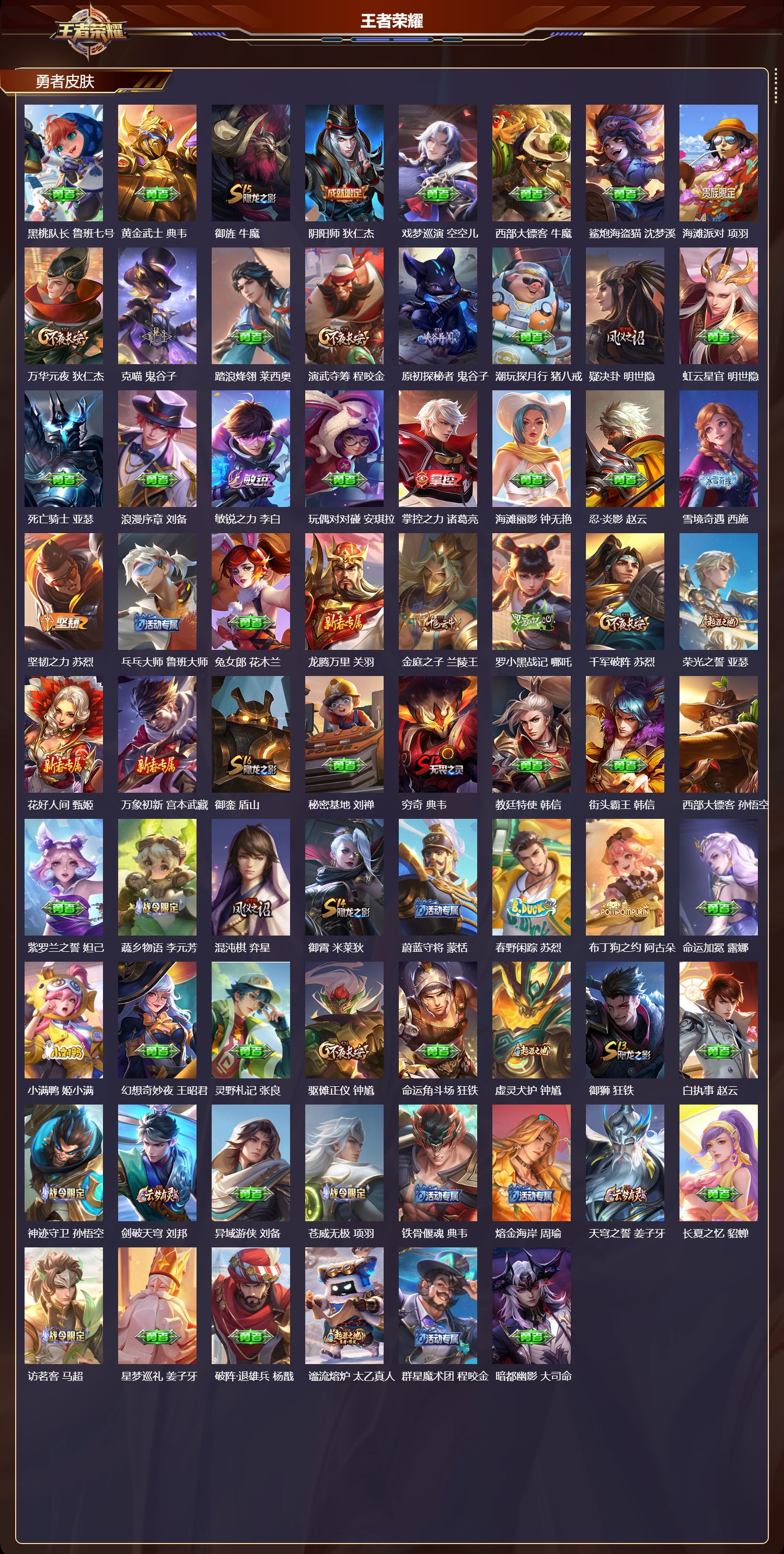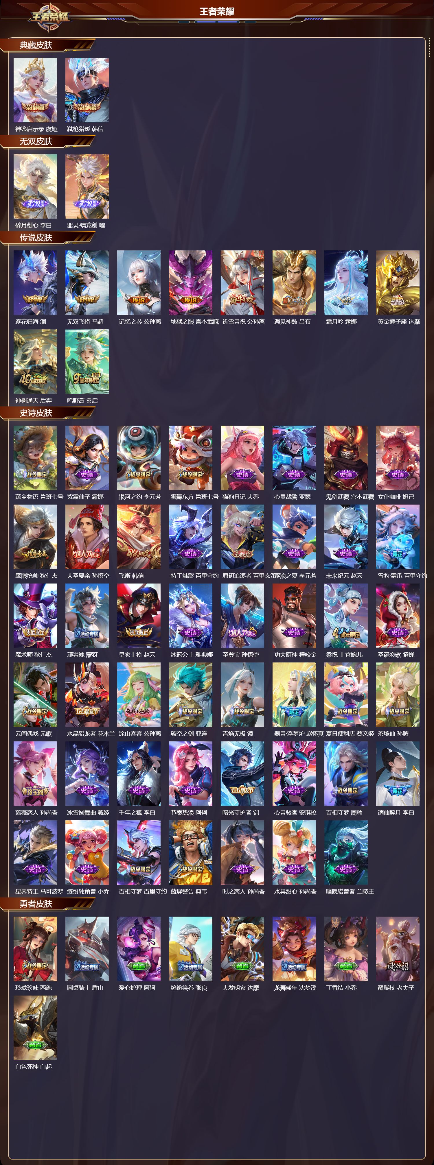 安卓qq/至尊星耀/189皮肤/125英雄/2典藏/0珍品无双/2无双/0珍品传说/10传说/47史诗/7稀有英雄【2 典藏皮肤】神鉴启示录 虞姬弑呛猎影 韩信【2 无双皮肤】碎月剑心 李白器灵·螭龙剑 曜【10 传说皮肤】逐花归海 澜无双飞将 马超记忆之芯 公孙离地狱之眼 宫本武藏祈雪灵祝 公孙离遇见神鼓 吕布霜月吟 露娜黄金狮子座 达摩神树通天 后羿