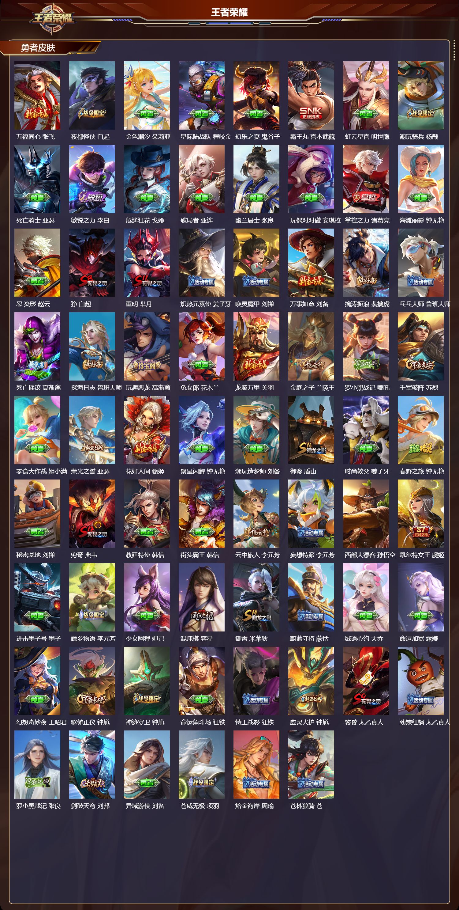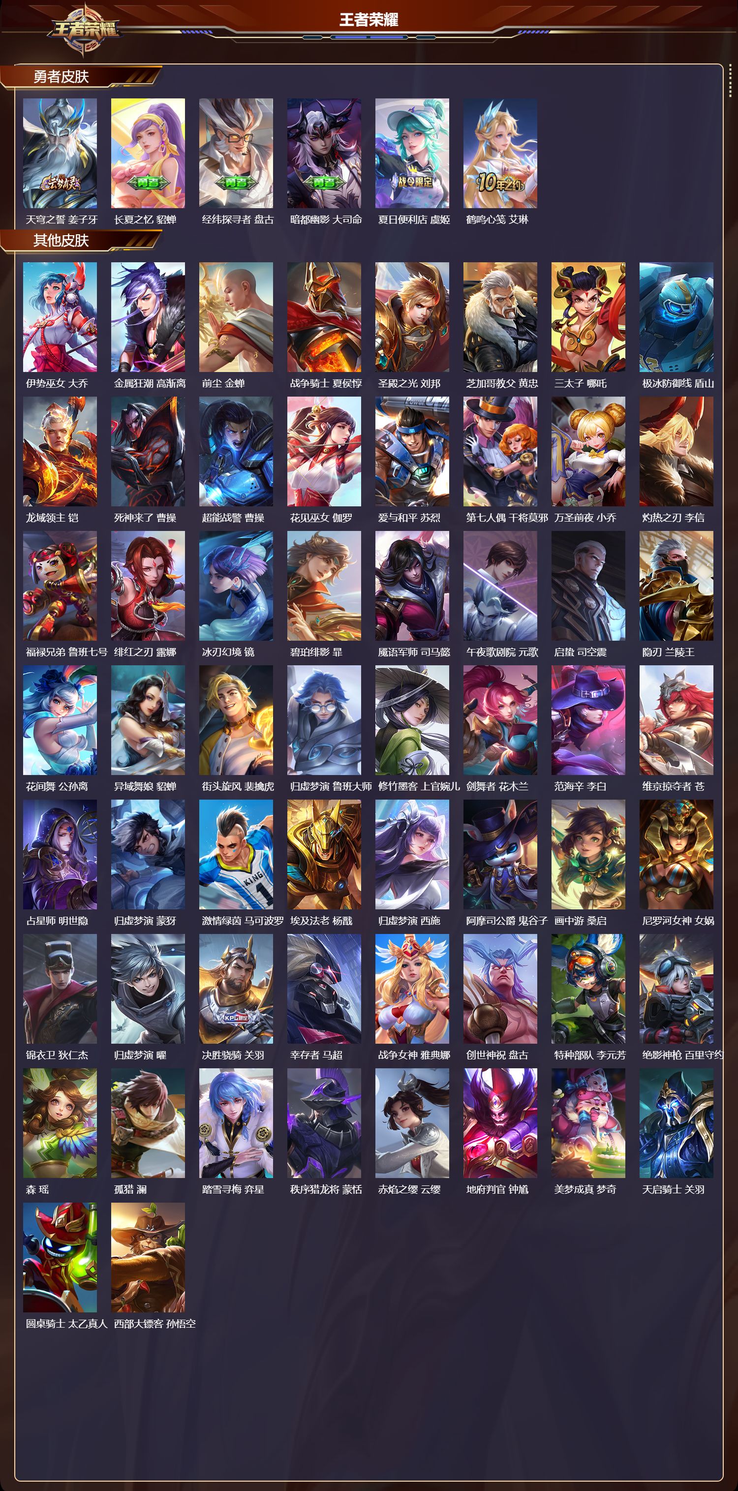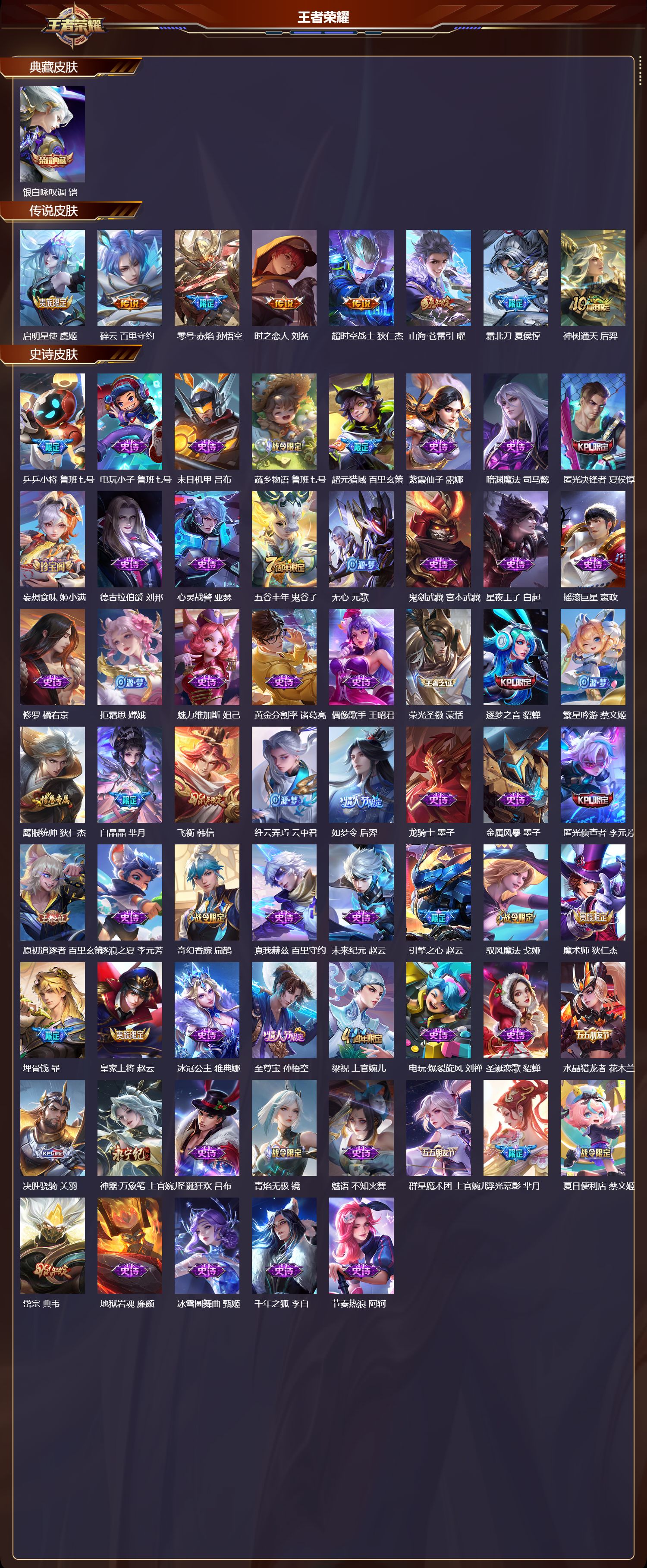 安卓qq/非凡王者/272皮肤/127英雄/1典藏/0珍品无双/0无双/0珍品传说/8传说/73史诗/9稀有英雄【1 典藏皮肤】银白咏叹调 铠【8 传说皮肤】启明星使 虞姬碎云 百里守约零号·赤焰 孙悟空时之恋人 刘备超时空战士 狄仁杰山海·苍雷引 曜霜北刀 夏侯惇神树通天 后羿【73 史诗皮肤】乒乒小将 鲁班七号电玩小子 鲁班七号末日机甲 吕布蔬乡物语