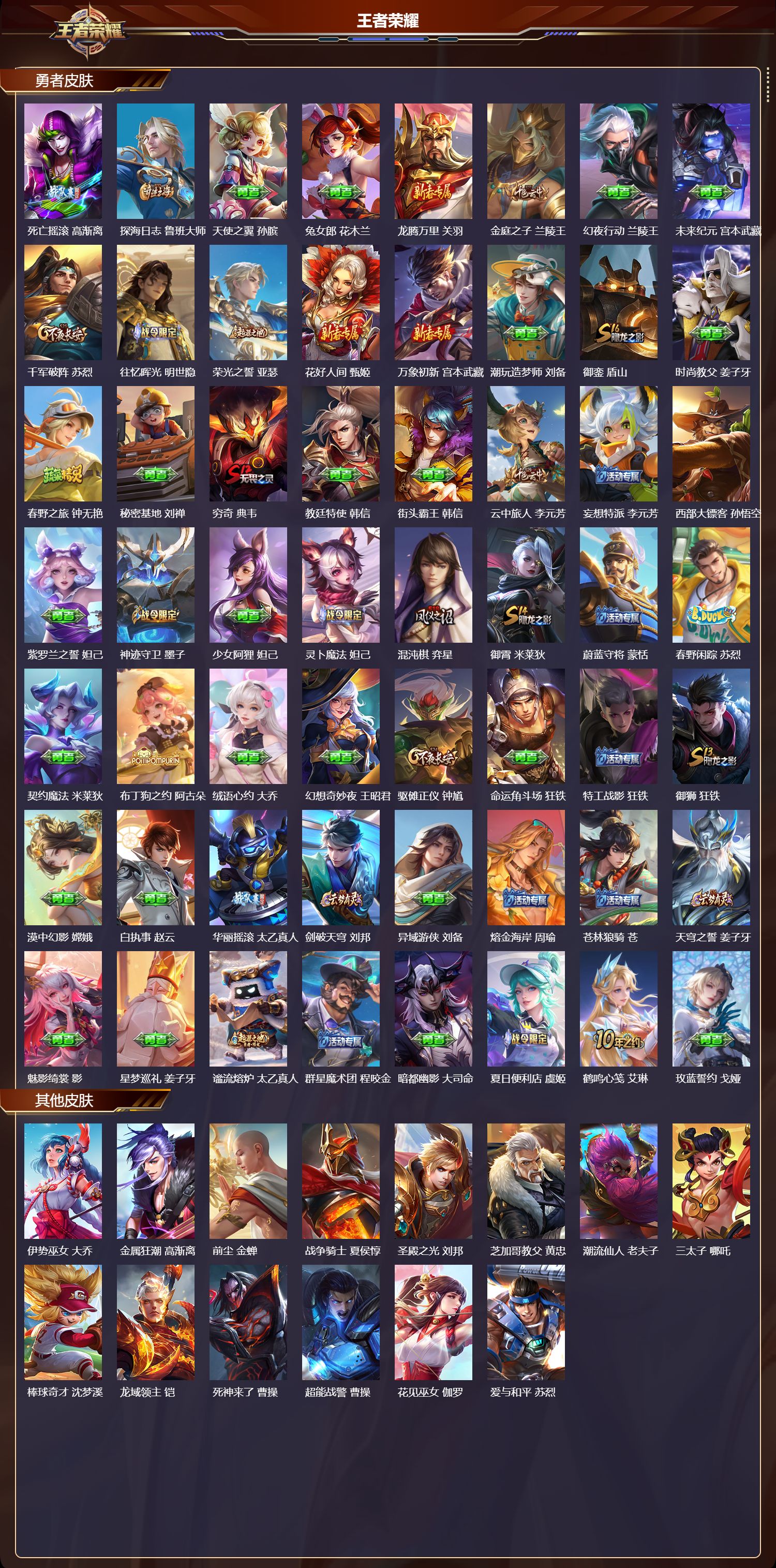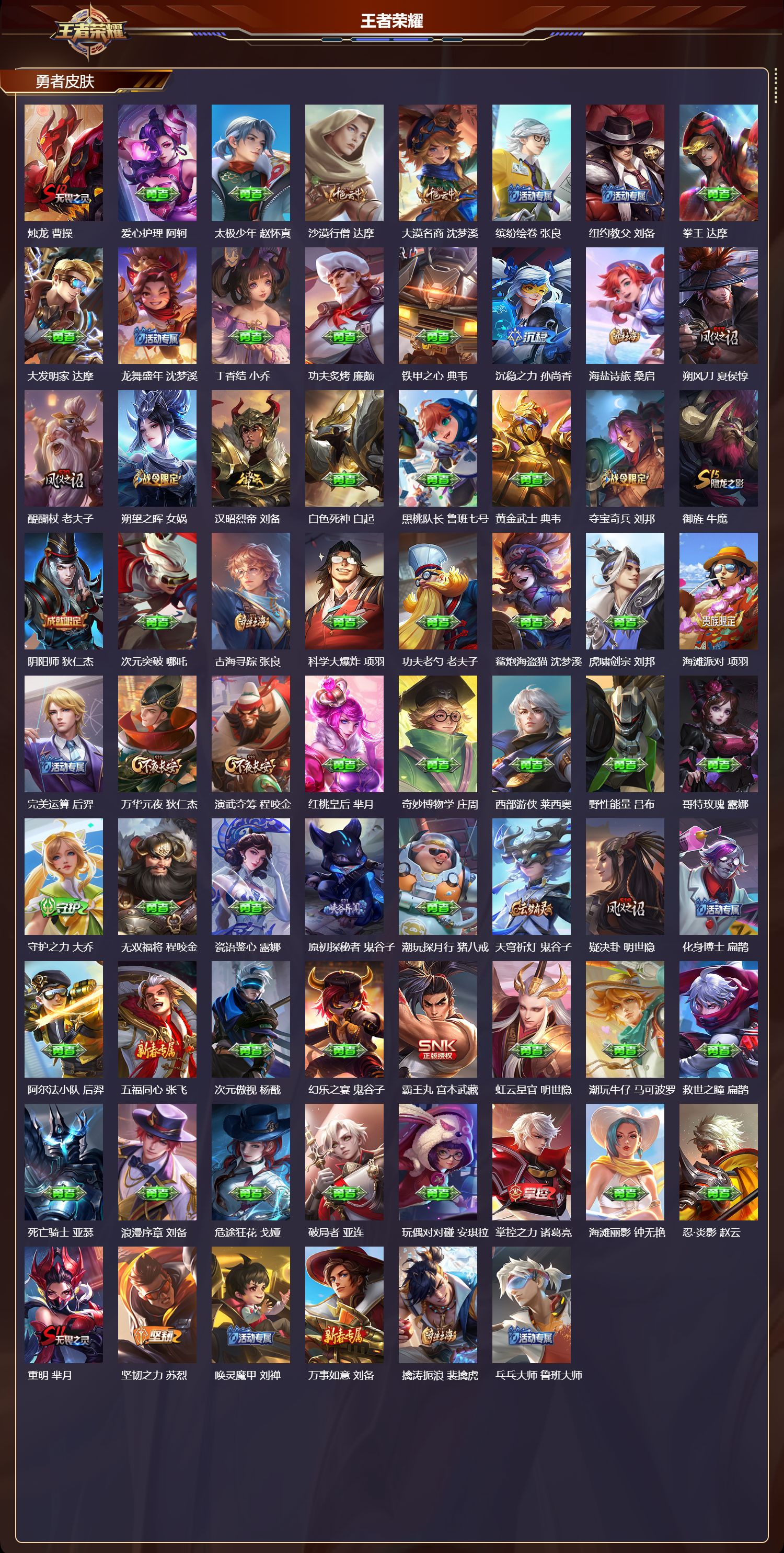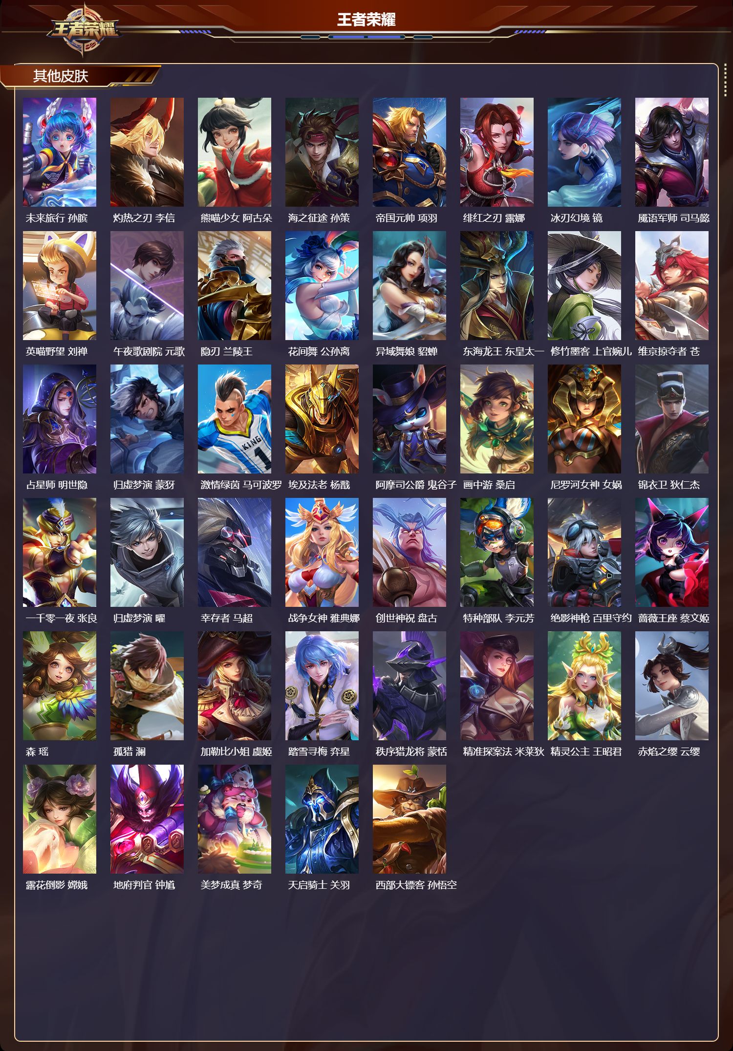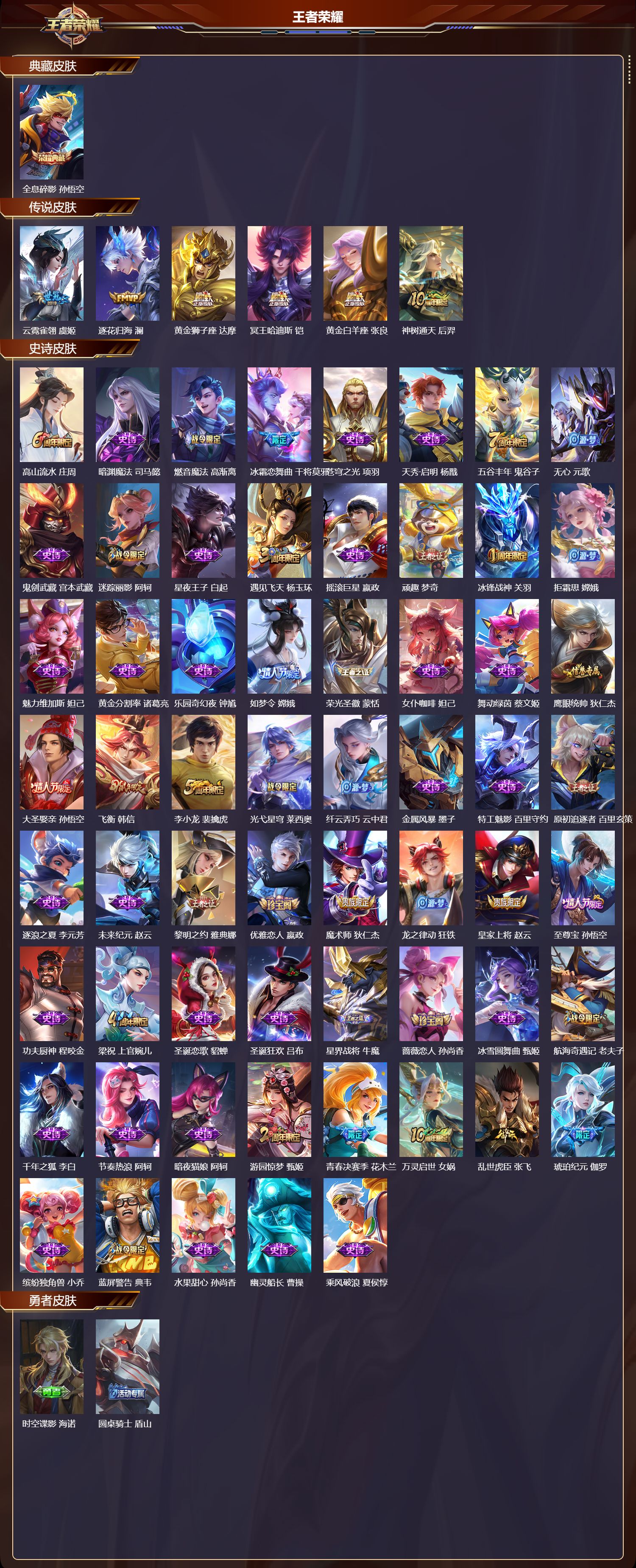 安卓qq/绝世王者/255皮肤/125英雄/1典藏/0珍品无双/0无双/0珍品传说/6传说/61史诗/7稀有英雄【1 典藏皮肤】全息碎影 孙悟空【6 传说皮肤】云霓雀翎 虞姬逐花归海 澜黄金狮子座 达摩冥王哈迪斯 铠黄金白羊座 张良神树通天 后羿【61 史诗皮肤】高山流水 庄周暗渊魔法 司马懿燃音魔法 高渐离冰霜恋舞曲 干将莫邪苍穹之光 项羽天秀·启明