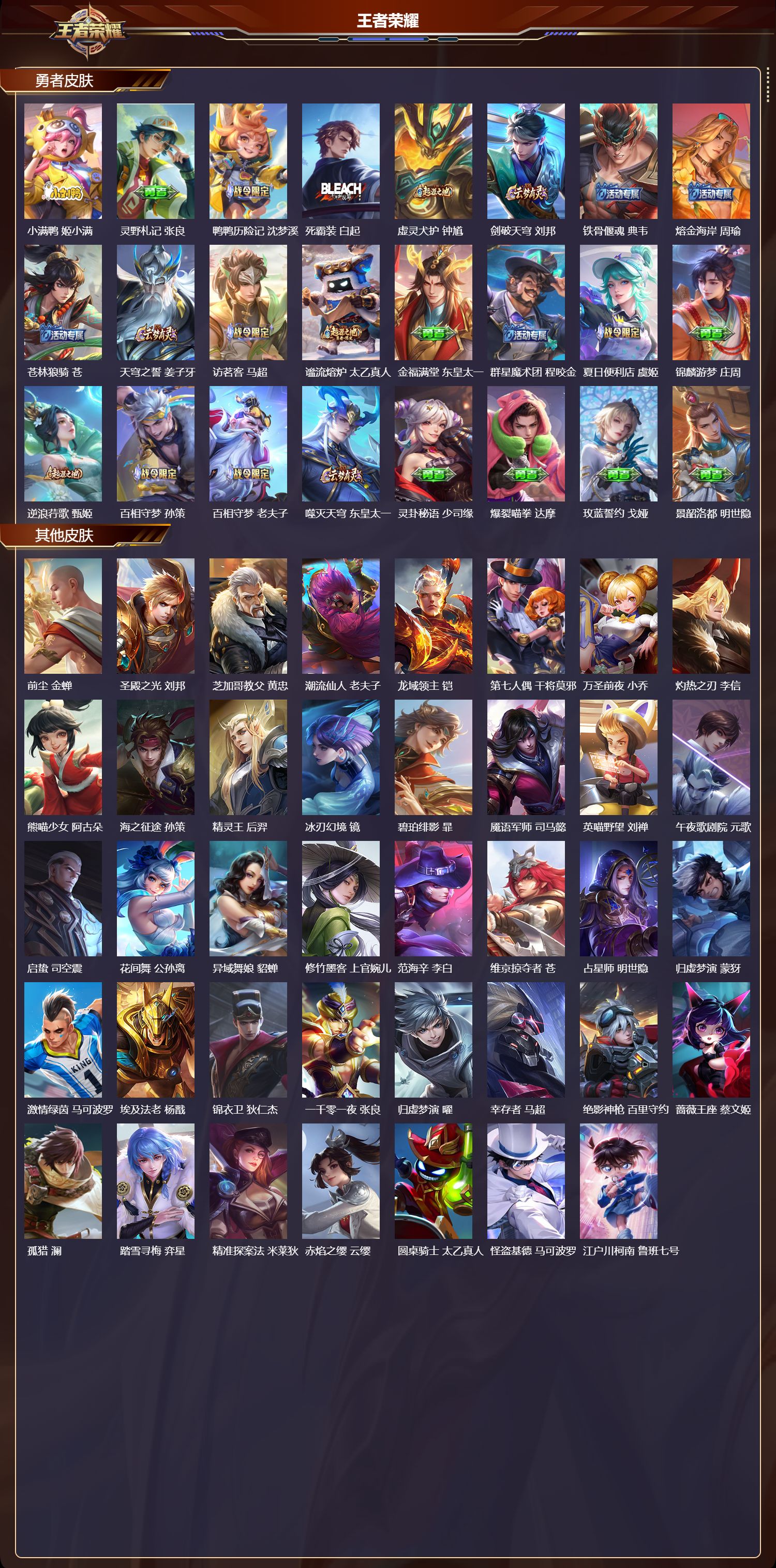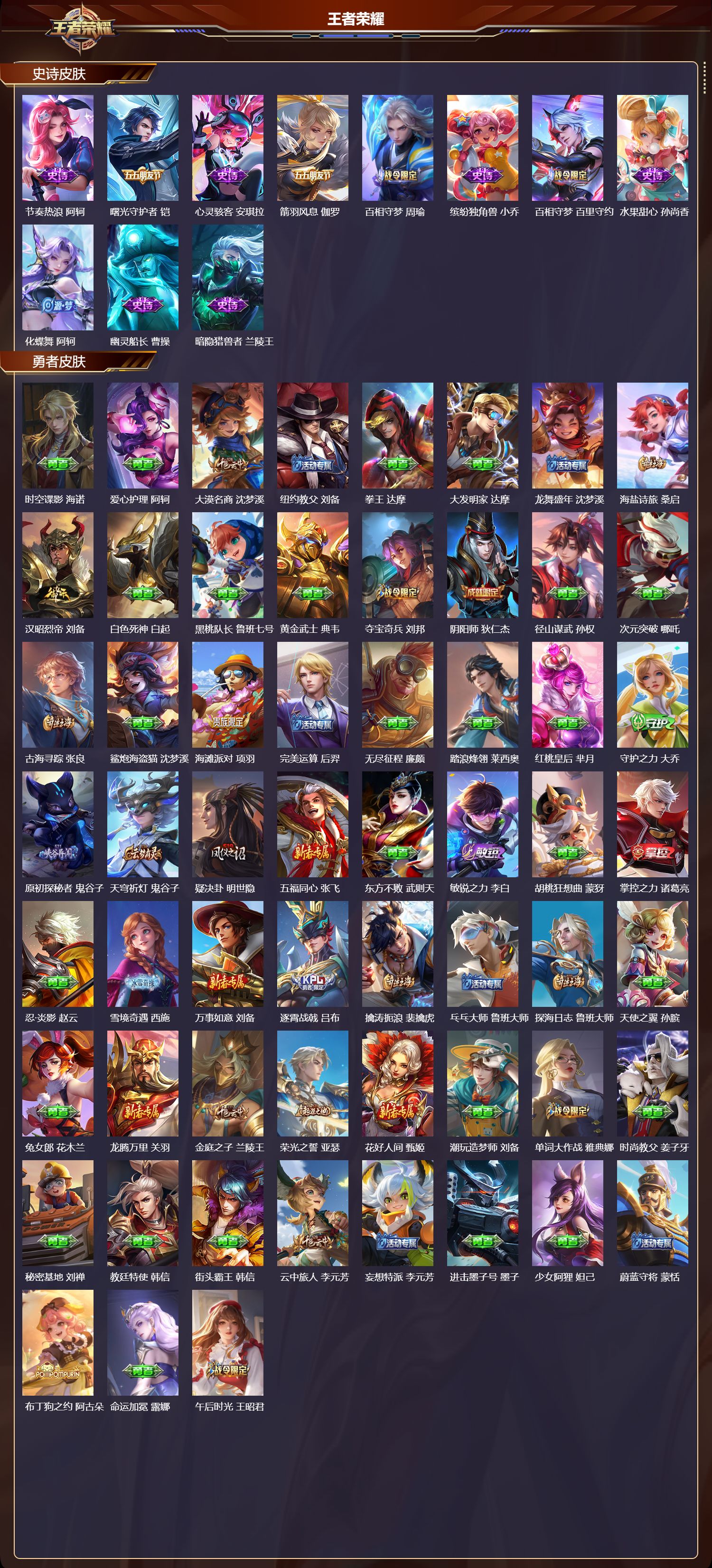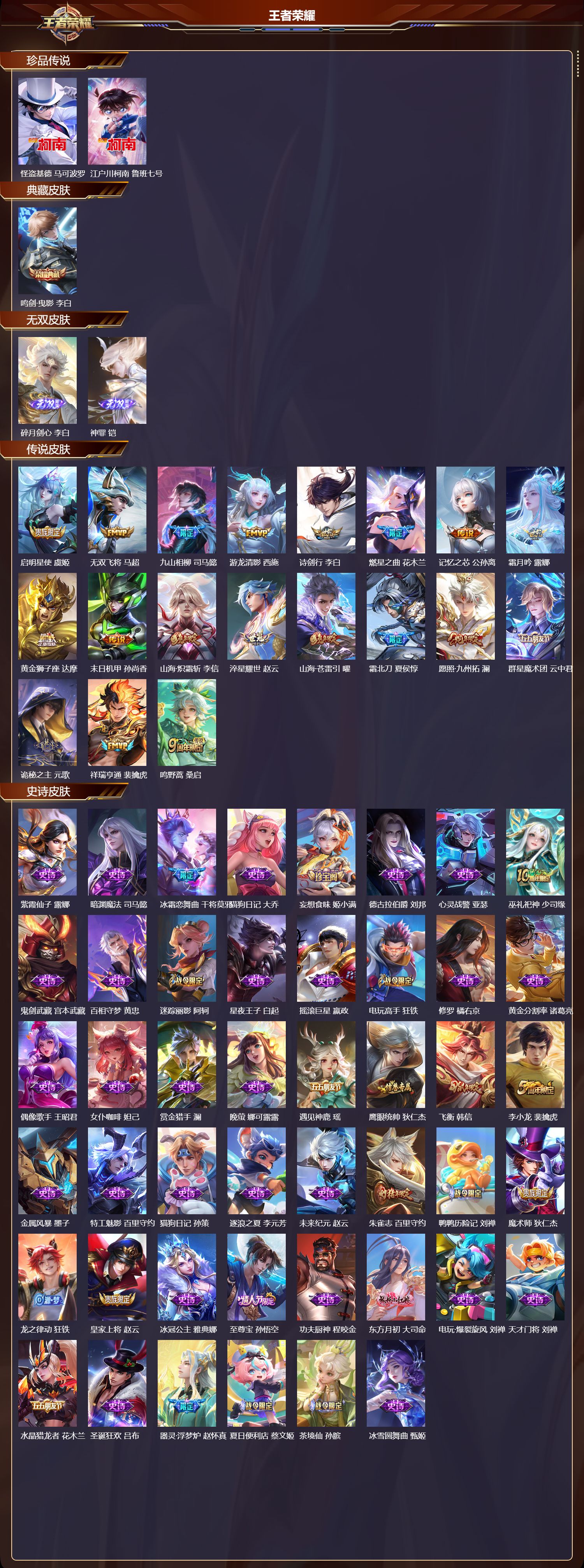 苹果qq/荣耀王者/202皮肤/126英雄/1典藏/0珍品无双/2无双/2珍品传说/19传说/57史诗/8稀有英雄【2 珍品传说】怪盗基德 马可波罗江户川柯南 鲁班七号【1 典藏皮肤】鸣剑·曳影 李白【2 无双皮肤】碎月剑心 李白神罪 铠【19 传说皮肤】启明星使 虞姬无双飞将 马超九山相柳 司马懿游龙清影 西施诗剑行 李白燃星之曲 花木兰记忆之芯 公孙离