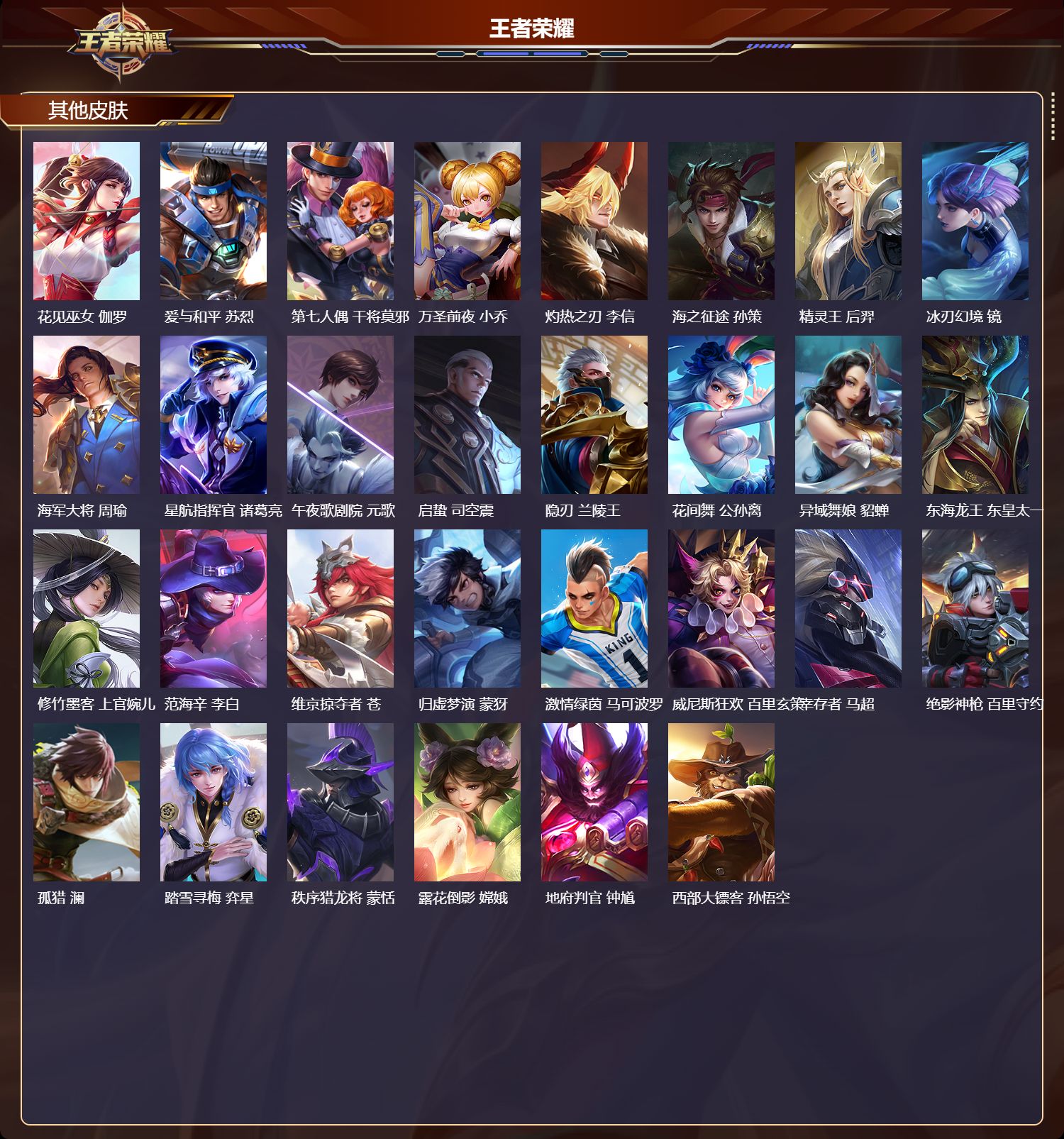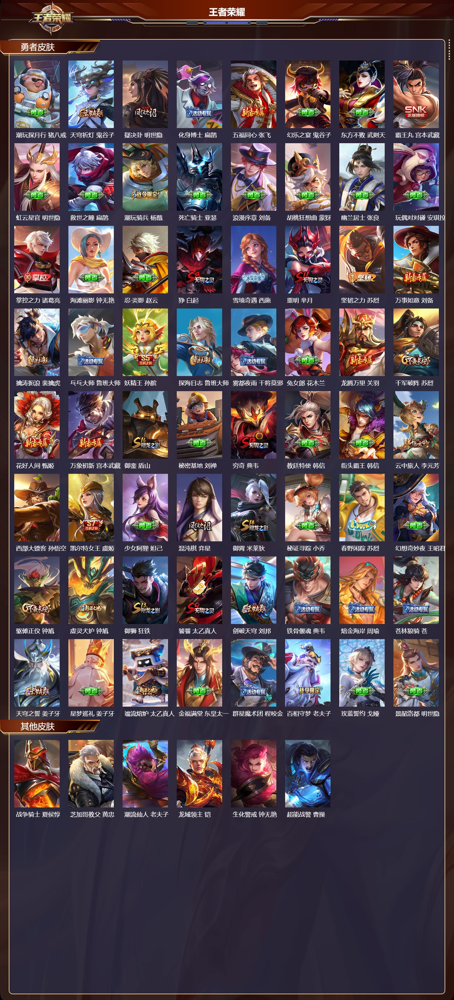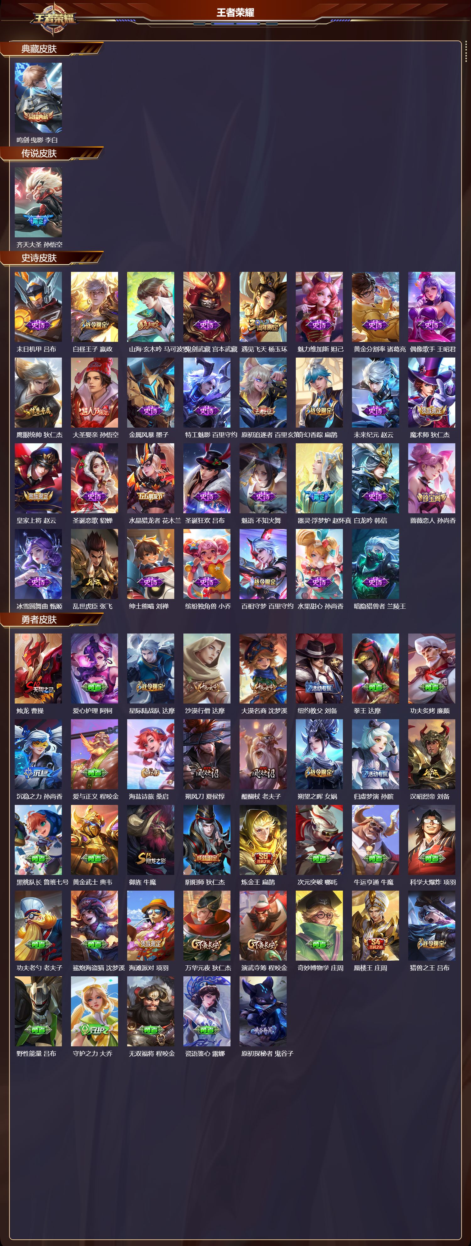 安卓qq/尊贵铂金/169皮肤/124英雄/1典藏/0珍品无双/0无双/0珍品传说/1传说/31史诗/8稀有英雄【1 典藏皮肤】鸣剑·曳影 李白【1 传说皮肤】齐天大圣 孙悟空【31 史诗皮肤】末日机甲 吕布白昼王子 嬴政山海·玄木吟 马可波罗鬼剑武藏 宫本武藏遇见飞天 杨玉环魅力维加斯 妲己黄金分割率 诸葛亮偶像歌手 王昭君鹰眼统帅 狄仁杰大圣娶亲 孙悟