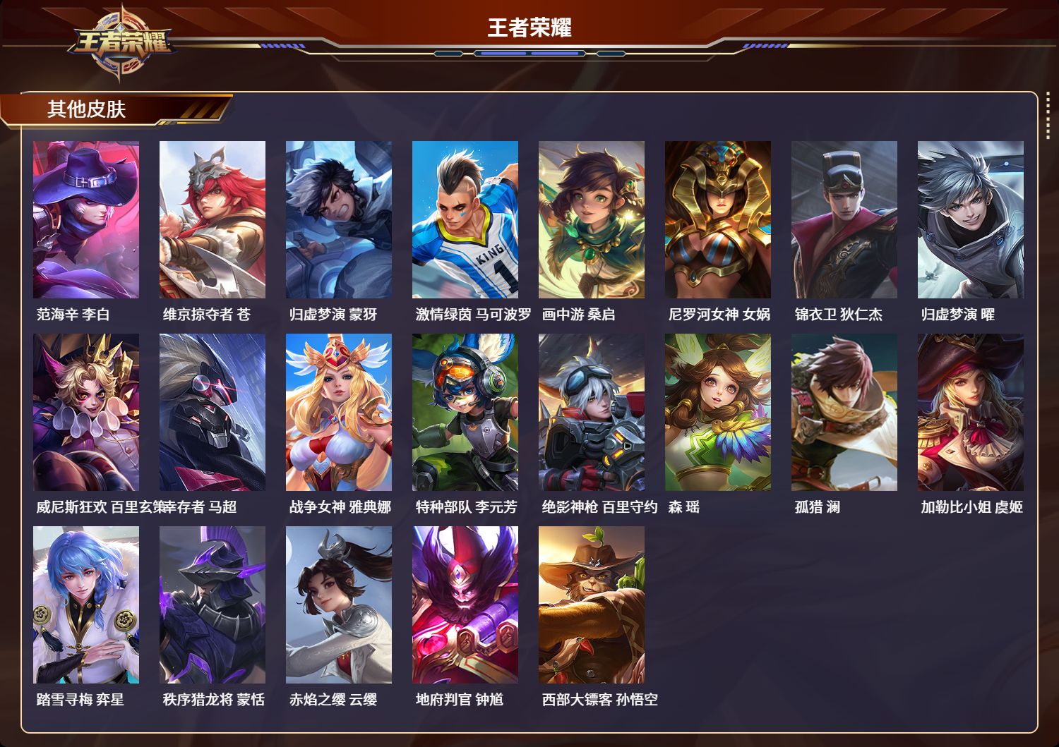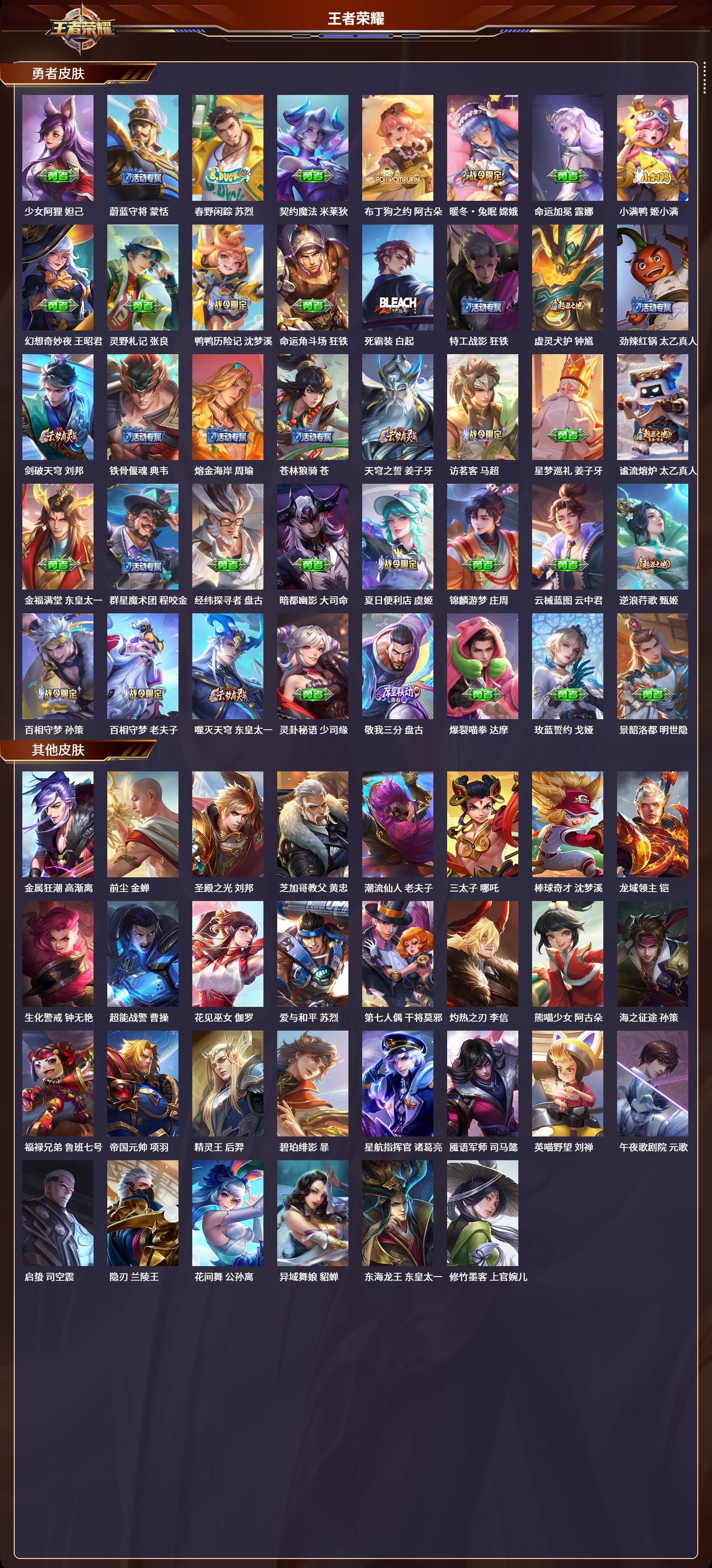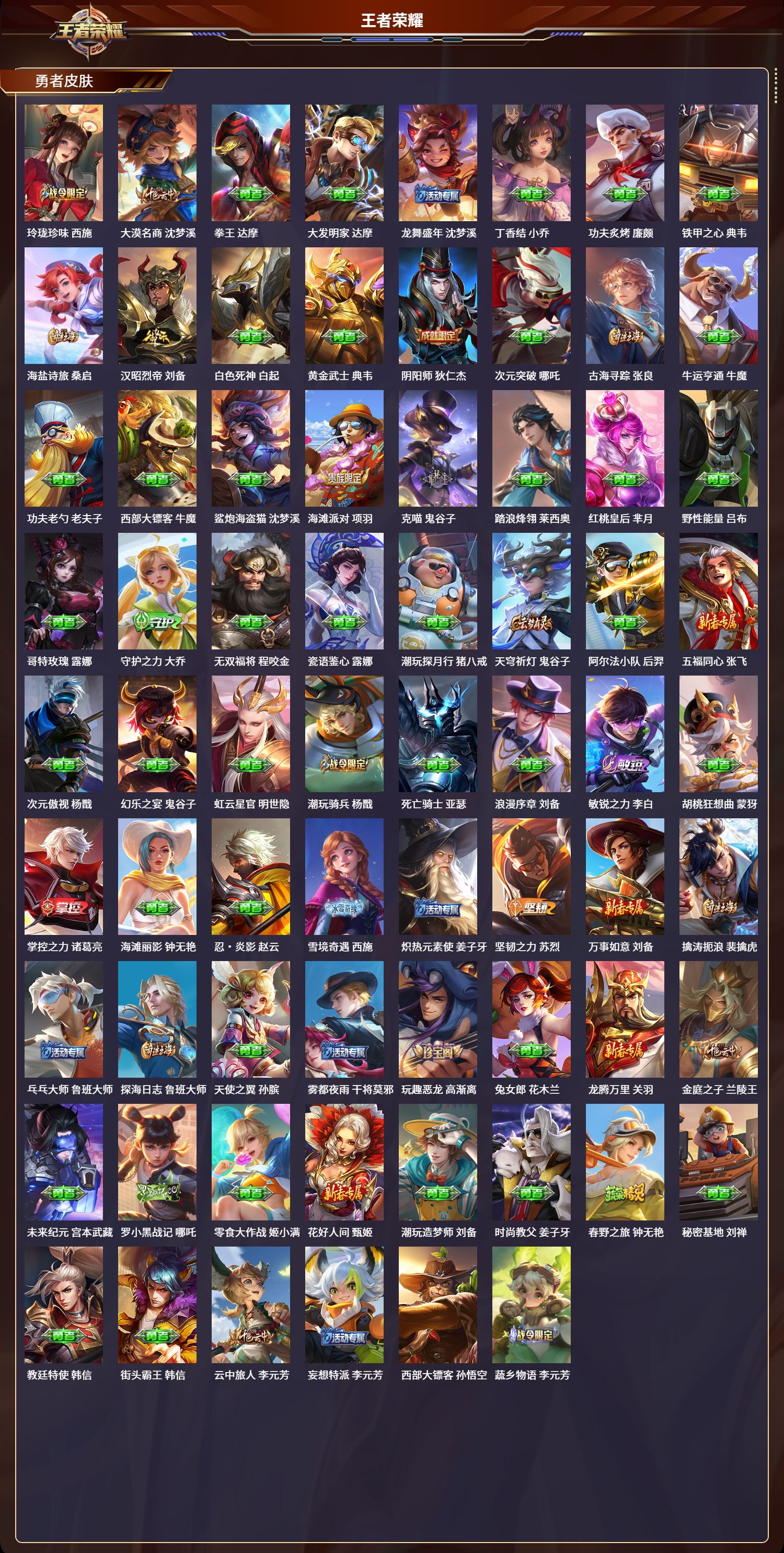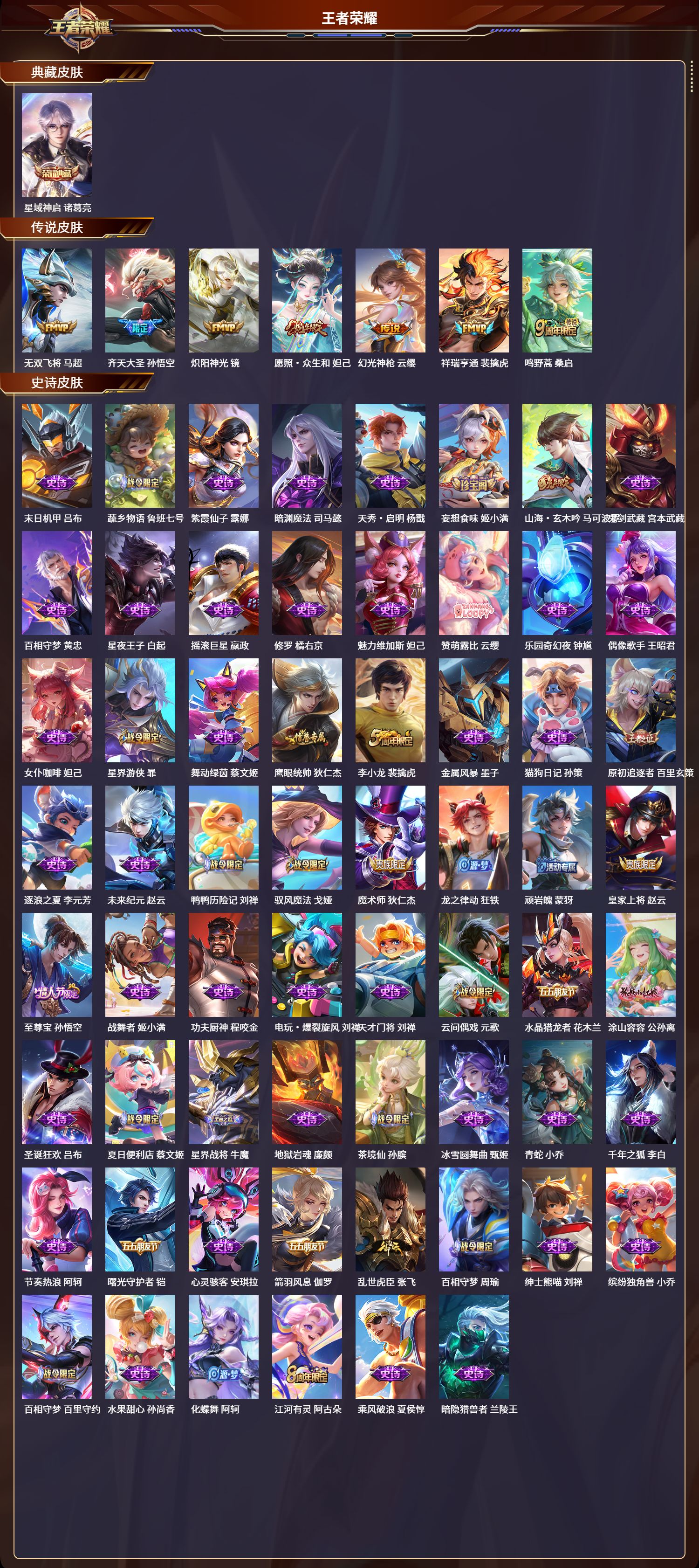安卓qq/最强王者/230皮肤/125英雄/1典藏/0珍品无双/0无双/0珍品传说/7传说/62史诗/8稀有英雄【1 典藏皮肤】星域神启 诸葛亮【7 传说皮肤】无双飞将 马超齐天大圣 孙悟空炽阳神光 镜愿照·众生和 妲己幻光神呛 云缨祥瑞亨通 裴擒虎鸣野蒿 桑启【62 史诗皮肤】末日机甲 吕布蔬乡物语 鲁班七号紫霞仙子 露娜暗渊魔法 司马懿天秀·启明 杨