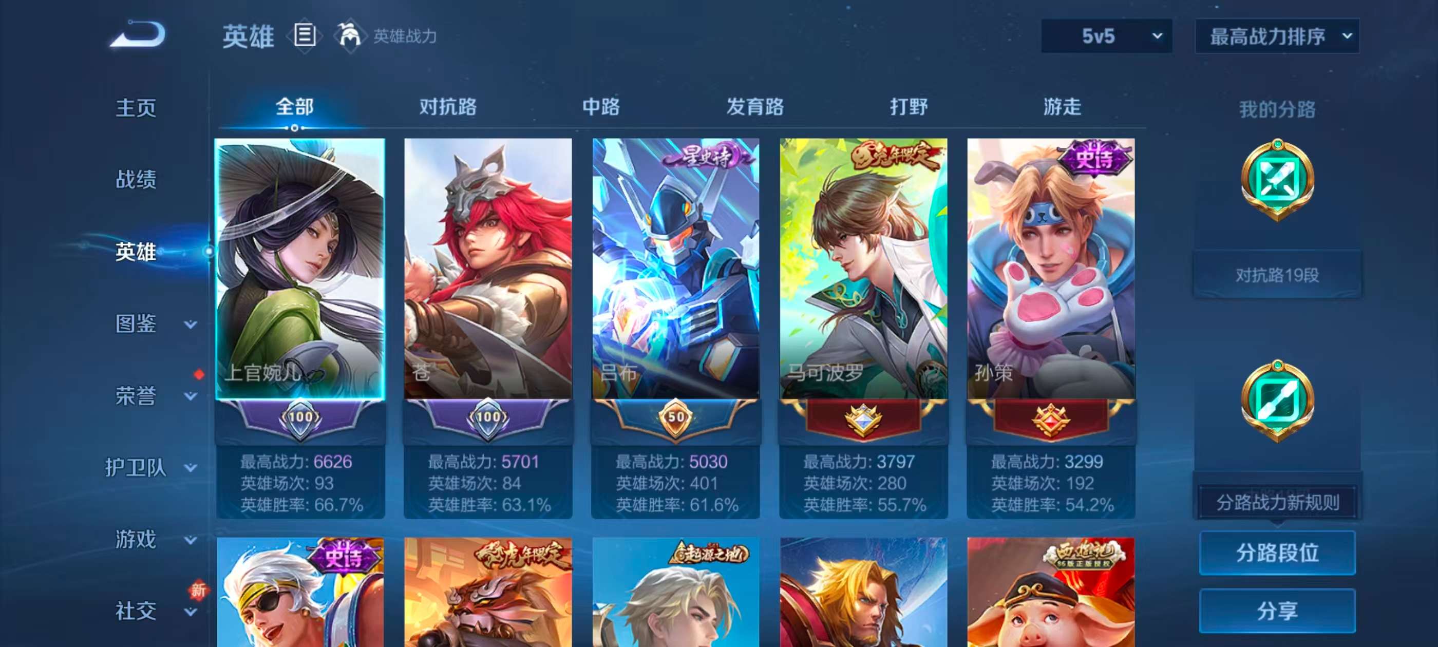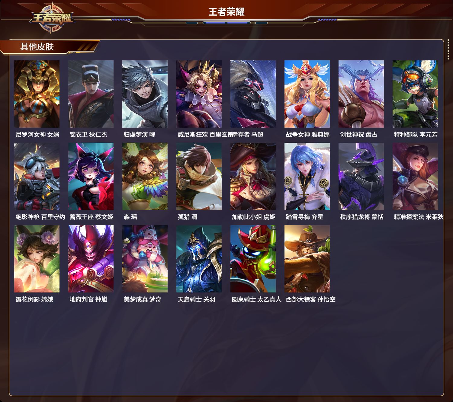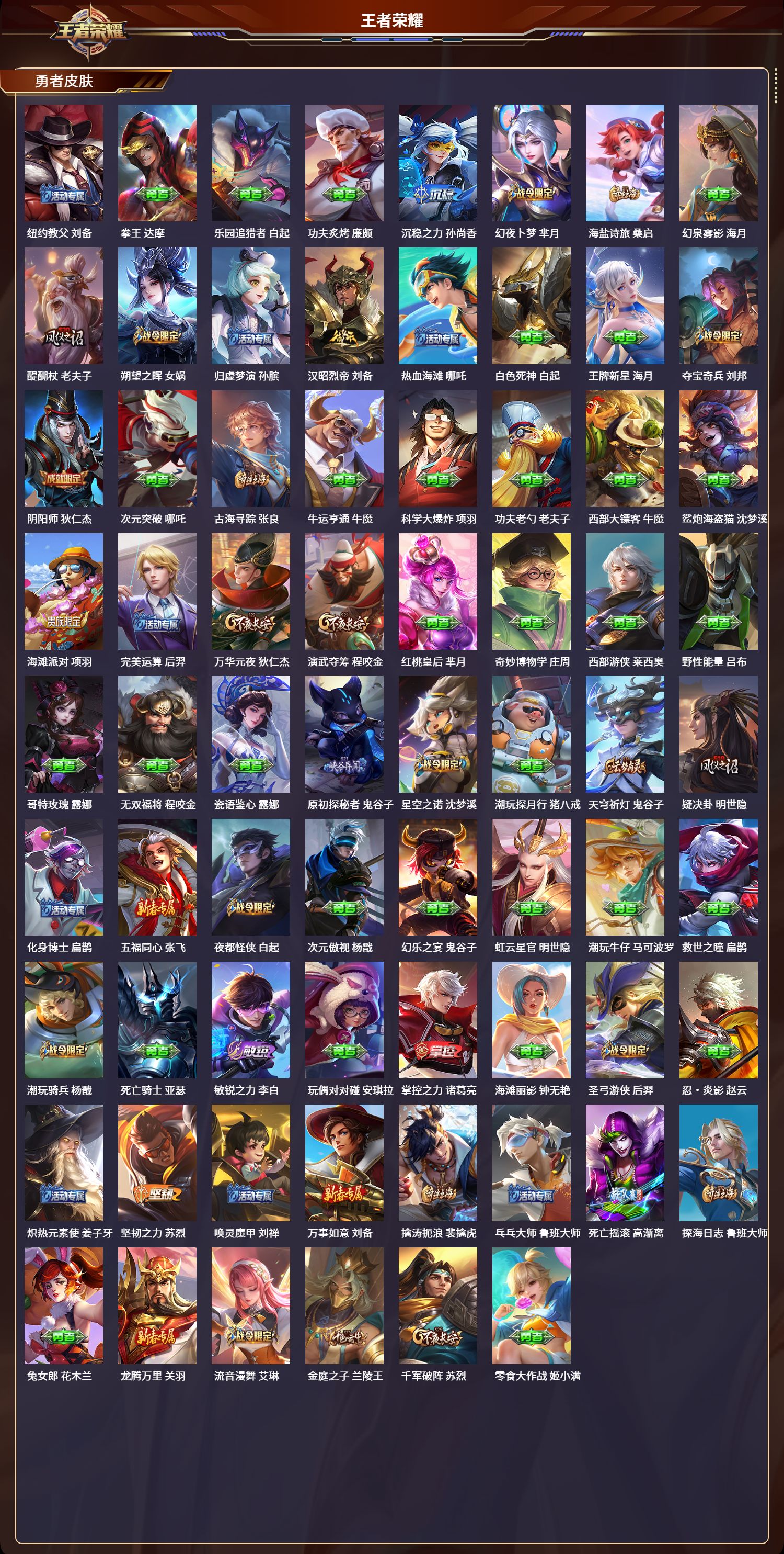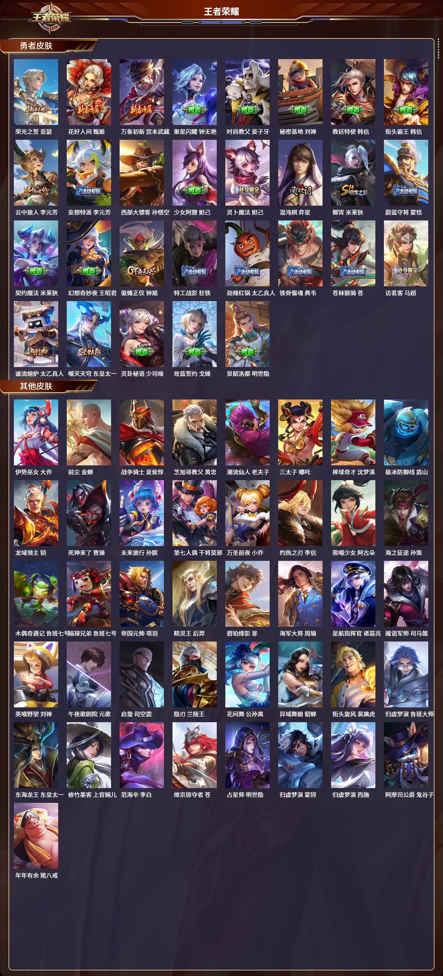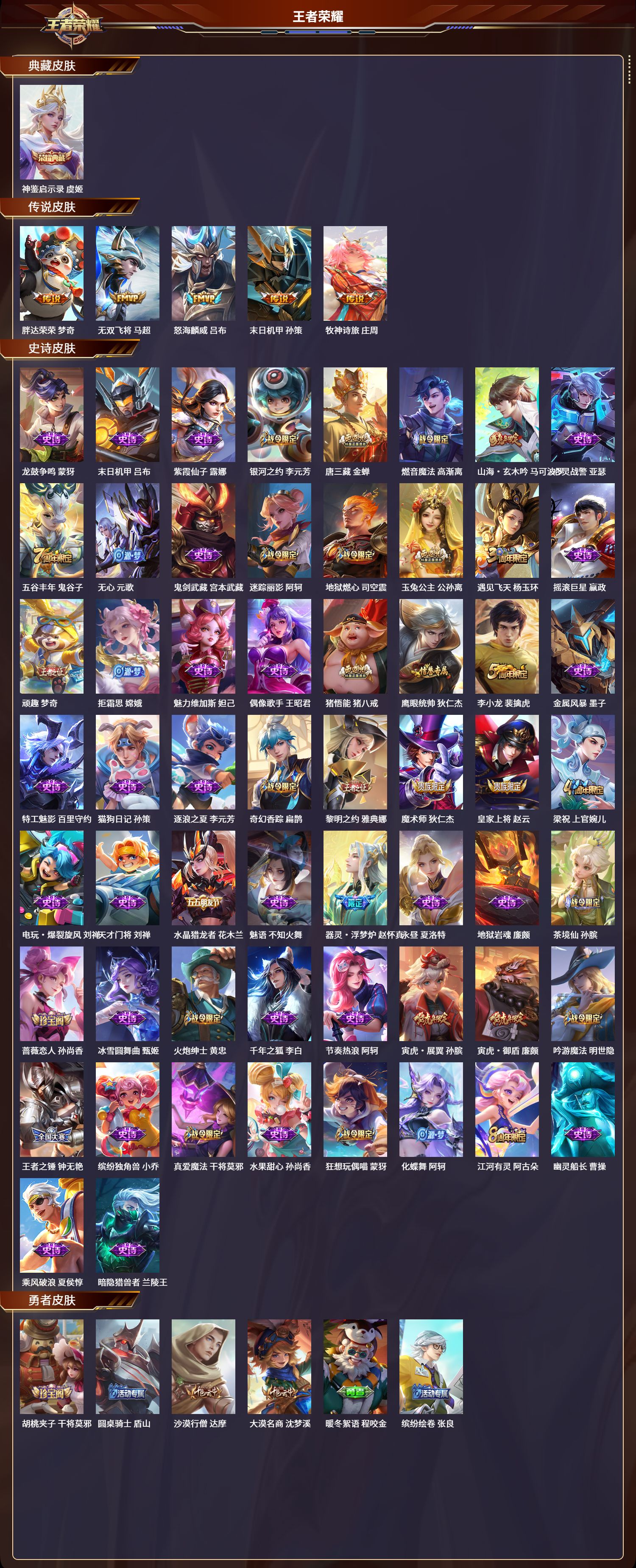 安卓qq/至尊星耀/231皮肤/125英雄/1典藏/0珍品无双/0无双/0珍品传说/5传说/58史诗/7稀有英雄【1 典藏皮肤】神鉴启示录 虞姬【5 传说皮肤】胖达荣荣 梦奇无双飞将 马超怒海麟威 吕布末日机甲 孙策牧神诗旅 庄周【58 史诗皮肤】龙鼓争鸣 蒙犽末日机甲 吕布紫霞仙子 露娜银河之约 李元芳唐三藏 金蝉燃音魔法 高渐离山海·玄木吟 马可波罗