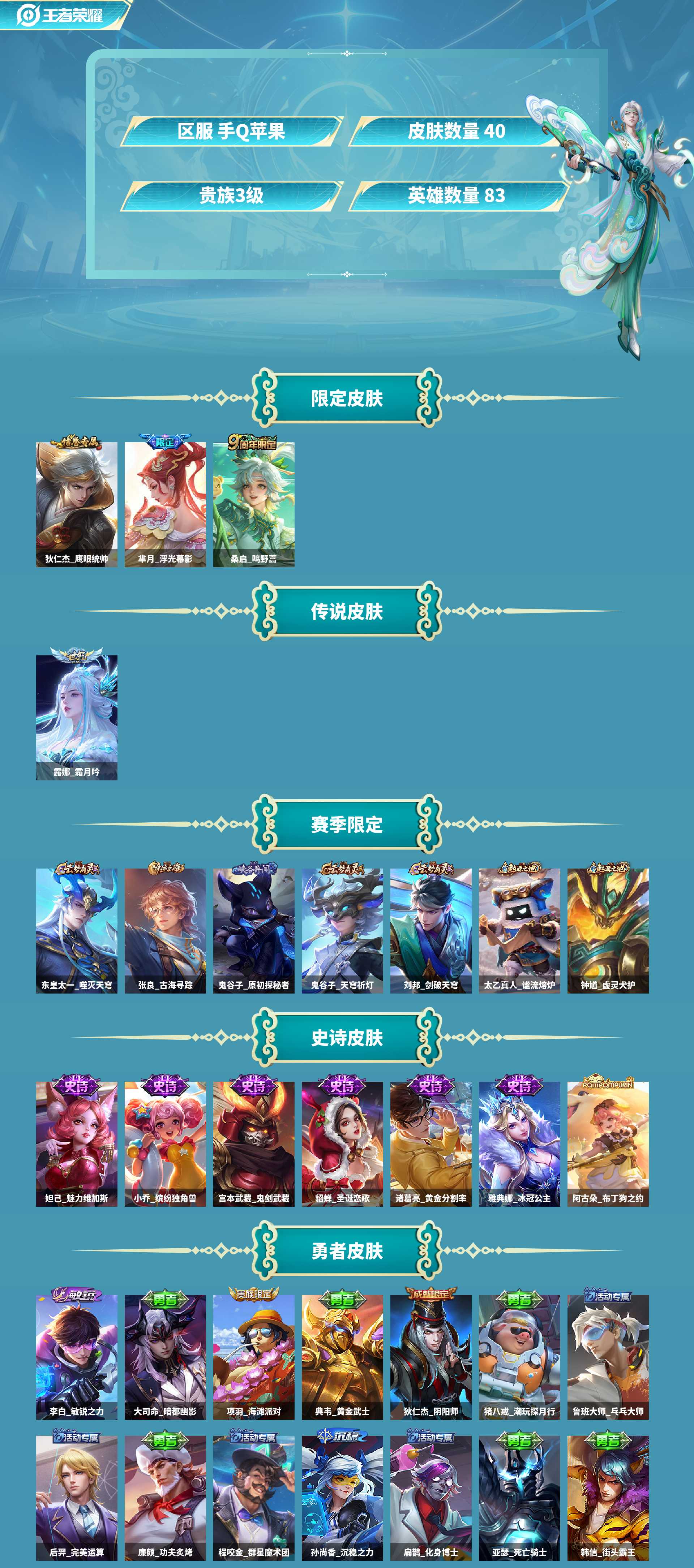 al633345 【特价2传说2个金标】 皮肤数40 皮肤价值24920 无双皮肤数0 传说皮肤数2 珍品传说皮数0 史诗皮肤数8 英雄数83 营地id1681448219 贵族等级【文本】贵族3级 【贵族3级】 【可排位】 【是】 限定皮肤12 赛季限定7 史诗皮肤9 勇者皮肤23 其他皮肤6 限定皮肤:钟馗虚灵犬护,狄仁杰鹰眼统帅,太乙真人谧流熔炉,桑启鸣野蒿,东皇太一噬灭天穹,芈月浮光幕影,刘邦剑破天穹,鬼谷子天穹祈灯,项羽海滩派对,张良古海寻踪,鬼谷子原初探秘者,狄仁杰阴阳师; 赛季限定:钟馗虚灵犬护,太乙真人谧流熔炉,东皇太一噬灭天穹,刘邦剑破天穹,鬼谷子天穹祈灯,张良古海寻踪,鬼谷子原初探秘者; 史诗皮肤:小乔缤纷独角兽,狄仁杰鹰眼统帅,貂蝉圣诞恋歌,雅典娜冰冠公主,芈月浮光幕影,宫本武藏鬼剑武藏,妲己魅力维加斯,诸葛亮黄金分割率,阿古朵_布丁狗之约; 勇者皮肤:钟馗虚灵犬护,典韦铁骨偃魂,廉颇功夫炙烤,猪八戒潮玩探月行,太乙真人谧流熔炉,后羿完美运算,李白敏锐之力,东皇太一噬灭天穹,韩信街头霸王,赵云忍炎影,鲁班大师乓乓大师,孙尚香沉稳之力,大司命暗都幽影,程咬金群星魔术团,典韦黄金武士,刘邦剑破天穹,扁鹊化身博士,鬼谷子天穹祈灯,项羽海滩派对,张良古海寻踪,鬼谷子原初探秘者,狄仁杰阴阳师,亚瑟死亡骑士; 其他皮肤:苍维京掠夺者,雅典娜战争女神,澜孤猎,杨玉环霓裳曲,嫦娥露花倒影,云缨赤焰之缨;