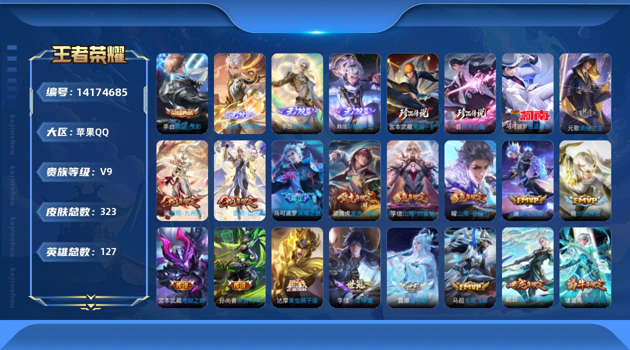 [14174685]怪盗基德天幕 黑崎一护天幕 背包有1荣耀水晶 金标露娜 金标元歌 贵族9-贵族积分143304-323皮1典藏35传说3无双3珍品传说-9个英雄全皮 苹果手q10区323皮1典藏35传说3无双3珍品传说v9 营地id372668735无双王者【珍品传说皮肤】:朽木白哉黑崎一护怪盗基德【无双皮肤】:器灵·螭龙剑群星魔术团碎月剑心【荣耀典藏】: