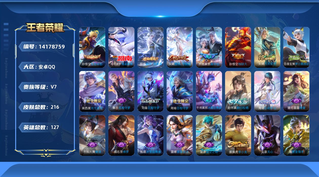 [14178759]贵族7-贵族积分31110-216皮1典藏4传说0无双2珍品传说-1英雄全皮肤 安卓手q337区216皮1典藏4传说0无双2珍品传说v7 营地id1874472655传奇王者【珍品传说皮肤】:器灵·落星盏怪盗基德【荣耀典藏】:全息碎影【传说皮肤】:神树通天地狱火愿照·千秋盛画中仙【史诗皮肤】:光弋星穹罗小黑战记暗渊魔法蔷薇恋人原初追逐者万灵启世乱世虎臣百