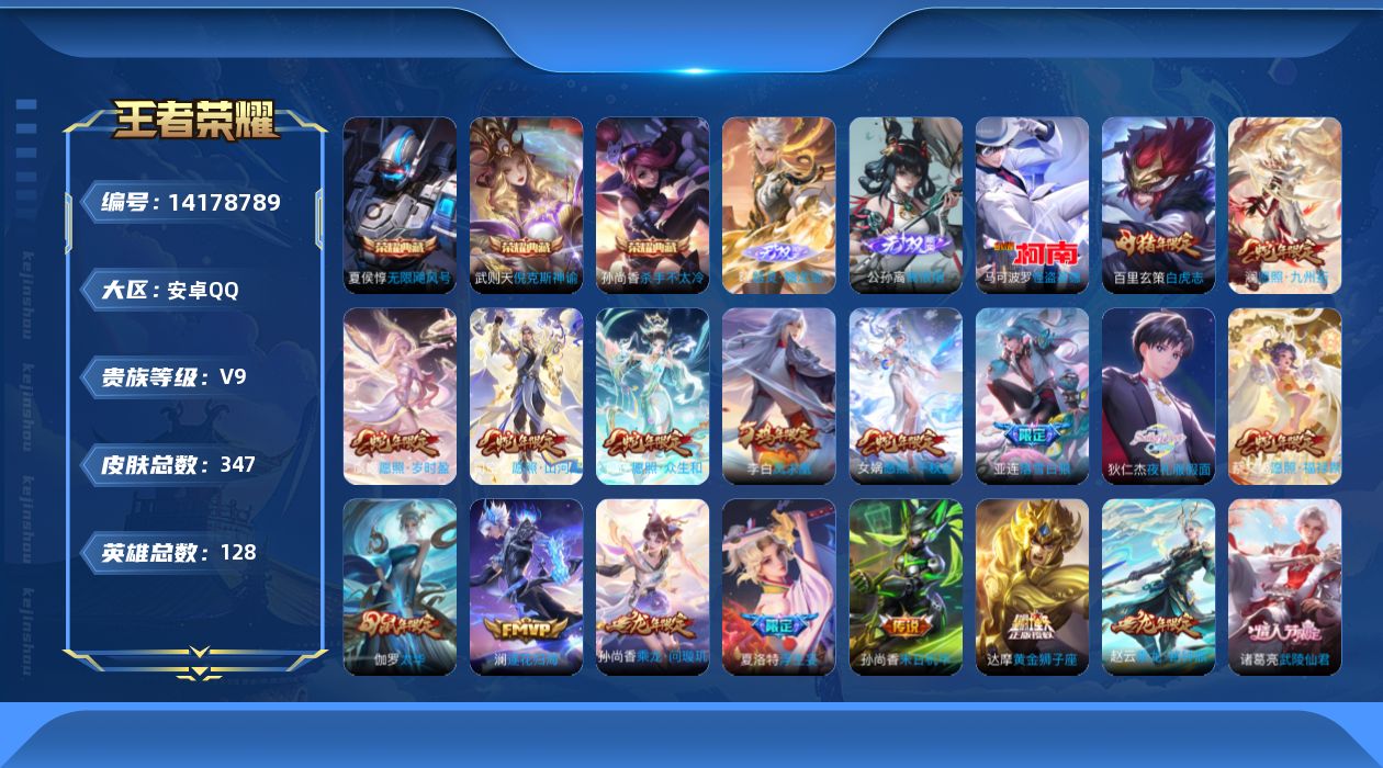 [14178789]皇冠号 贵族9-贵族积分158700-347皮3典藏34传说2无双1珍品传说-2英雄全皮肤 安卓手q178区347皮3典藏34传说2无双1珍品传说v9 营地id77205363绝世王者【珍品传说皮肤】:怪盗基德【无双皮肤】:器灵·螭龙剑离恨烟【荣耀典藏】:倪克斯神谕无限飓风号杀手不太冷【优质限定皮肤】:至尊宝凤求凰白虎志【传说皮肤】:神树通天久胜战神幻光神呛愿