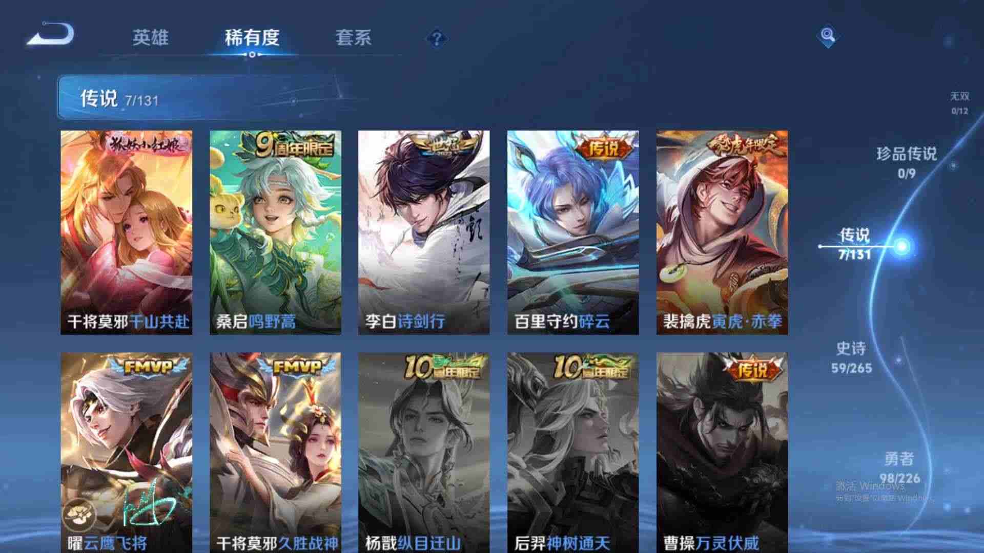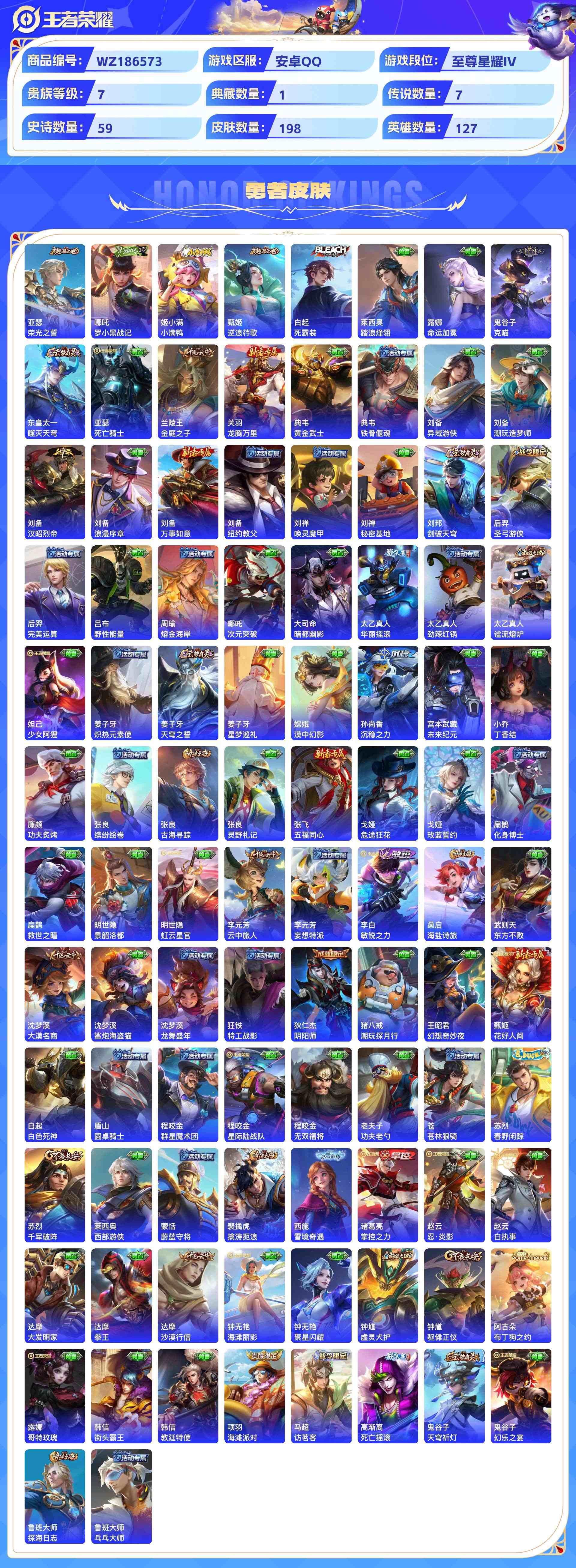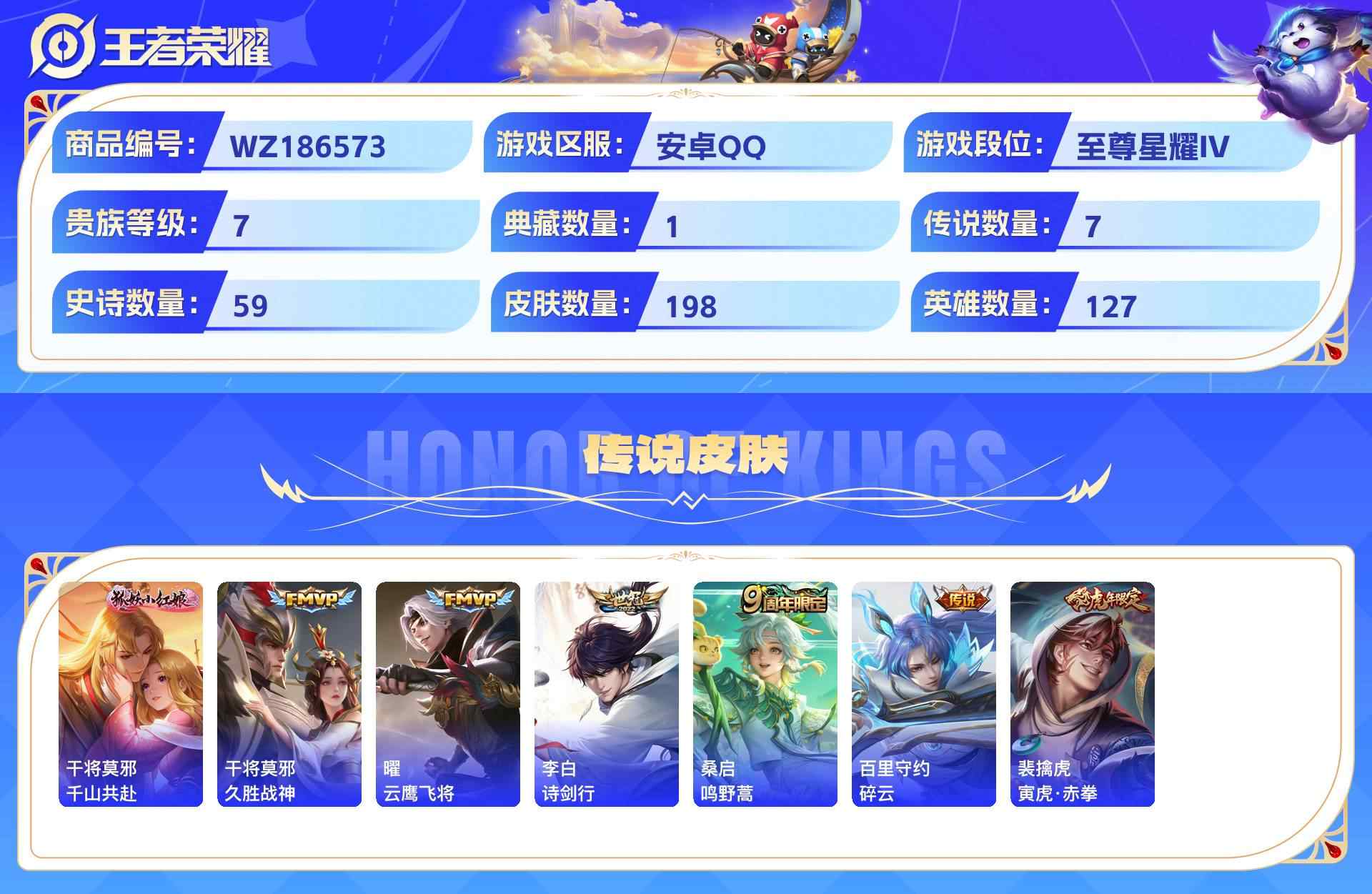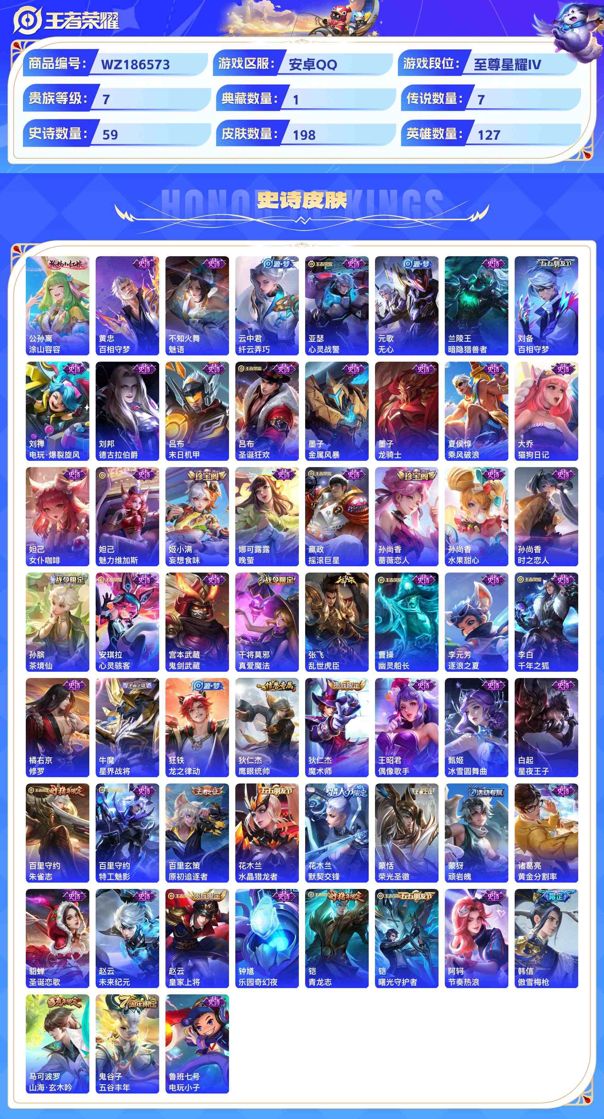 wz186573|精品号可二次安卓qq 贵族7级 198皮 1典藏(全息碎影) 7传说 (千山共赴久胜战神云鹰飞将诗剑行鸣野蒿碎云寅虎·赤拳)59史诗1星传说5个性按键1天幕