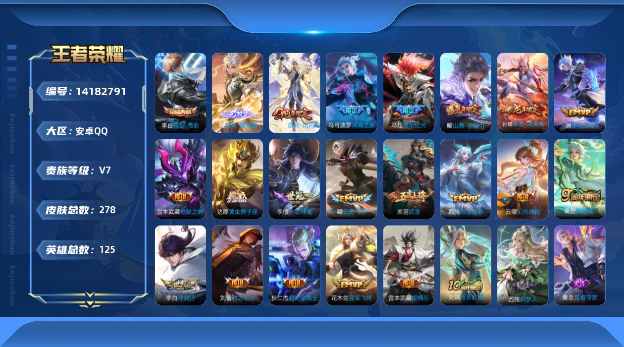 [14182791]贵族7-总皮278-1典藏-20传说-1无双-0珍品传说-0珍品无双-改名卡8-全皮5-时之思念 幽冥之眼 星际治安官 可二次 安卓手q434区278皮1典藏20传说1无双v7 营地id1768600629荣耀王者【无双皮肤】:器灵·螭龙剑【荣耀典藏】:鸣剑·曳影【优质限定皮肤】:至尊宝武圣山海·苍雷引【传说皮肤】:神树通天黄金狮子座超时空战士愿照·山河定幻光神呛
