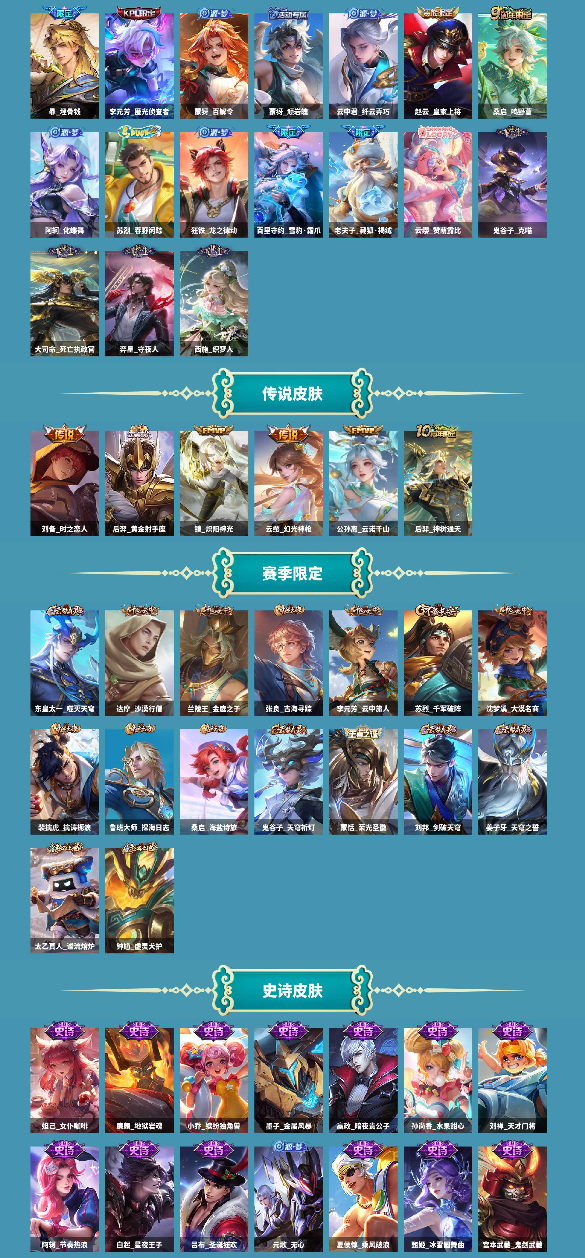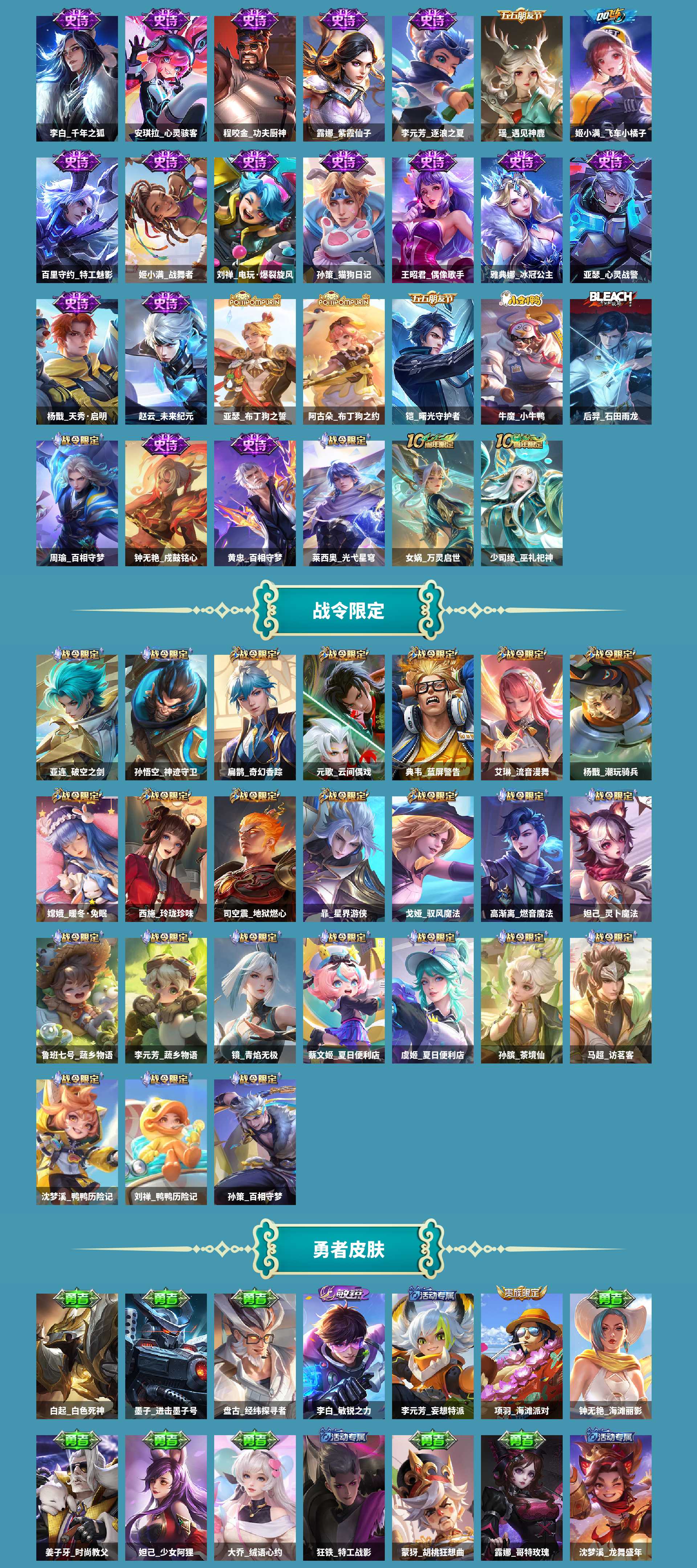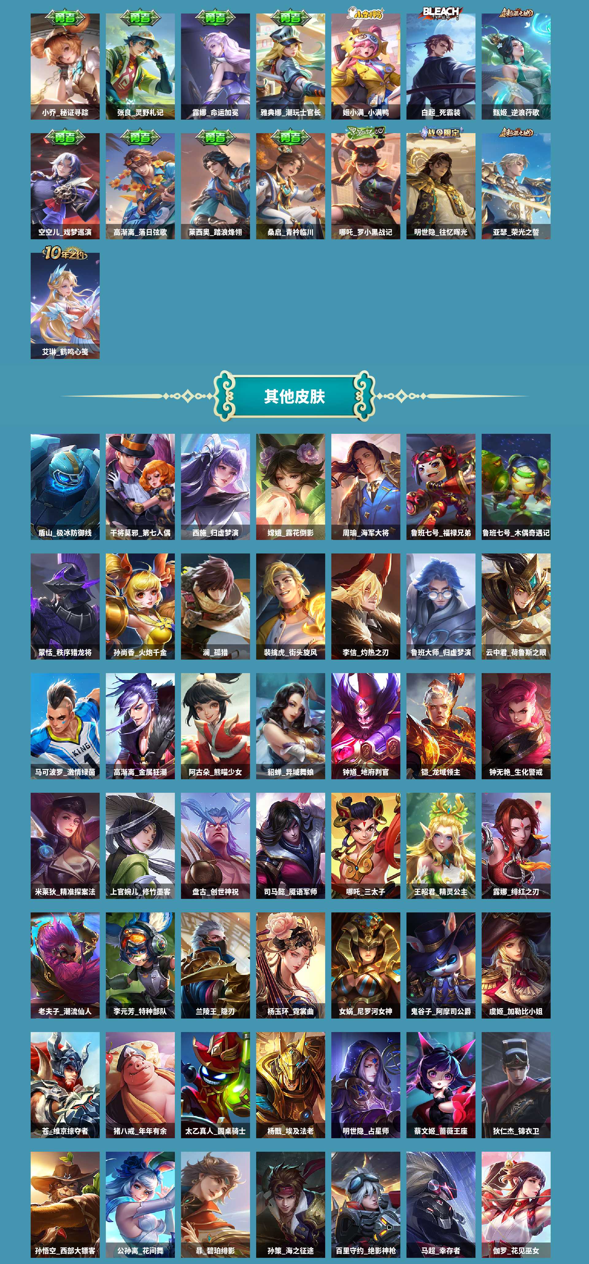 al632563 【极品账号5珍品传说10传说295皮肤】 皮肤数295 皮肤价值198752 传说皮肤数10 珍品传说皮数5 史诗皮肤数77 英雄数127 营地id1790204609 贵族等级【文本】贵族7级 【贵族7级】 【可排位】 【是】 星元皮肤1 荣耀典藏1 珍品传说5 内测皮肤2 年限皮肤4 限定皮肤83 赛季限定18 史诗皮肤76 战令限定27 勇者皮肤134 其他皮肤66 星元皮肤:鲁班七号寅虎焰心; 荣耀典藏:韩信弑呛猎影; 珍品传说:宫本武藏黑崎一护,暃朽木白哉,安琪拉酷洛米之心,瑶大耳狗之梦,张飞兔狲蓬尾; 内测皮肤:弈星万物之道,艾琳女武神; 年限皮肤:杨玉环寅虎心曲,虞姬愿照岁时盈,安琪拉乘龙聚宝船,澜愿照九州拓; 限定皮肤:少司缘巫礼祀神,元歌云间偶戏,西施织梦人,镜青焰无极,鬼谷子克喵,大司命死亡执政官,弈星守夜人,云缨赞萌露比,宫本武藏黑崎一护,杨玉环寅虎心曲,暃朽木白哉,后羿石田雨龙,白起死霸装,姬小满小满鸭,牛魔小牛鸭,安琪拉酷洛米之心,瑶大耳狗之梦,狄仁杰鹰眼统帅,弈星万物之道,亚瑟布丁狗之誓,虞姬愿照岁时盈,张飞兔狲蓬尾,桑启海盐诗旅,阿古朵江河有灵,蒙恬荣光圣徽,蒙犽顽岩魄,蔡文姬夏日便利店,孙膑茶境仙,戈娅驭风魔法,元歌无心,嫦娥拒霜思,百里玄策超元猎域,暃埋骨钱,老夫子_藏狐·褐绒,百里守约雪豹霜爪,大乔白鹤梁神女,阿轲化蝶舞,鬼谷子五谷丰年,司空震地狱燃心,狄仁杰魔术师,扁鹊奇幻香踪,高渐离燃音魔法,亚连破空之剑,狂铁龙之律动,暃星界游侠,赵云皇家上将,鲁班七号蔬乡物语,典韦蓝屏警告,云中君纤云弄巧,李元芳匿光侦查者,蒙犽百解令,东皇太一噬灭天穹,太乙真人谧流熔炉,刘邦剑破天穹,沈梦溪龙舞盛年,鬼谷子天穹祈灯,狄仁杰阴阳师,达摩沙漠行僧,桑启鸣野蒿,沈梦溪大漠名商,鲁班大师探海日志,张良古海寻踪,苏烈春野闲踪,妲己灵卜魔法,艾琳流音漫舞,艾琳女武神,李元芳蔬乡物语,李元芳云中旅人,马超访茗客,项羽海滩派对,杨戬潮玩骑兵,苏烈千军破阵,安琪拉乘龙聚宝船,姜子牙天穹之誓,嫦娥暖冬兔眠,裴擒虎擒涛扼浪,兰陵王金庭之子,虞姬夏日便利店,盘古敬我三分,钟馗虚灵犬护,西施玲珑珍味,孙悟空神迹守卫,澜愿照九州拓; 赛季限定:亚瑟荣光之誓,甄姬逆浪荇歌,桑启海盐诗旅,蒙恬荣光圣徽,东皇太一噬灭天穹,太乙真人谧流熔炉,刘邦剑破天穹,鬼谷子天穹祈灯,达摩沙漠行僧,沈梦溪大漠名商,鲁班大师探海日志,张良古海寻踪,李元芳云中旅人,苏烈千军破阵,姜子牙天穹之誓,裴擒虎擒涛扼浪,兰陵王金庭之子,钟馗虚灵犬护; 史诗皮肤:嬴政暗夜贵公子,露娜紫霞仙子,少司缘巫礼祀神,女娲万灵启世,莱西奥光弋星穹,元歌云间偶戏,西施织梦人,镜青焰无极,黄忠百相守梦,吕布圣诞狂欢,云缨赞萌露比,姬小满飞车小橘子,杨玉环寅虎心曲,钟无艳戍鼓铭心,周瑜百相守梦,后羿石田雨龙,牛魔小牛鸭,杨戬天秀启明,狄仁杰鹰眼统帅,弈星万物之道,阿古朵_布丁狗之约,亚瑟布丁狗之誓,孙策猫狗日记,阿古朵江河有灵,蒙恬荣光圣徽,蒙犽顽岩魄,蔡文姬夏日便利店,孙膑茶境仙,雅典娜冰冠公主,戈娅驭风魔法,宫本武藏鬼剑武藏,刘禅电玩爆裂旋风,刘禅天才门将,亚瑟心灵战警,程咬金功夫厨神,廉颇地狱岩魂,甄姬冰雪圆舞曲,元歌无心,嫦娥拒霜思,百里玄策超元猎域,姬小满战舞者,暃埋骨钱,墨子金属风暴,小乔缤纷独角兽,赵云未来纪元,铠曙光守护者,百里守约雪豹霜爪,百里守约特工魅影,妲己女仆咖啡,大乔白鹤梁神女,阿轲化蝶舞,鬼谷子五谷丰年,司空震地狱燃心,狄仁杰魔术师,刘禅鸭鸭历险记,扁鹊奇