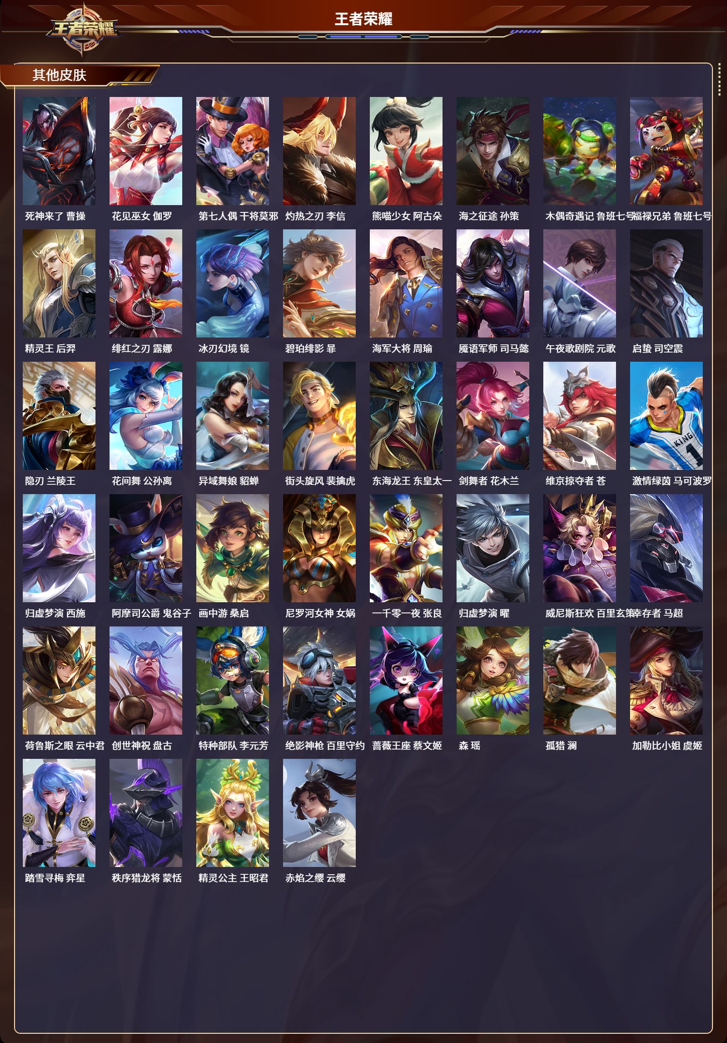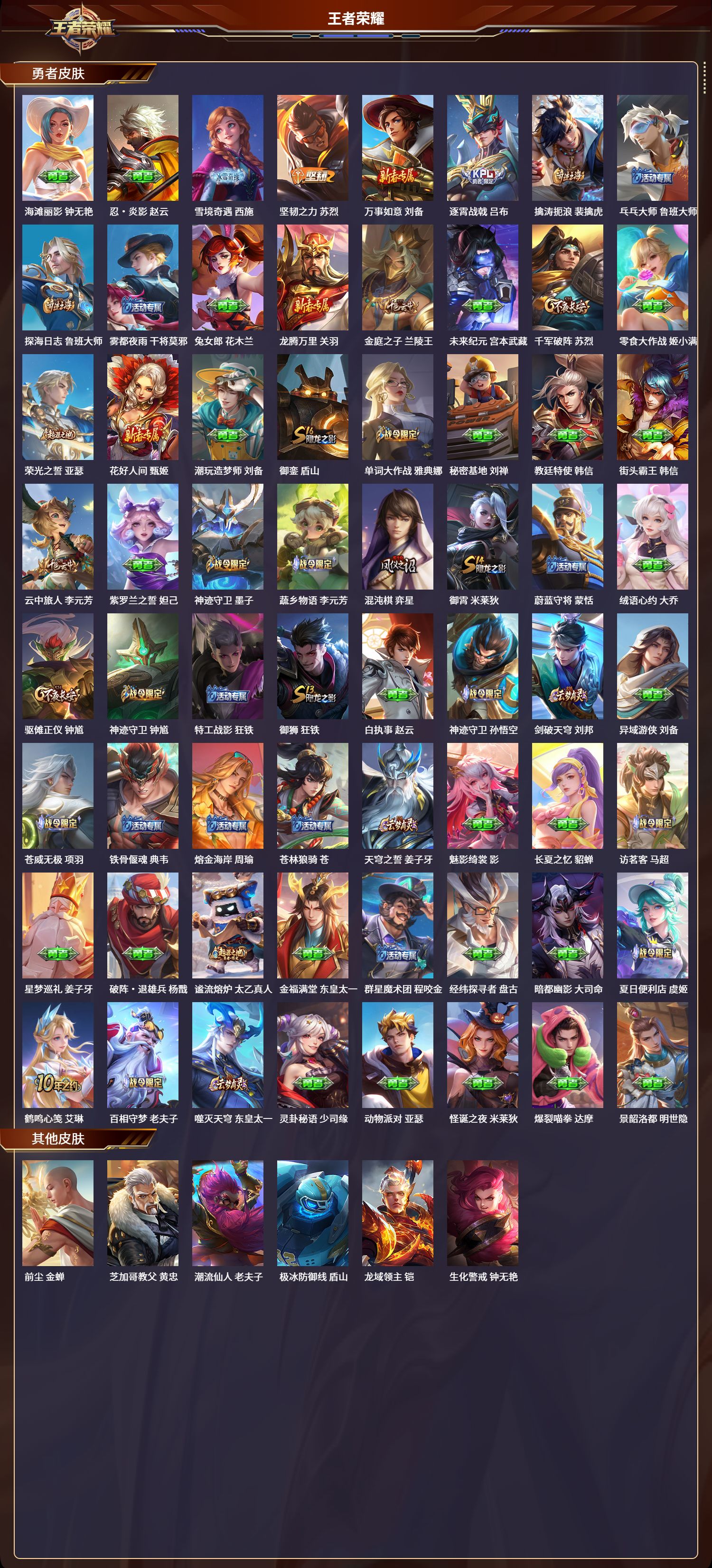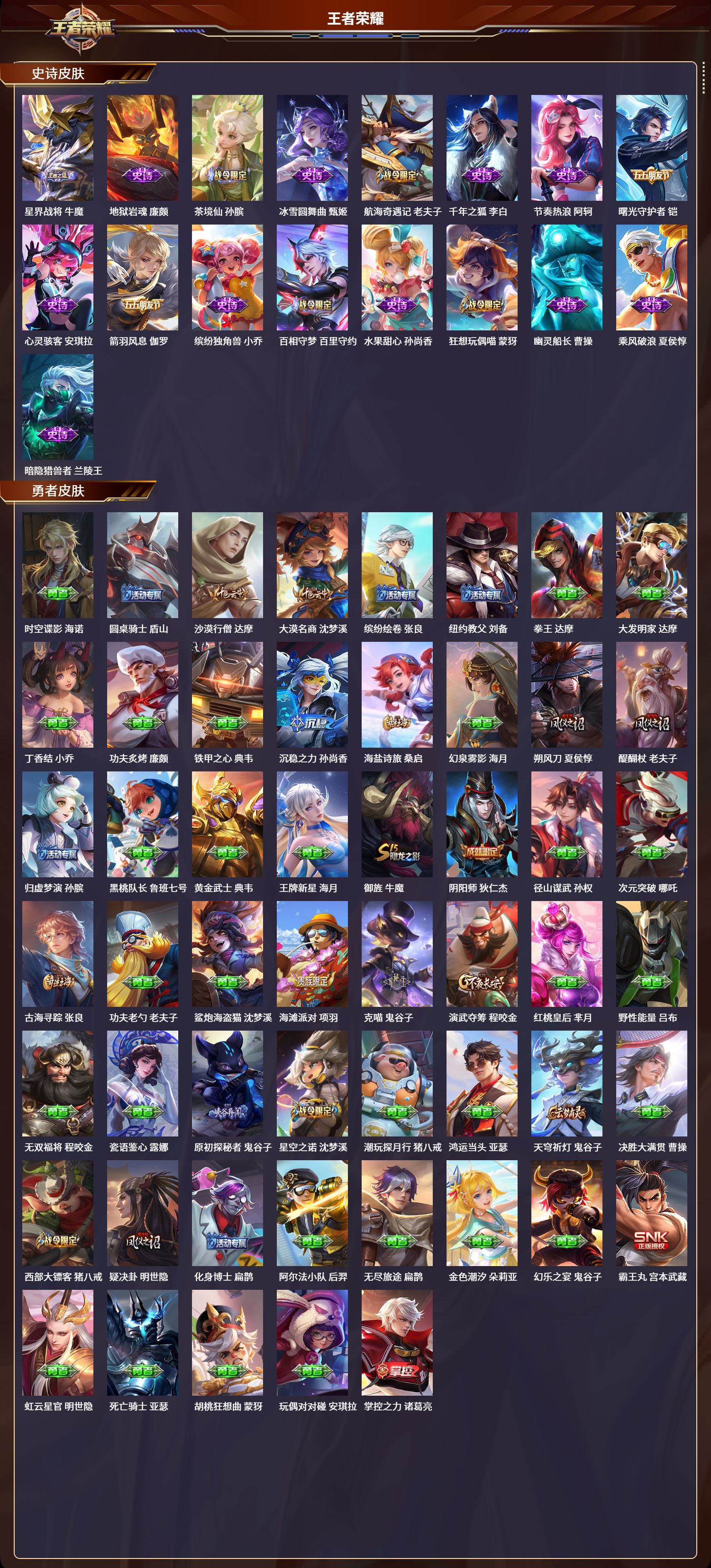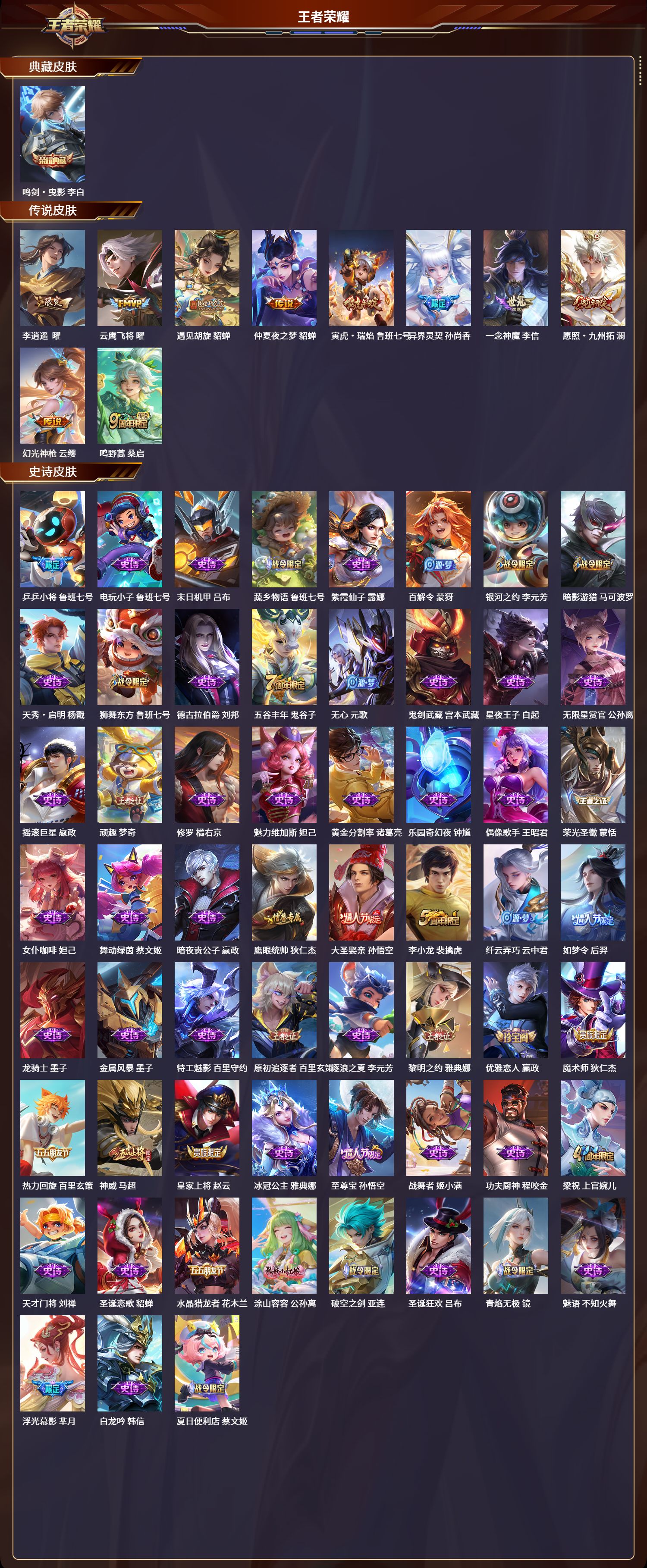 安卓qq/至尊星耀/256皮肤/127英雄/1典藏/0珍品无双/0无双/0珍品传说/10传说/76史诗/9稀有英雄【1 典藏皮肤】鸣剑·曳影 李白【10 传说皮肤】李 曜云鹰飞将 曜遇见胡旋 貂蝉仲夏夜之梦 貂蝉寅虎·瑞焰 鲁班七号异界灵契 孙尚香一念神魔 李信愿照·九州拓 澜幻光神呛 云缨鸣野蒿 桑启【76 史诗皮肤】乒乒小将 鲁班七号电玩小子 鲁班七号末日机甲