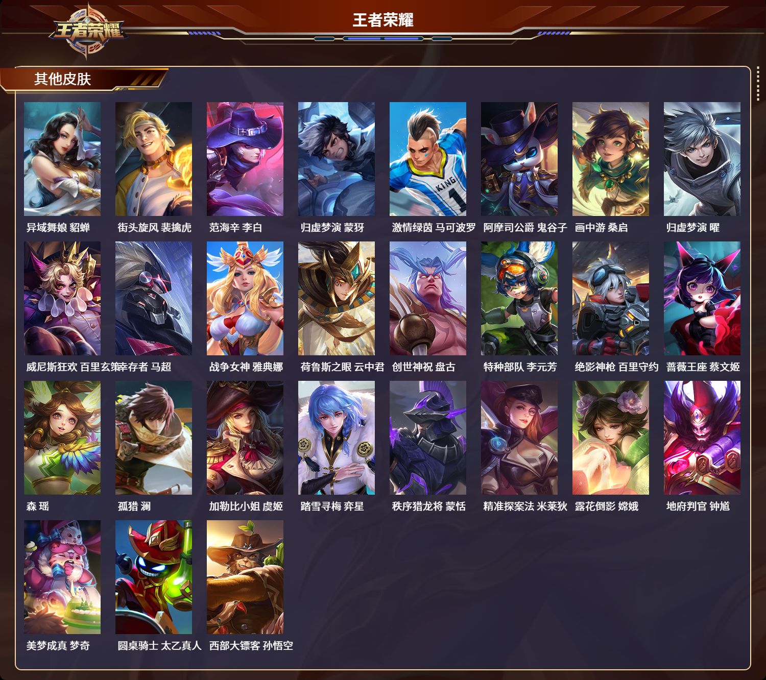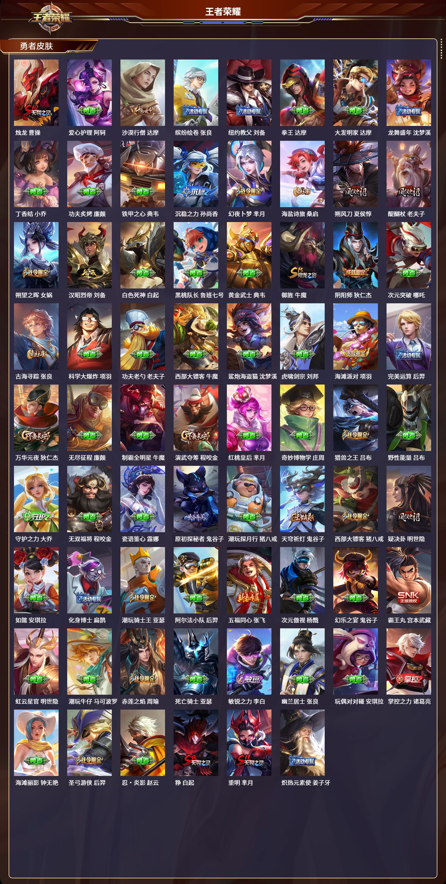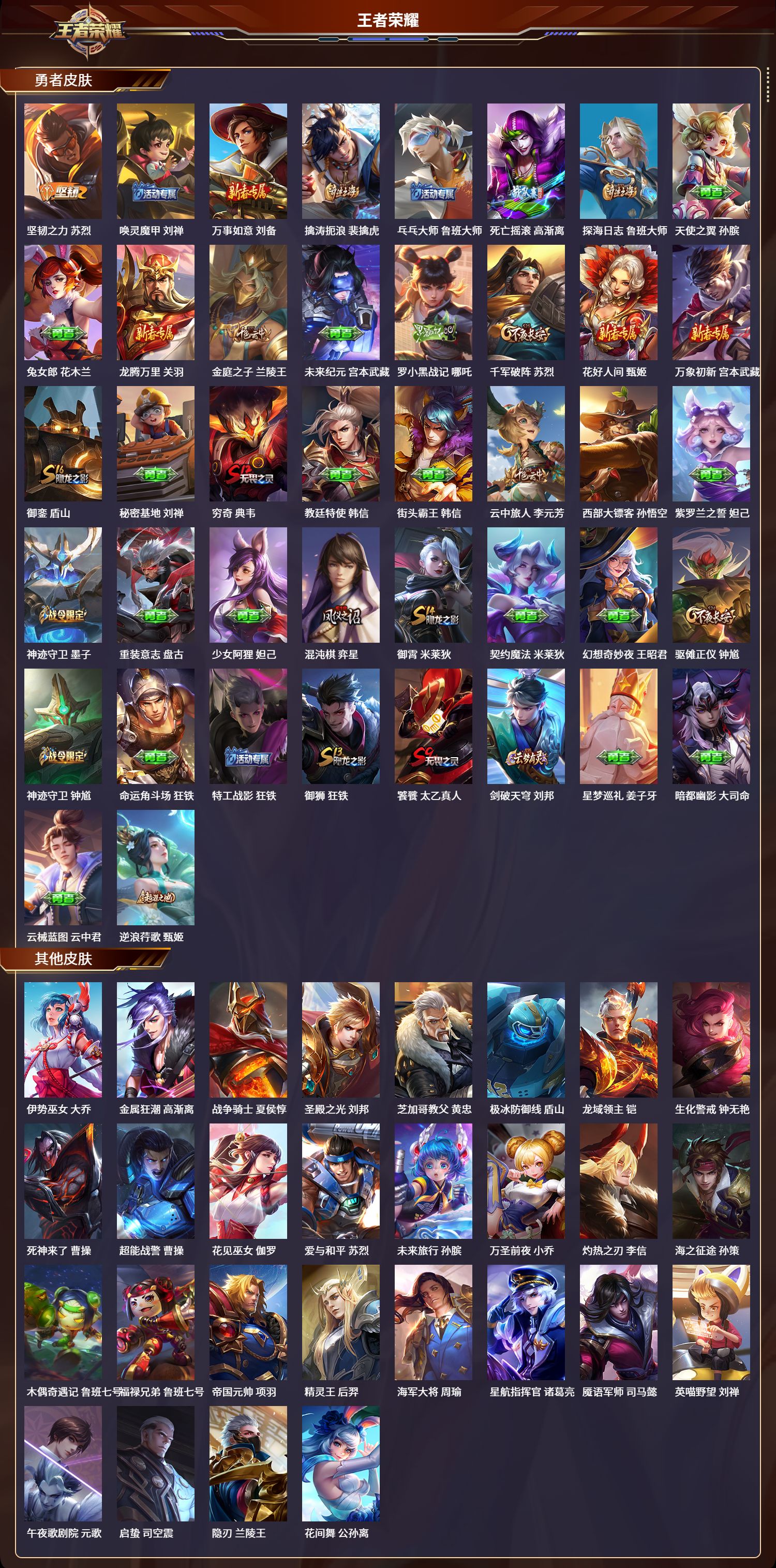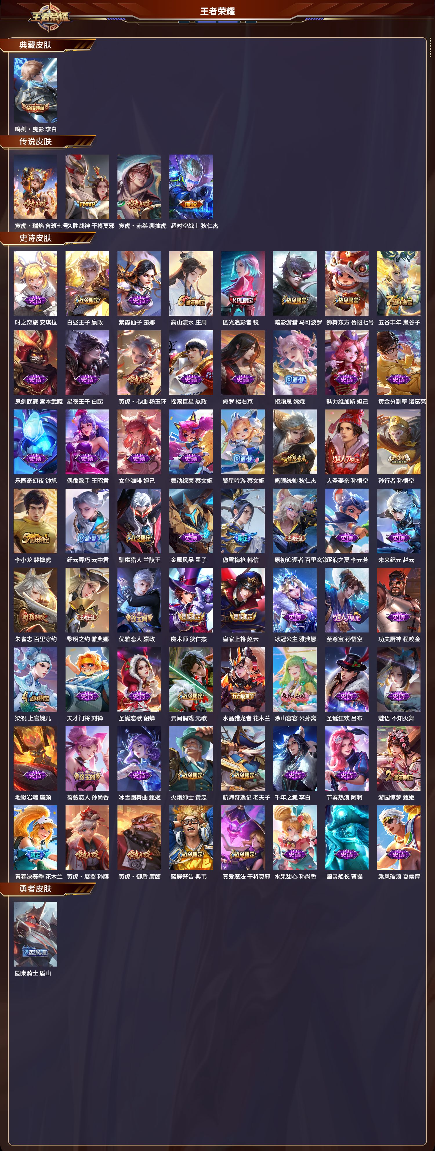苹果qq/至尊星耀/235皮肤/125英雄/1典藏/0珍品无双/0无双/0珍品传说/4传说/64史诗/8稀有英雄【1 典藏皮肤】鸣剑·曳影 李白【4 传说皮肤】寅虎·瑞焰 鲁班七号久胜战神 干将莫邪寅虎·赤拳 裴擒虎超时空战士 狄仁杰【64 史诗皮肤】时之奇旅 安琪拉白昼王子 嬴政紫霞仙子 露娜高山流水 庄周匿光追影者 镜暗影游猎 马可波罗狮舞东方 鲁班七