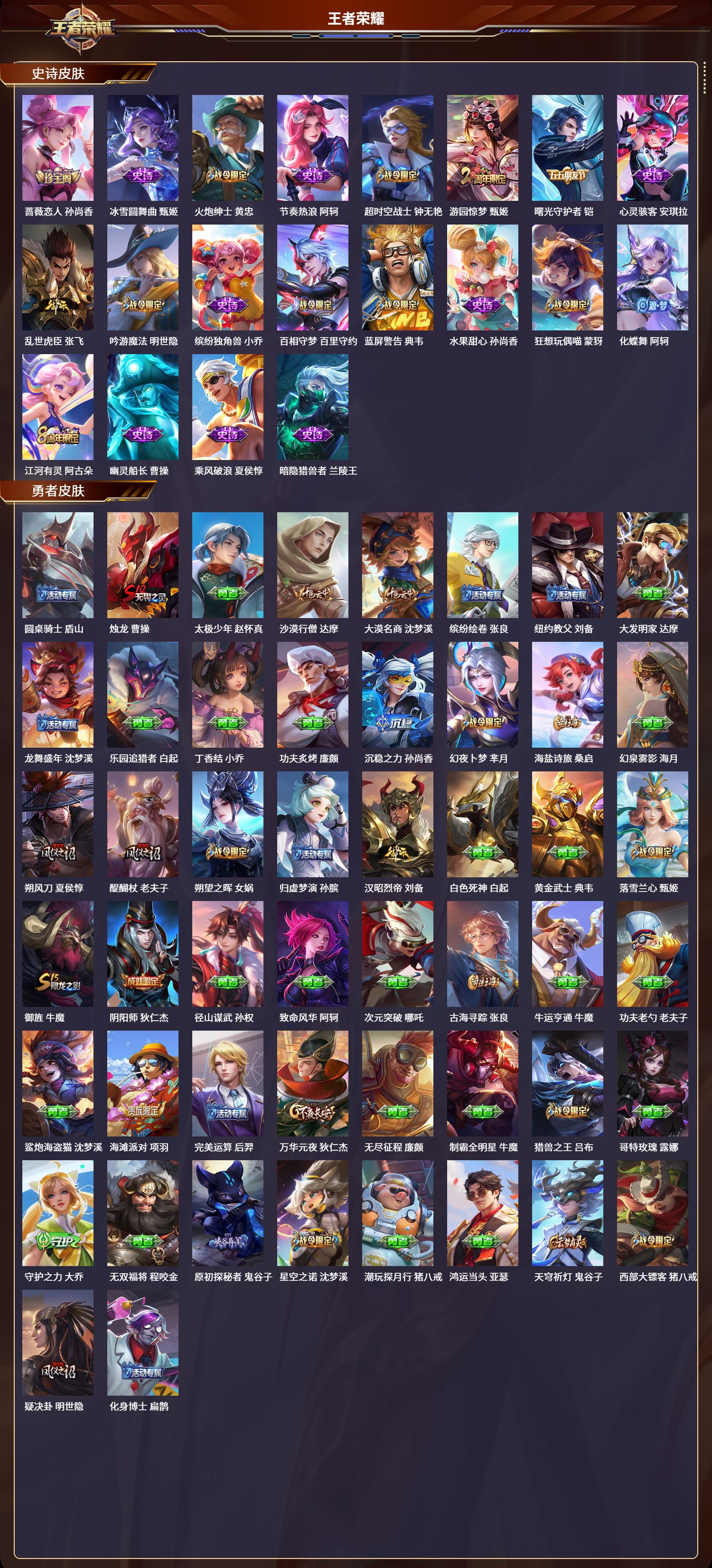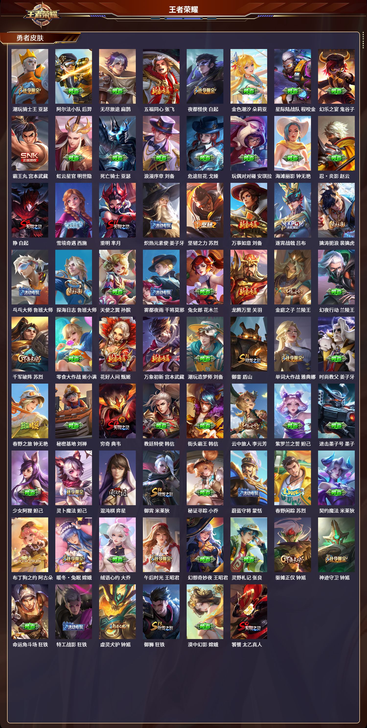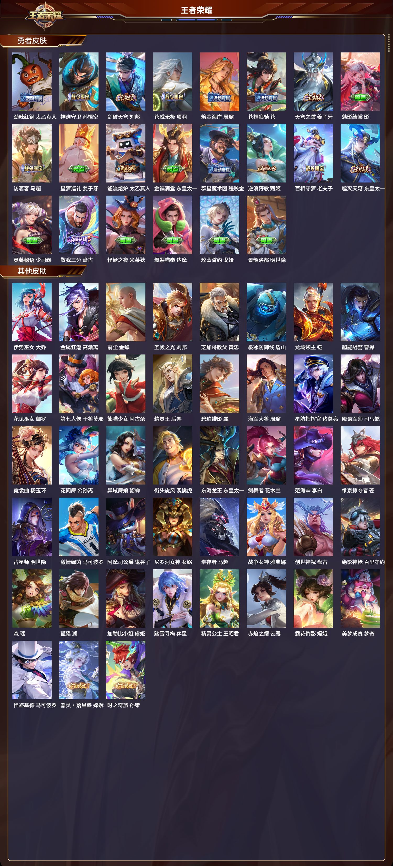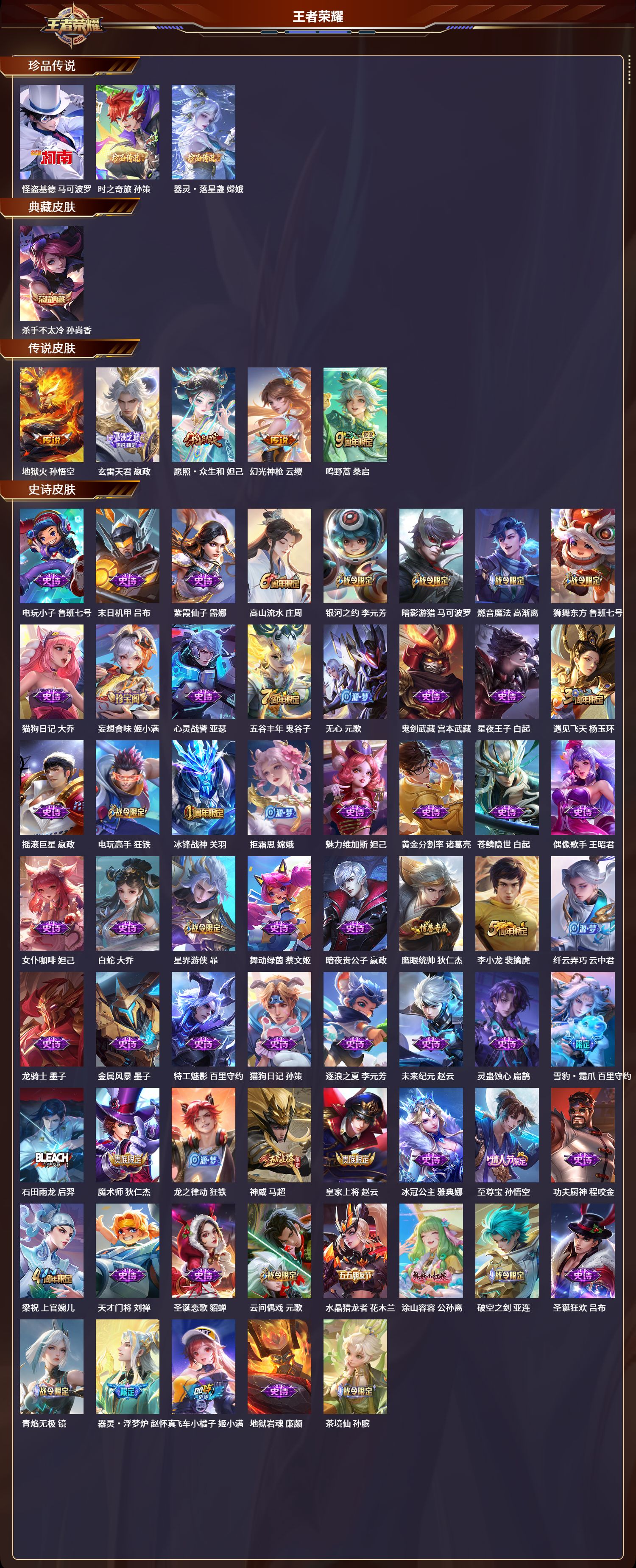 安卓qq/永恒钻石/272皮肤/126英雄/1典藏/0珍品无双/0无双/3珍品传说/5传说/81史诗/8稀有英雄【3 珍品传说】怪盗基德 马可波罗时之奇旅 孙策器灵·落星盏 嫦娥【1 典藏皮肤】杀手不太冷 孙尚香【5 传说皮肤】地狱火 孙悟空玄雷天君 嬴政愿照·众生和 妲己幻光神呛 云缨鸣野蒿 桑启【81 史诗皮肤】电玩小子 鲁班七号末日机甲 吕布紫霞仙子
