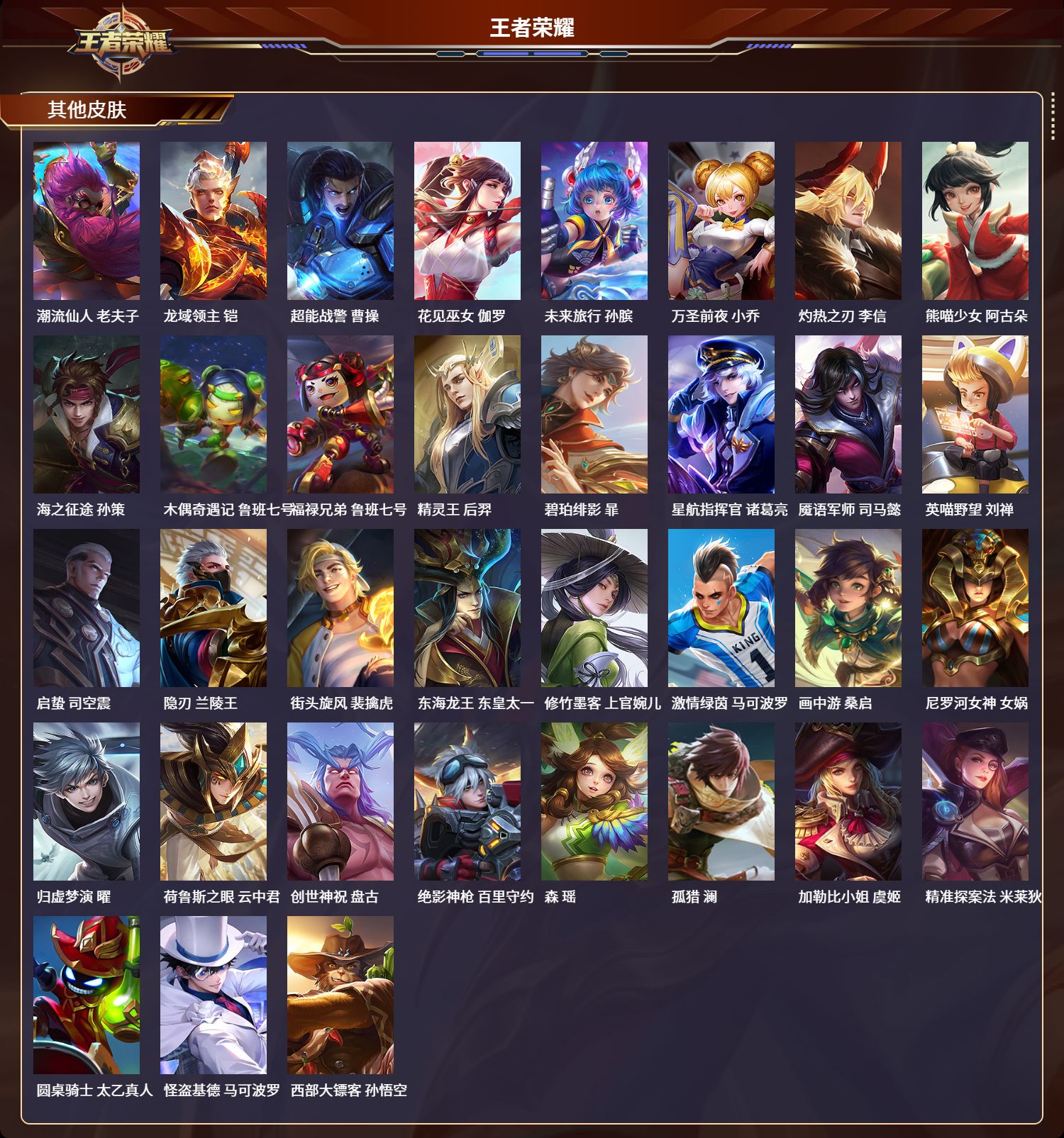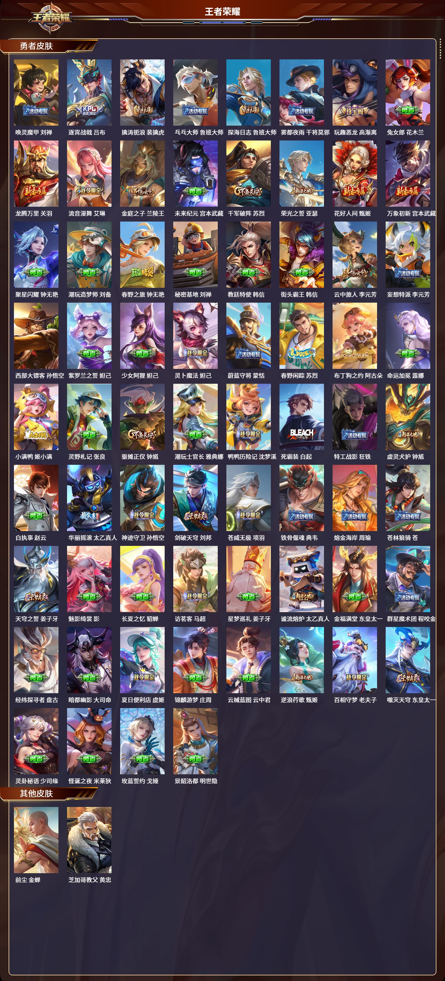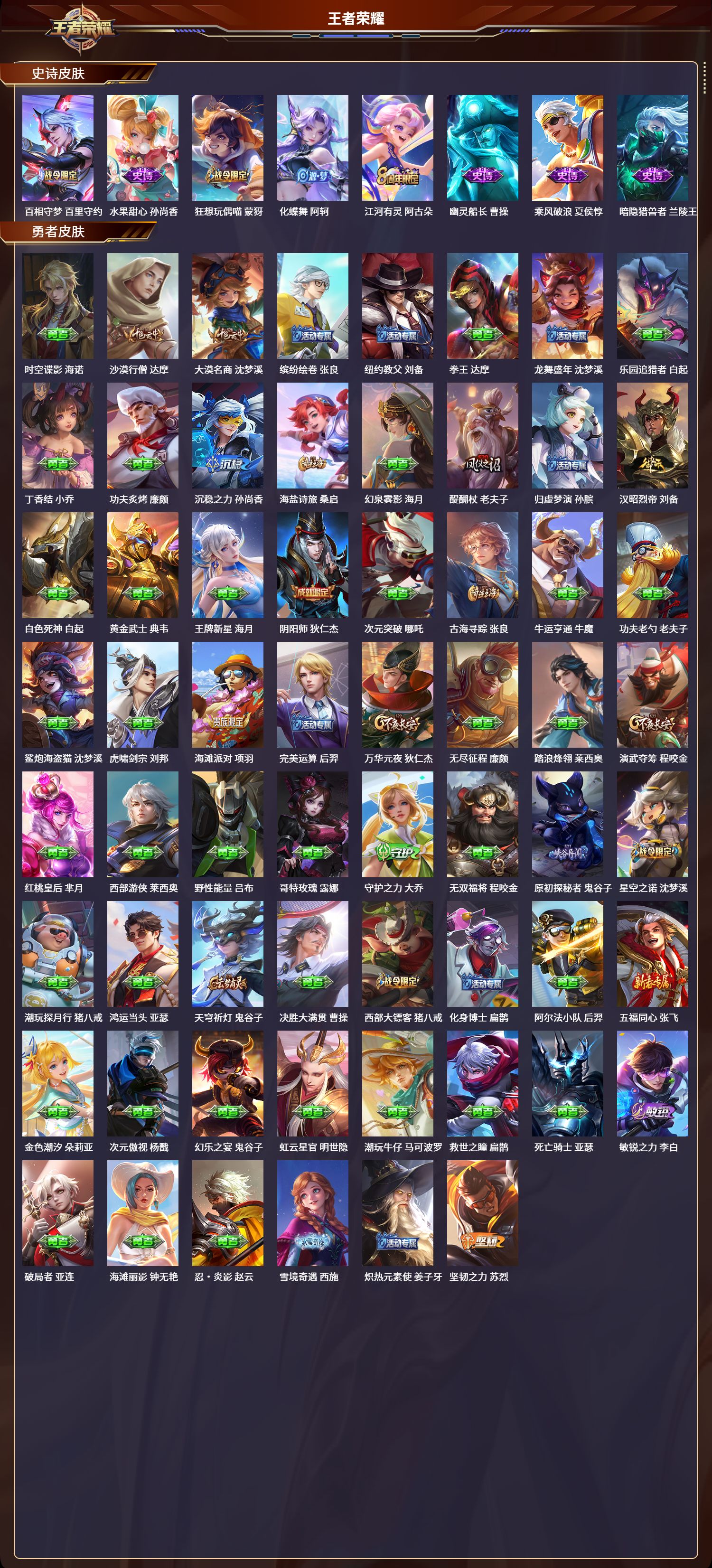 安卓qq/最强王者/243皮肤/125英雄/1典藏/0珍品无双/1无双/1珍品传说/10传说/65史诗/7稀有英雄【1 珍品传说】怪盗基德 马可波罗【1 典藏皮肤】鸣剑·曳影 李白【1 无双皮肤】器灵·螭龙剑 曜【10 传说皮肤】胖达荣荣 梦奇云鹰飞将 曜炽阳神光 镜妄想实况 马可波罗霜北刀 夏侯惇黄金白羊座 张良愿照·九州拓 澜幻光神呛 云缨祥瑞亨通 裴