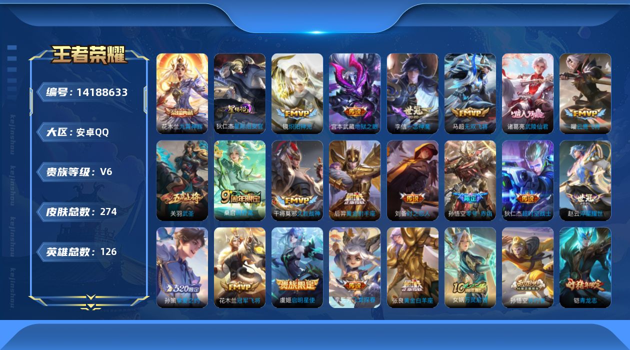 [14188633]【编号77969,可秒换绑】【皮肤质量扎实。该有的都有,适合回坑玩家!】星际治安官 ,安卓q-v6-最强王者段位-126英雄-274皮肤-1典藏皮肤-20传说-71史诗 【英雄全皮】:孙权全皮 【荣耀典藏】:花木兰九霄神辉 【传说皮肤】:后羿神树通天,桑启鸣野蒿,马超无双飞将,孙策挚爱之约,赵云淬星耀世,李元芳飞鸢探春,镜炽阳神光,虞姬启明星使,孙悟空零号赤焰,关羽武圣,曜云鹰飞将,李信一念神魔,刘备时之恋人,张良黄金白羊座,干将莫邪久胜战神,花木兰冠军飞将,后羿黄金射手座,诸葛亮武陵仙君,宫本武藏地狱之眼,狄仁杰超时空战士 【限定皮肤】:姜子牙天穹之誓,狄仁杰阴阳师,赵云皇家上将,赵云龙胆,赵云百木心呛,墨子神迹守卫,孙尚香蔷薇恋人,庄周高山流水,高渐离玩趣恶龙,芈月幻夜卜梦,吕布御风骁将,元歌云间偶戏,元歌无心,夏侯惇匿光决锋者,甄姬游园惊梦,狄仁杰魔术师,狄仁杰万华元夜,达摩星际陆战队,达摩沙漠行僧,项羽海滩派对,老夫子醍醐杖,老夫子航海奇遇记,关羽武圣,程咬金演武夺筹,兰陵王金庭之子,亚瑟潮玩骑士王,孙悟空零号赤焰,孙悟空孙行者,后羿如梦令,李元芳云中旅人,虞姬启明星使,钟馗驱傩正仪,雅典娜单词大作战,鬼谷子原初探秘者,鬼谷子五谷丰年,诸葛亮武陵仙君,黄忠火炮绅士,铠青龙志,苏烈千军破阵,百里守约朱雀志,沈梦溪大漠名商,裴擒虎李小龙,裴擒虎擒涛扼浪,米莱狄胡桃异想国,云中君纤云弄巧,孙策挚爱之约,嫦娥拒霜思,蒙犽狂想玩偶喵,鲁班大师探海日志,桑启海盐诗旅,艾琳女武神,阿古朵江河有灵,张良古海寻踪,鬼谷子天穹祈灯,沈梦溪龙舞盛年,刘邦剑破天穹 【年限皮肤】:百里守约朱雀志,铠青龙志,吕布御风骁将,关羽武圣,赵云龙胆 【赛季限定】:狄仁杰万华元夜,达摩沙漠行僧,老夫子醍醐杖,程咬金演武夺筹,兰陵王金庭之子,张良古海寻踪,李元芳云中旅人,钟馗驱傩正仪,鬼谷子原初探秘者,苏烈千军破阵,沈梦溪大漠名商,裴擒虎擒涛扼浪,鲁班大师探海日志,桑启海盐诗旅,鬼谷子天穹祈灯,刘邦剑破天穹,姜子牙天穹之誓 【战令限定】:墨子神迹守卫,芈月幻夜卜梦,元歌云间偶戏,达摩星际陆战队,老夫子航海奇遇记,亚瑟潮玩骑士王,雅典娜单词大作战,黄忠火炮绅士,米莱狄胡桃异想国,蒙犽狂想玩偶喵 【史诗皮肤】:鲁班七号电玩小子,露娜紫霞仙子,赵云皇家上将,赵云未来纪元,貂蝉圣诞恋歌,甄姬冰雪圆舞曲,