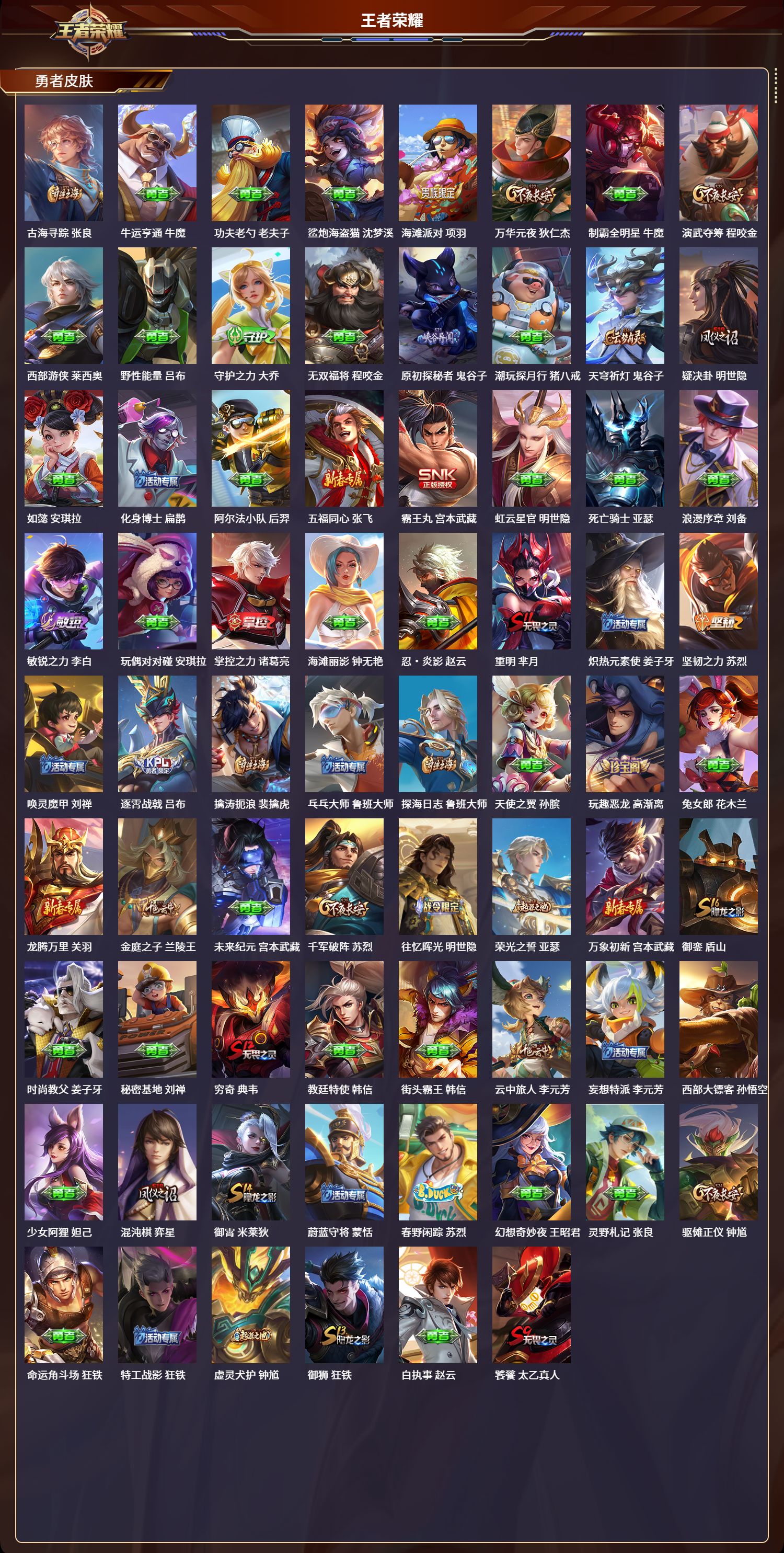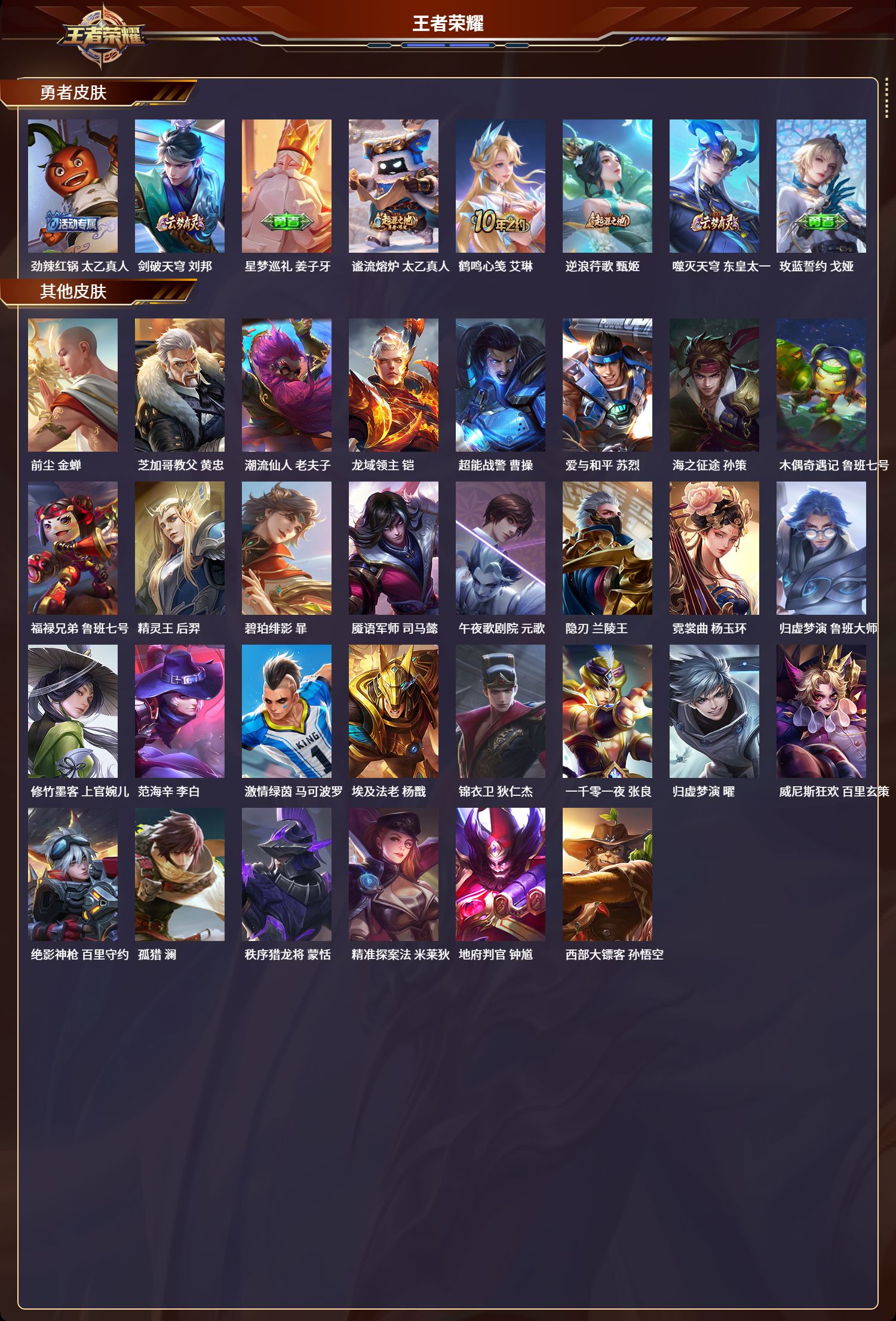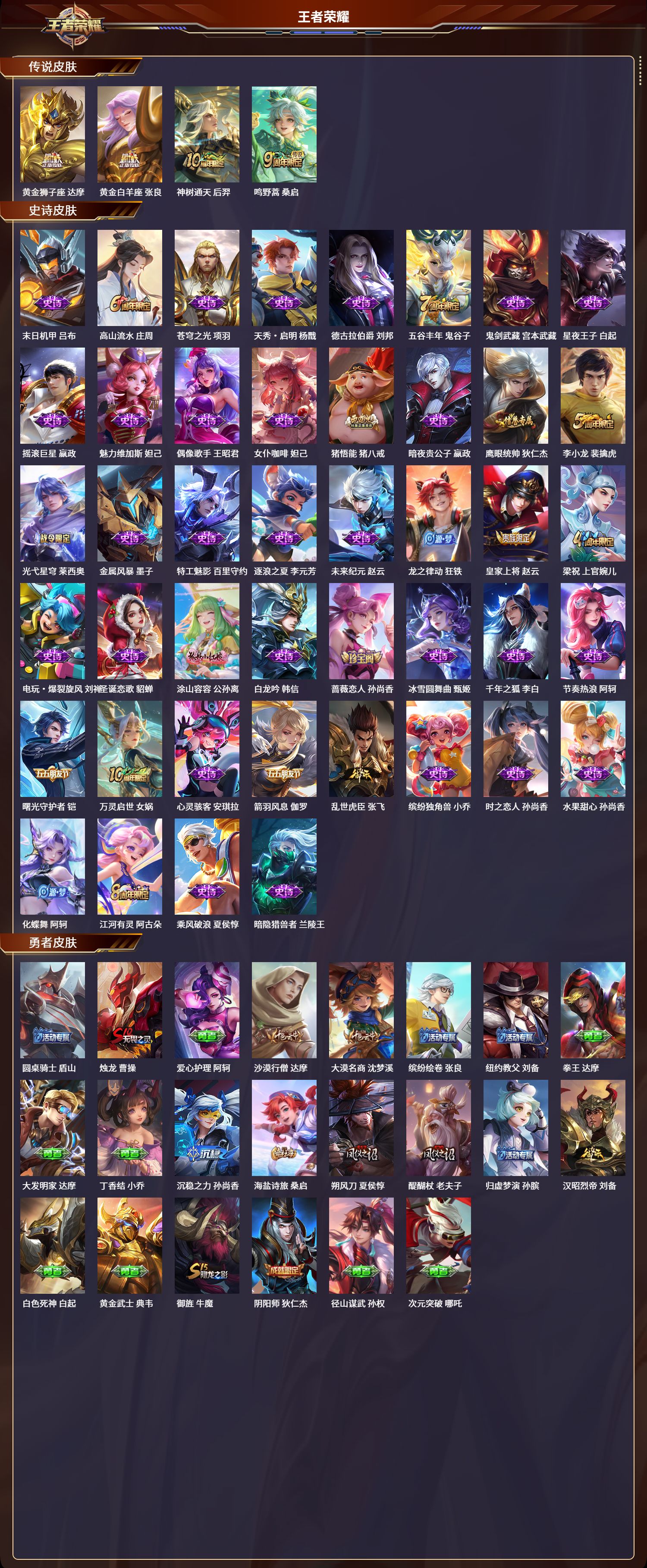 安卓qq/绝世王者/178皮肤/127英雄/0典藏/0珍品无双/0无双/0珍品传说/4传说/44史诗/9稀有英雄【4 传说皮肤】黄金狮子座 达摩黄金白羊座 张良神树通天 后羿鸣野蒿 桑启【44 史诗皮肤】末日机甲 吕布高山流水 庄周苍穹之光 项羽天秀·启明 杨戬德古拉伯爵 刘邦五谷丰年 鬼谷子鬼剑武藏 宫本武藏星夜王子 白起摇滚巨星 嬴政魅力维加斯 妲己偶像歌手 王昭君
