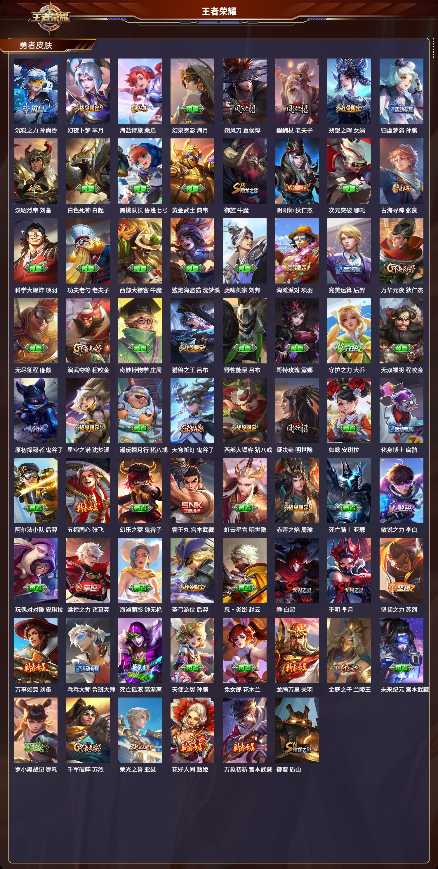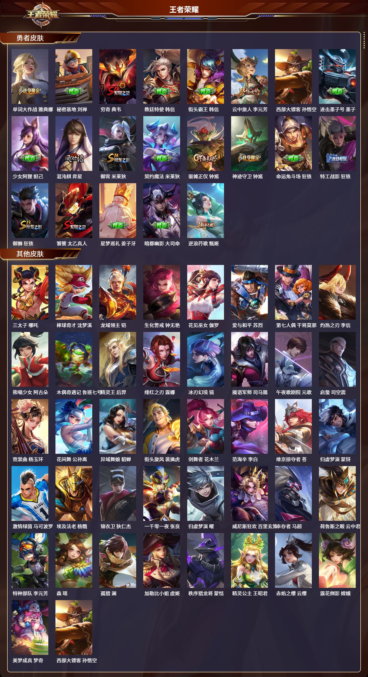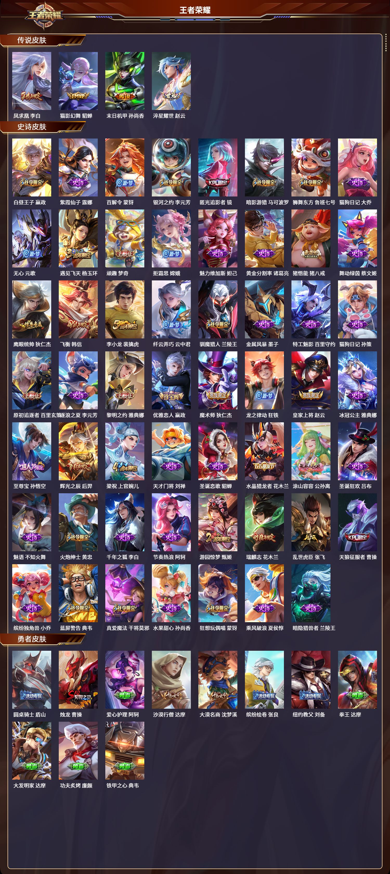 安卓qq/至尊星耀/202皮肤/126英雄/0典藏/0珍品无双/0无双/0珍品传说/4传说/55史诗/8稀有英雄【4 传说皮肤】凤求凰 李白猫影幻舞 貂蝉末日机甲 孙尚香淬星耀世 赵云【55 史诗皮肤】白昼王子 嬴政紫霞仙子 露娜百解令 蒙犽银河之约 李元芳匿光追影者 镜暗影游猎 马可波罗狮舞东方 鲁班七号猫狗日记 大乔无心 元歌遇见飞天 杨玉环顽趣
