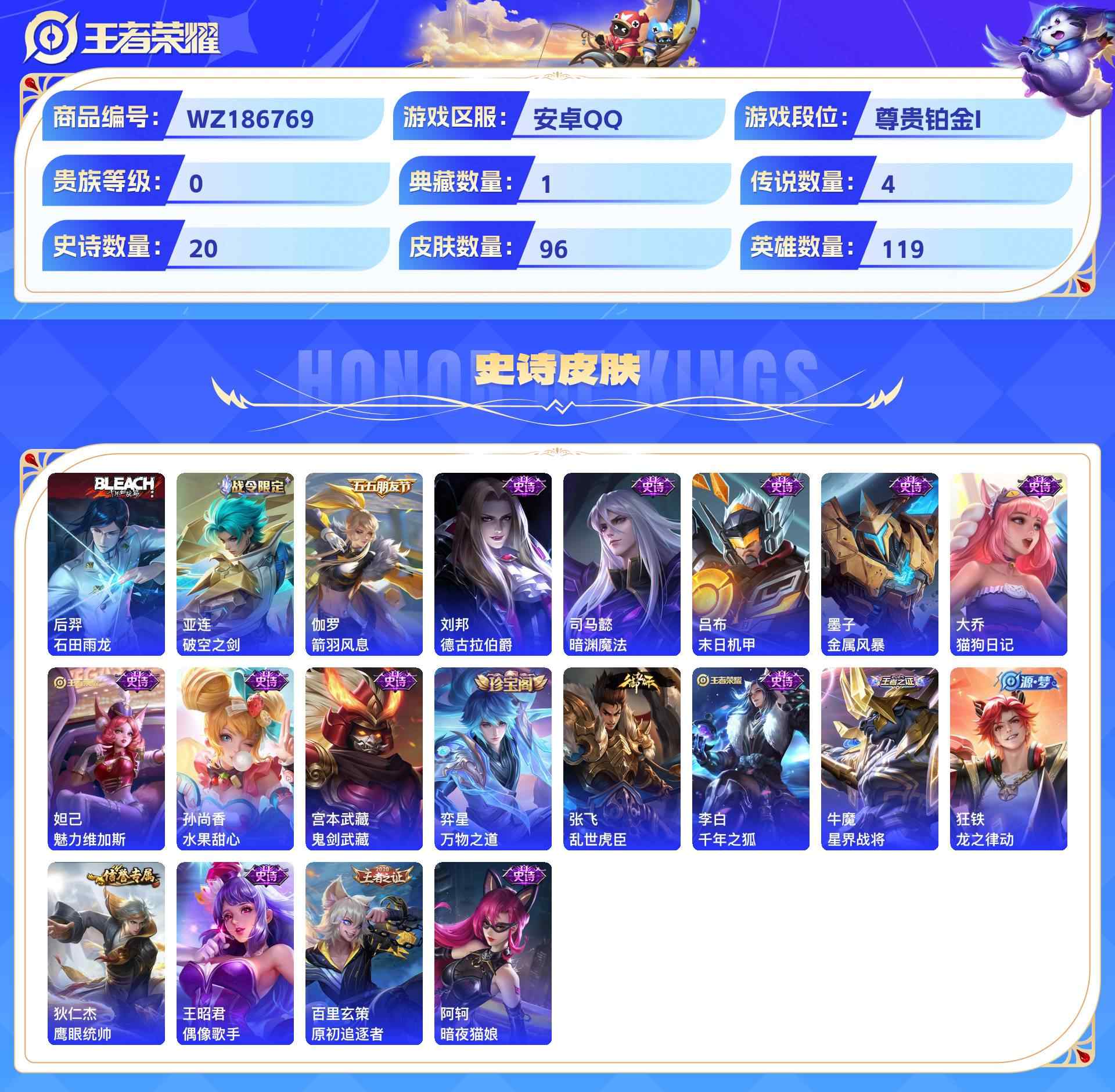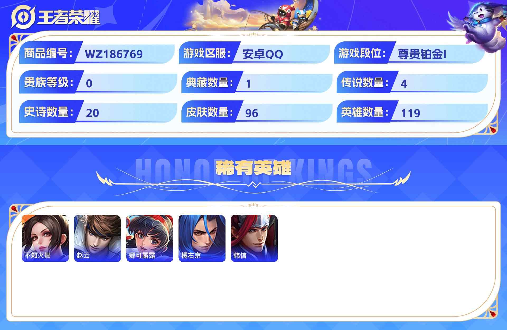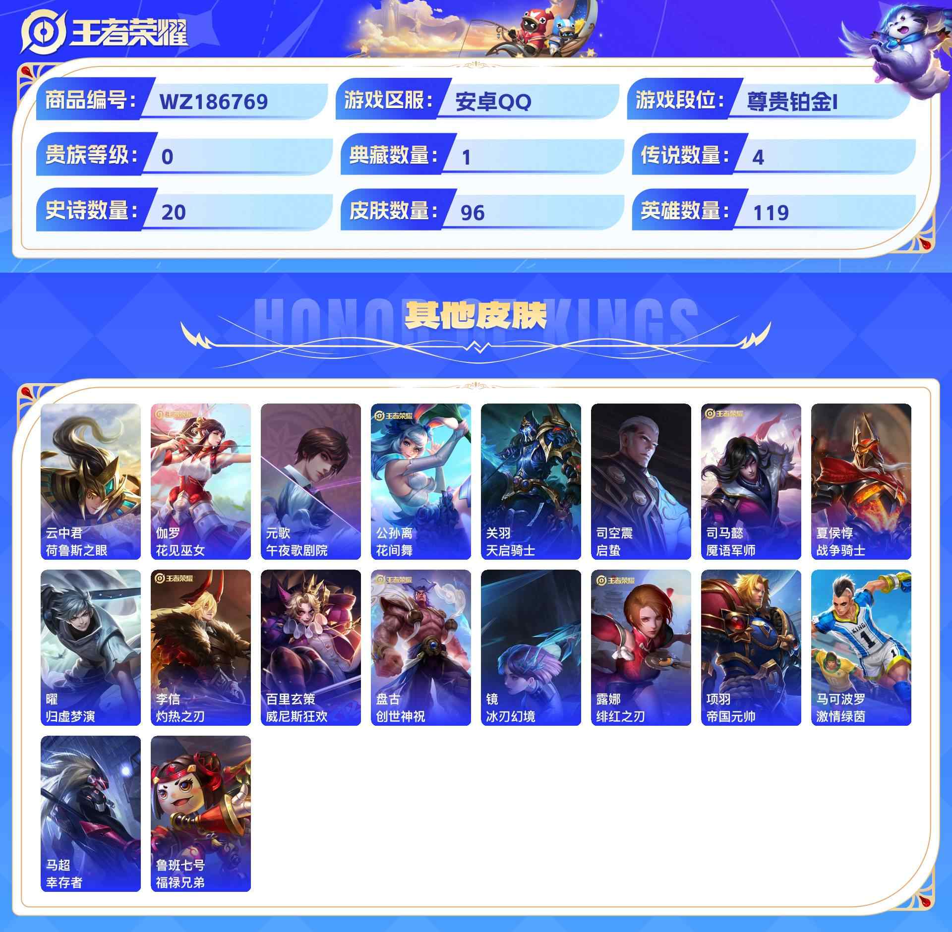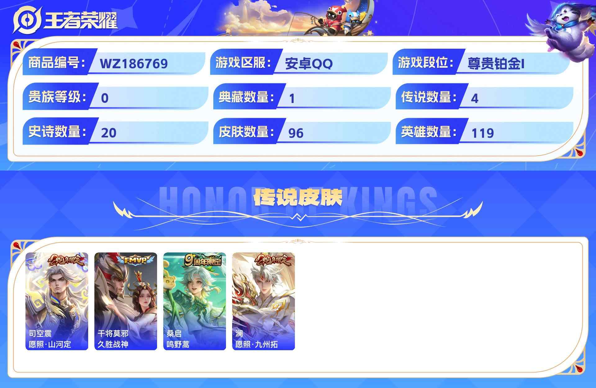 wz186769|精品脱坑小号安卓qq1天幕 贵族4 96皮 1典藏 4传说 20史诗【荣耀典藏】银白咏叹调