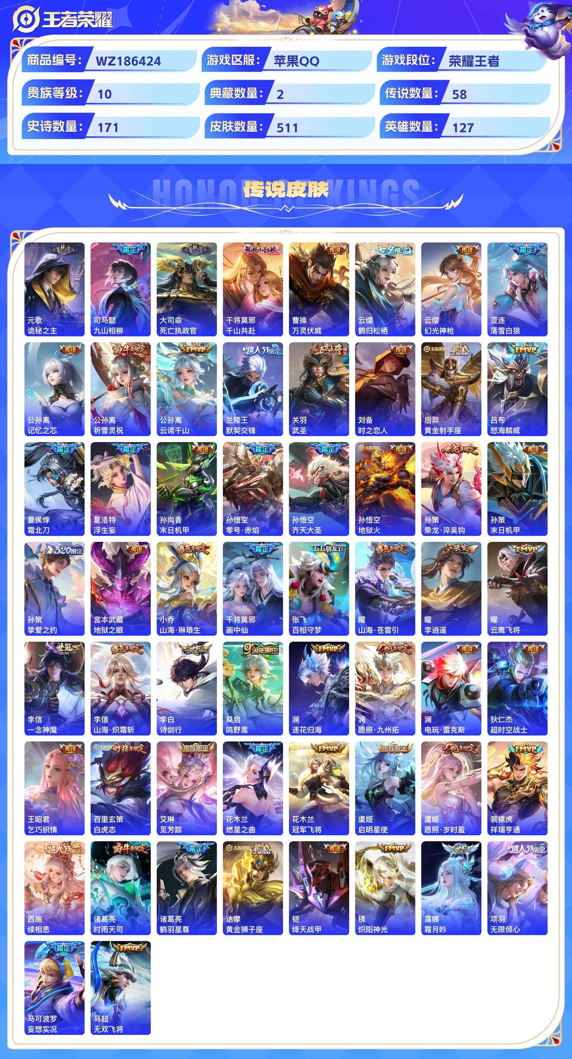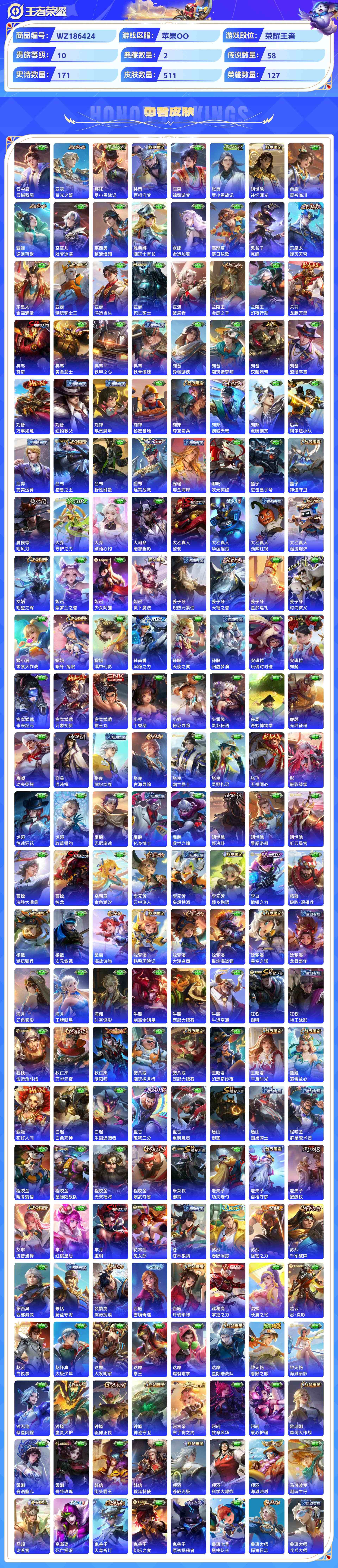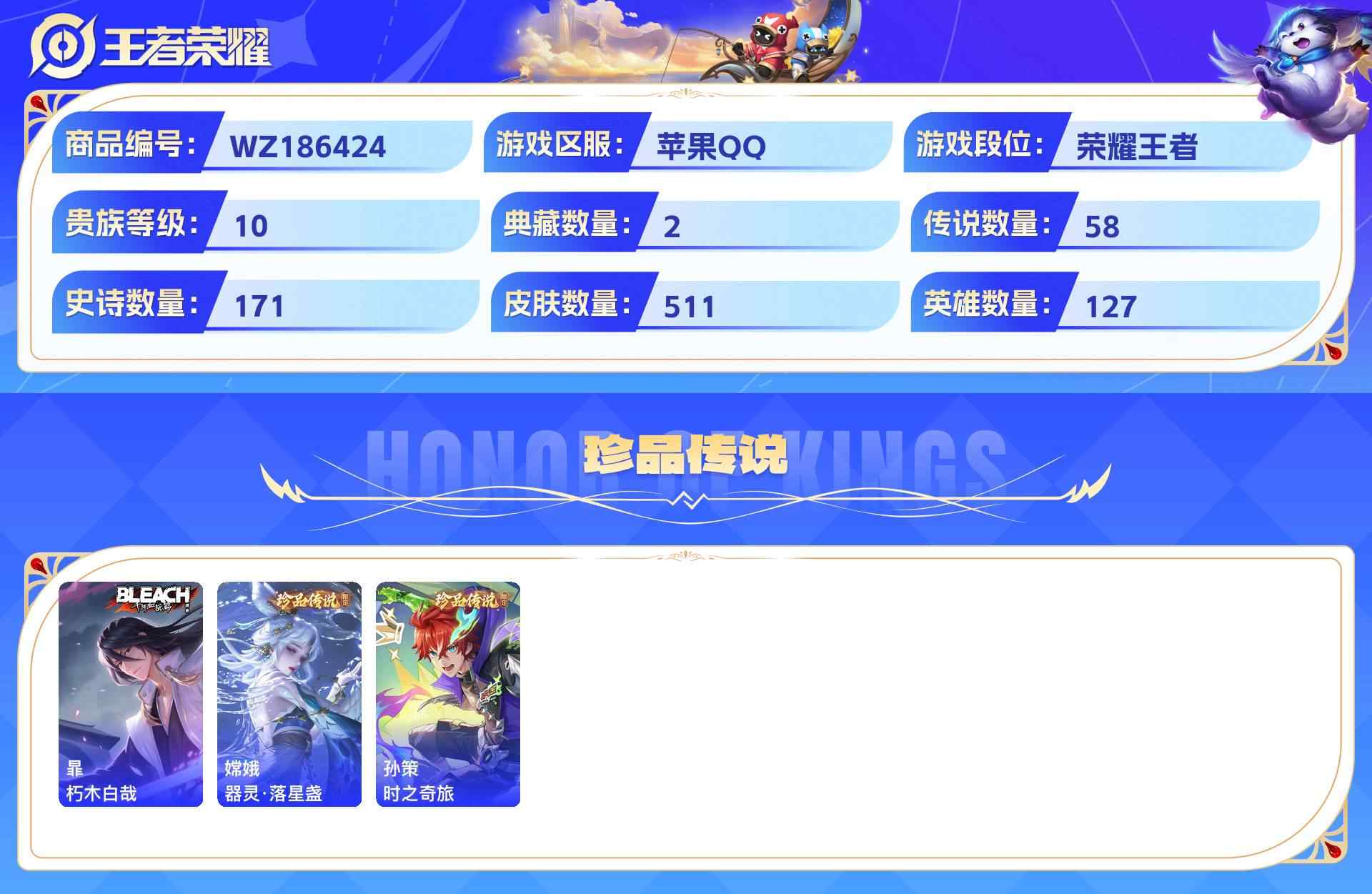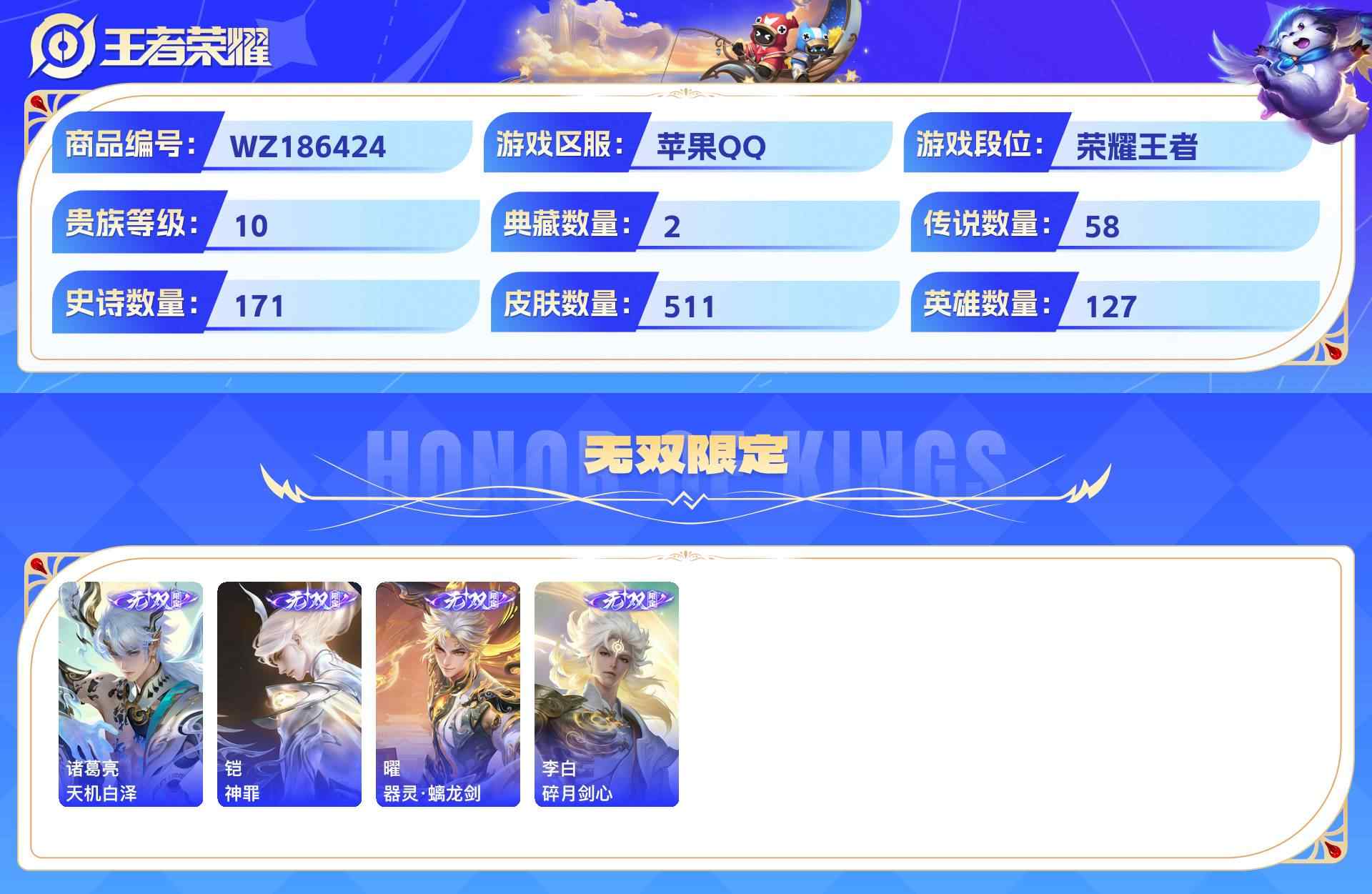 wz186424|精品金标万战号3金标(诸葛亮 亚连 项羽)1万战(诸葛亮)苹果qq 贵族10级 511皮 2典藏(鸣剑·曳影星域神启) 3珍品传说(朽木白哉器灵·落星盏时之奇旅) 4无双(天机白泽神罪器灵·螭龙剑碎月剑心) 58传说 171史诗4星传说34个性按键