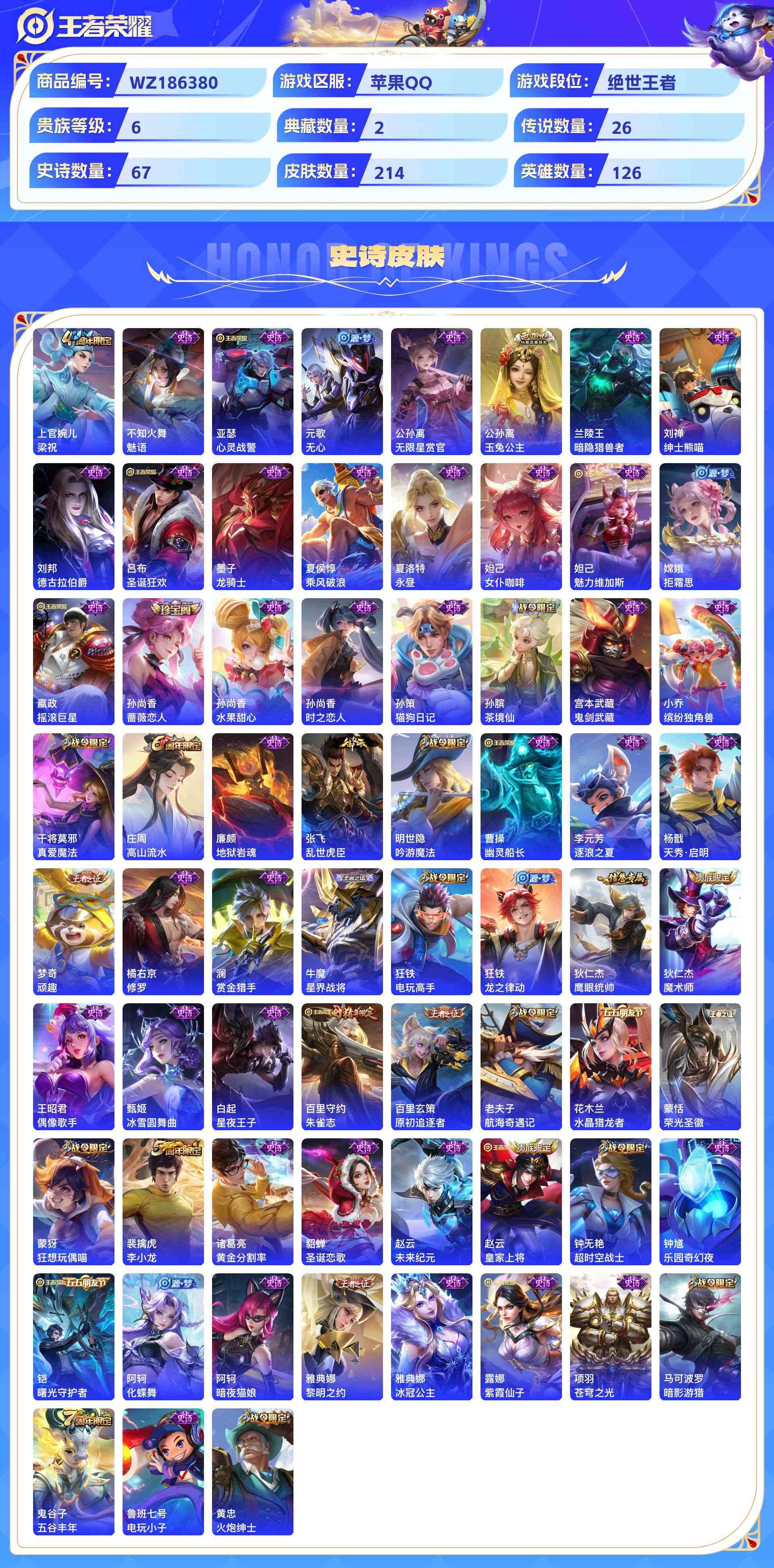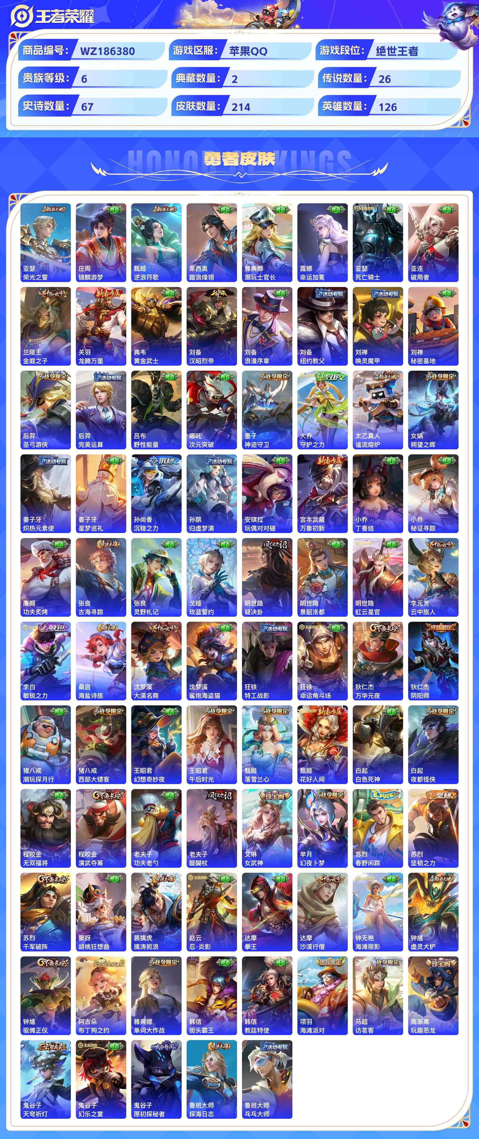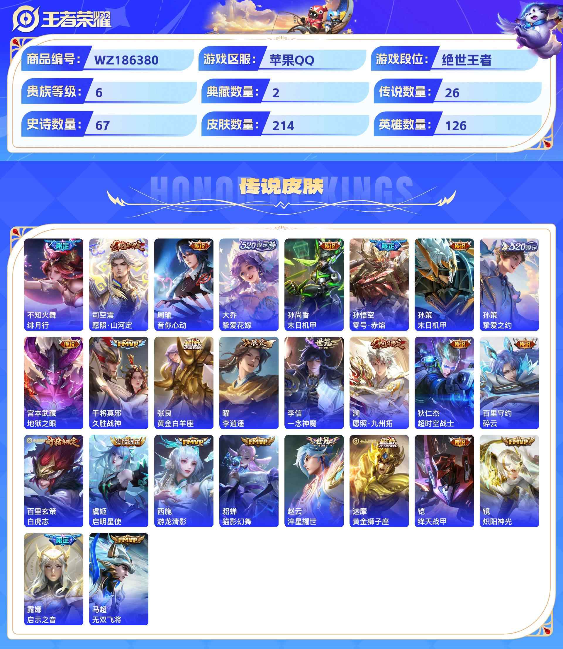 wz186380|精品号苹果qq 贵族8级 214皮 2典藏(无限飓风号星域神启) 26传说(绯月行愿照·山河定音你心动挚爱花嫁末日机甲零号·赤焰末日机甲挚爱之约地狱之眼久胜战神黄金白羊座李 一念神魔) 67史诗3星传说10个性按键1天幕