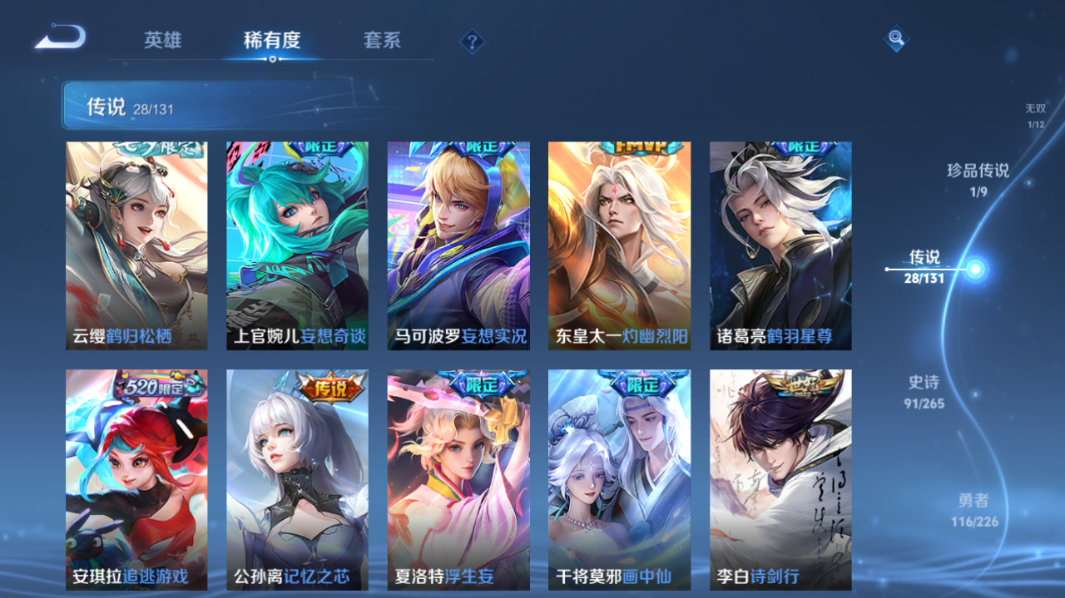 【王者荣耀】【lywz21709】珍品无双0 典藏1 无双1 珍品传说1 传说28 史诗91 英雄127 皮肤278 贵族8级 荣耀典藏:鸣剑·曳影__无双皮肤:碎月剑心__珍品传说:怪盗基德__传说皮肤:鸣野蒿|启明星使|地狱火|云霓雀翎|猫影幻舞|云鹰飞将|乞巧织情|瑶-时之祈愿|浮生妄|鹤羽星尊|画中仙|记忆之芯|安琪拉-追逃游戏|大乔-时之奇旅|惊梅引|诗剑行|霜月吟|妄想奇谈|妄想实况|小乔-音你心动|遇见神鼓|逐花归海|乘龙·淬吴钩|乘龙·铭钟鼎|乘龙·问璇玑|云缨-鹤归松栖|灼幽烈阳|神树通天__稀有限定:蔷薇恋人|乒乒小将|女儿国国王|傲雪梅呛|玉兔公主|梁祝|山海·碧波行|拒霜思|百解令|嫦娥-如梦令|大漠名商|地狱燃心|凤凰于飞|古海寻踪|海滩派对|海盐诗旅|皇家上将|剑破天穹|江河有灵|魔术师|花木兰-默契交锋|匿光破解者|匿光侦查者|奇幻香踪|擒涛扼浪|青焰无极|燃音魔法|探海日志|天穹祈灯|妄想食味|无心|五谷丰年|纤云弄巧|星界游侠|阴阳师|驭风魔法|真爱魔法|暗夜猫娘|暗隐猎兽者|白蛇|缤纷独角兽|冰冠公主|冰雪圆舞曲|乘风破浪|乘龙·聚宝船|乘龙·忆丹青|大乔-猫狗日记|德古拉伯爵|电玩·爆裂旋风|电玩·兔顽号|浮梦罗烟|伽罗-琥珀纪元|鬼剑武藏|唤灵魅影|箭羽风息|节奏热浪|金属风暴|李元芳-蔬乡物语|吕布-末日机甲|魅力维加斯|魅语|女仆咖啡|偶像歌手|奇遇舞章|奇遇星旅|青蛇|上官婉儿-群星魔术团|绅士熊喵|圣诞狂欢|圣诞恋歌|鲁班七号-蔬乡物语|水果甜心|水晶猎龙者|孙策-猫狗日记|晚萤|赵云-未来纪元|雪夜绮愿|银翎春语|鹰眼统帅|遇见神鹿|月团寄思|逐浪之夏|紫霞仙子|赵怀真-鹤归松栖|百里守约-百相守梦|老夫子-百相守梦|谪仙醉月|噬灭天穹|敬我三分|天穹之誓|安琪拉-时之奇旅|修罗|曙光守护者|心灵战警|千年之狐|刘备-百相守梦|孙尚香-时之恋人|无限星赏官|舞动绿茵|特工魅影|心灵骇客|星界战将|谧流熔炉|云中旅人|玲珑珍味|朔望之晖|流音漫舞|暖冬·兔眠|灵卜魔法|苍威无极|圣弓游侠|落雪兰心|布丁狗之约|虚灵犬护|逆浪荇歌|织梦人|荣光之誓|万灵启世|鹤鸣心笺__优质皮肤:一千零一夜|年年有余|熊喵少女|午夜歌剧院|露花倒影|未来旅行|激情绿茵|碧珀绯影|森|英喵野望|维京掠夺者|海军大将|绯红之刃|踏雪寻梅|画中游|威尼斯狂欢|潮流仙人|芝加哥教父|荷鲁斯之眼|赤焰之缨|前尘|特种部队|三太子|精灵王|范海辛|龙域领主|爱与和平|占星师|花间舞|魇语军师|花见巫女|棒球奇才|蔷薇王座|加勒比小姐|异域舞娘|精灵公主|修竹墨客|万圣前夜|怪诞之夜|绒语心约|异域游侠|暗都幽影|功夫炙烤|暖冬絮语|幻夜行动|聚星闪耀|潮玩探月行|虎啸剑宗|瓷语鉴心|秘密基地|次元突破|鲨炮海盗猫|丁香结|虹云星官|守护之力|功夫老勺|幻想奇妙夜|阿尔法小队|兔女郎|死亡骑士|黄金武士|少女阿狸|天使之翼|玩偶对对碰|宫本武藏-未来纪元|红桃皇后|忍·炎影|爱心护理|教廷特使|金色潮汐|漠中幻影|时空谍影|决胜大满贯|破局者|王牌新星|零食大作战|西部游侠|太极少年|乐园追猎者|幻泉雾影|潮玩造梦师|危途狂花|契约魔法|黑桃队长|幽兰居士|拳王|时尚教父|鲤鱼之梦|白色死神|白执事|哥特玫瑰|魅影绮裳|星梦巡礼|景韶洛都|浪漫序章|掌控之力|雾都夜雨|逐霄战戟|龙腾万里|乱世虎臣|经纬探寻者|孙悟空-西部大镖客|牛魔-西部大镖客|热血海滩|龙舞盛年|乓乓大师|五福同心|万事如意|沉稳之力|程咬金-群星魔术团|完美运算|花好人间|熔金海岸|春野之旅|无尽旅途|潮玩骑兵|蔚蓝守将|劲辣红锅|特工战影|妄想特派|灵野札记|玫蓝誓约|死霸装|踏浪烽翎|克喵|哪吒-罗小黑战记|径山谋武__贵族等级:贵族8级__王者段位:绝世王者