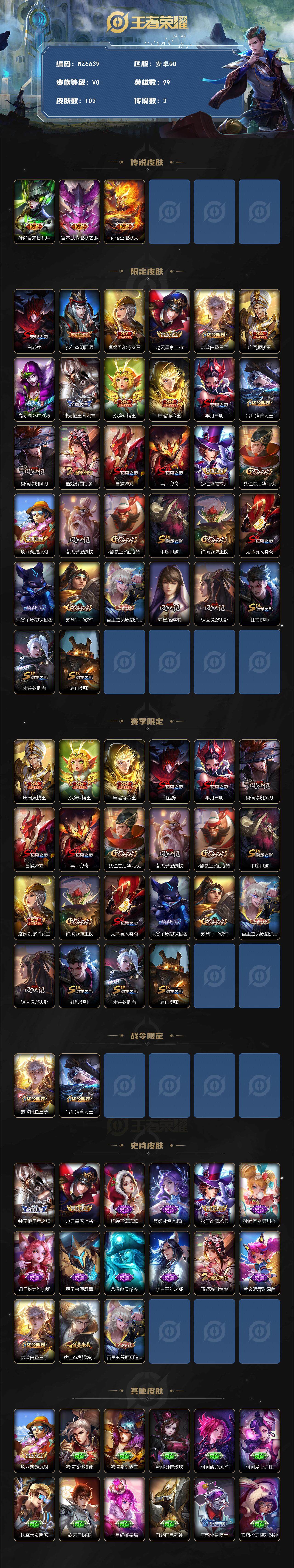 【qq等级皇冠】v0-秩序白银iii段位-99英雄-102皮肤-3传说-15史诗 【传说皮肤】:孙尚香末日机甲,宫本武藏地狱之眼,孙悟空地狱火 【限定皮肤】:白起狰,狄仁杰阴阳师,虞姬凯尔特女王,赵云皇家上将,嬴政白昼王子,庄周蜃楼王,高渐离死亡摇滚,钟无艳王者之锤,孙膑妖精王,扁鹊炼金王,芈月重明,吕布猎兽之王,夏侯惇朔风刀,甄姬游园惊梦,曹操烛龙,典韦穷奇,狄仁杰魔术师,狄仁杰万华元夜,项羽海滩派对,老夫子醍醐杖,程咬金演武夺筹,牛魔御旌,钟馗驱傩正仪,太乙真人饕餮,鬼谷子原初探秘者,苏烈千军破阵,百里玄策原初追逐者,弈星混沌棋,明世隐疑决卦,狂铁御狮,米莱狄御霄,盾山御銮 【赛季限定】:庄周蜃楼王,孙膑妖精王,扁鹊炼金王,白起狰,芈月重明,夏侯惇朔风刀,曹操烛龙,典韦穷奇,狄仁杰万华元夜,老夫子醍醐杖,程咬金演武夺筹,牛魔御旌,虞姬凯尔特女王,钟馗驱傩正仪,太乙真人饕餮,鬼谷子原初探秘者,苏烈千军破阵,百里玄策原初追逐者,弈星混沌棋,明世隐疑决卦,狂铁御狮,米莱狄御霄,盾山御銮 【战令限定】:嬴政白昼王子,吕布猎兽之王 【史诗皮肤】:钟无艳王者之锤,赵云皇家上将,貂蝉圣诞恋歌,甄姬冰雪圆舞曲,狄仁杰魔术师,孙尚香水果甜心,妲己魅力维加斯,墨子金属风暴,曹操幽灵船长,李白千年之狐,甄姬游园惊梦,蔡文姬舞动绿茵,嬴政白昼王子,狄仁杰鹰眼统帅,百里玄策原初追逐者 【其他皮肤】:项羽海滩派对,韩信教廷特使,韩信街头霸王,露娜哥特玫瑰,阿轲致命风华,阿轲爱心护理,达摩大发明家,赵云白执事,芈月红桃皇后,白起白色死神,扁鹊化身博士,安琪拉玩偶对对碰,妲己少女阿狸,典韦黄金武士,亚瑟死亡骑士,达摩拳王,花木兰兔女郎,宫本武藏万象初新,狄仁杰阴阳师,庄周蜃楼王,刘备纽约教父,高渐离死亡摇滚,孙膑妖精王,刘备汉昭烈帝,扁鹊炼金王,关羽龙腾万里,虞姬凯尔特女王,墨子进击墨子号,白起狰,钟无艳海滩丽影,太乙真人饕餮,宫本武藏霸王丸,曹操烛龙,芈月重明,老夫子功夫老勺,典韦穷奇,狂铁御狮,米莱狄御霄,吕布猎兽之王,牛魔御旌,小乔丁香结,吕布野性能量,盾山御銮,孙膑归虚梦演,沈梦溪鲨炮海盗猫,夏侯惇朔风刀,弈星混沌棋,明世隐疑决卦,盾山圆桌骑士,老夫子醍醐杖,鬼谷子原初探秘者,狄仁杰万华元夜,程咬金演武夺筹,钟馗驱傩正仪,苏烈千军破阵,项羽帝国元帅,貂蝉异域舞娘,花木兰剑舞者,王昭君精灵公主,曹操死神来了,张良一千零一夜,孙悟空西部大镖客,后羿精灵王,刘禅英喵野望,兰陵王隐刃,李白范海辛,钟馗地府判官,关羽天启骑士,雅典娜战争女神,马可波罗激情绿茵,苍维京掠夺者,杨戬埃及法老,太乙真人圆桌骑士,哪吒三太子,诸葛亮星航指挥官,大乔伊势巫女,鬼谷子阿摩司公爵,铠龙域领主,百里守约绝影神呛,苏烈爱与和平,女娲尼罗河女神,公孙离花间舞,猪八戒年年有余,曜归虚梦演 【营地id】:228574809