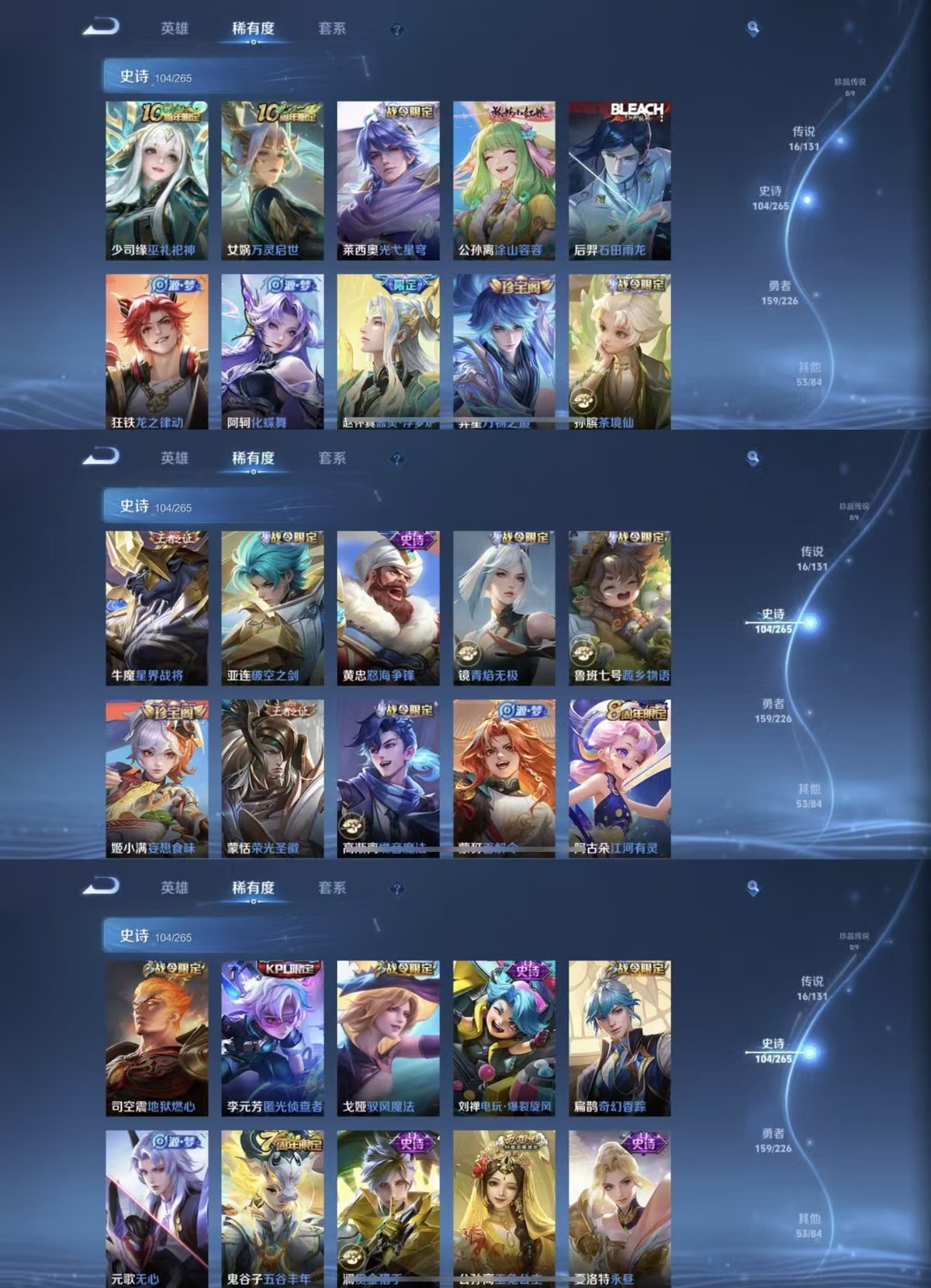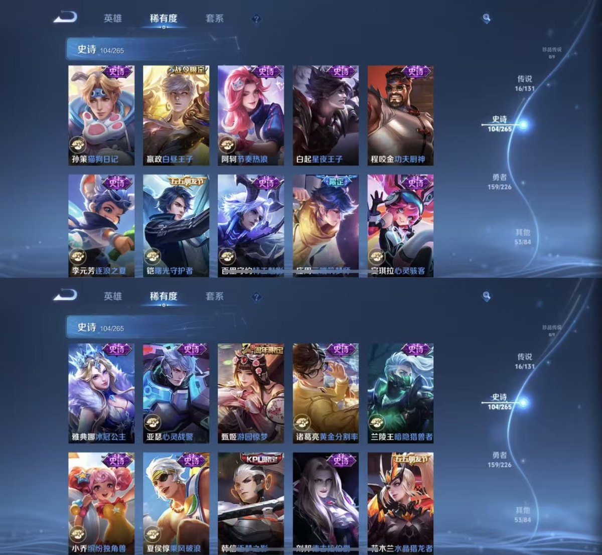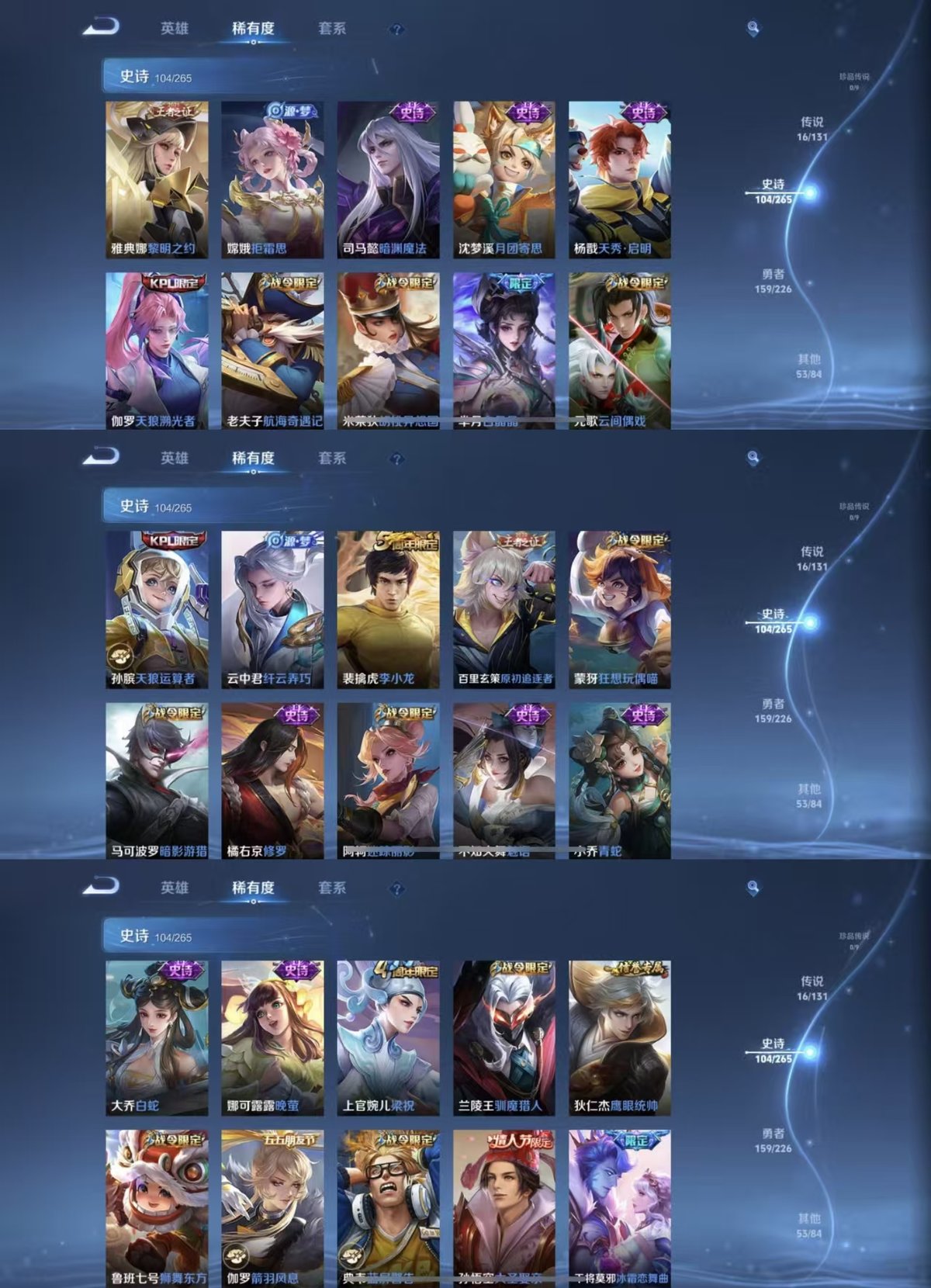2284993-实名: 可修改 贵族等级: v8 英雄数: 127 皮肤数: 333 荣耀水晶: 鸣剑·曳影 传说皮: 黄金狮子座绛天战甲末日机甲-孙尚香地狱火地狱之眼时之恋人-刘备超时空战士-狄仁杰惊梅引神树通天 限定皮: 李小龙游园惊梦梁祝云端筑梦师时雨天司白晶晶天狼溯光者逐梦之音冰霜恋舞曲天狼运算者逐梦之影白虎志至尊宝大圣娶亲玉兔公主深海之