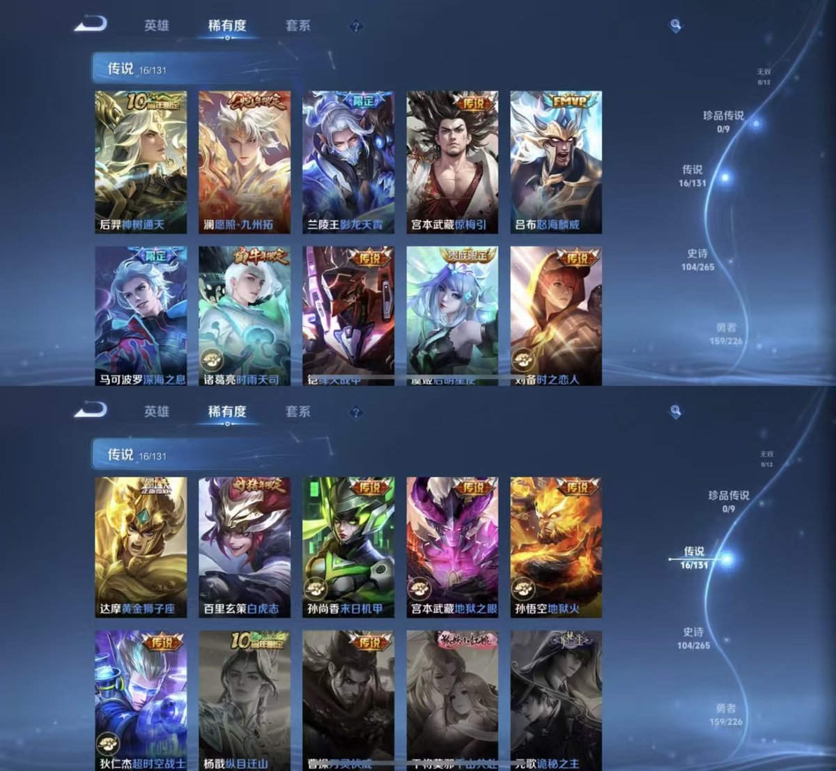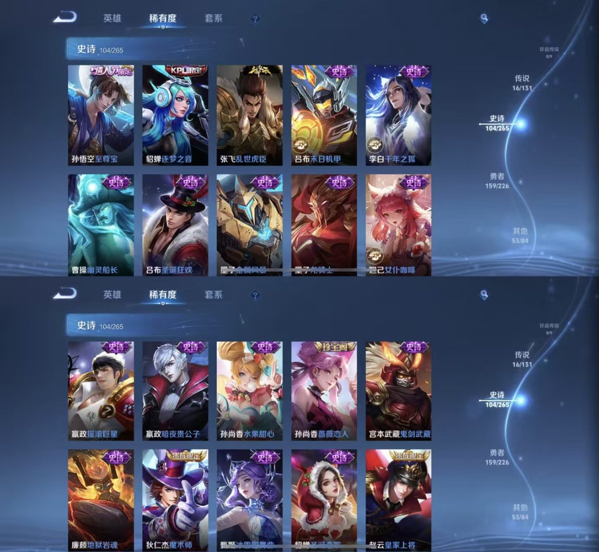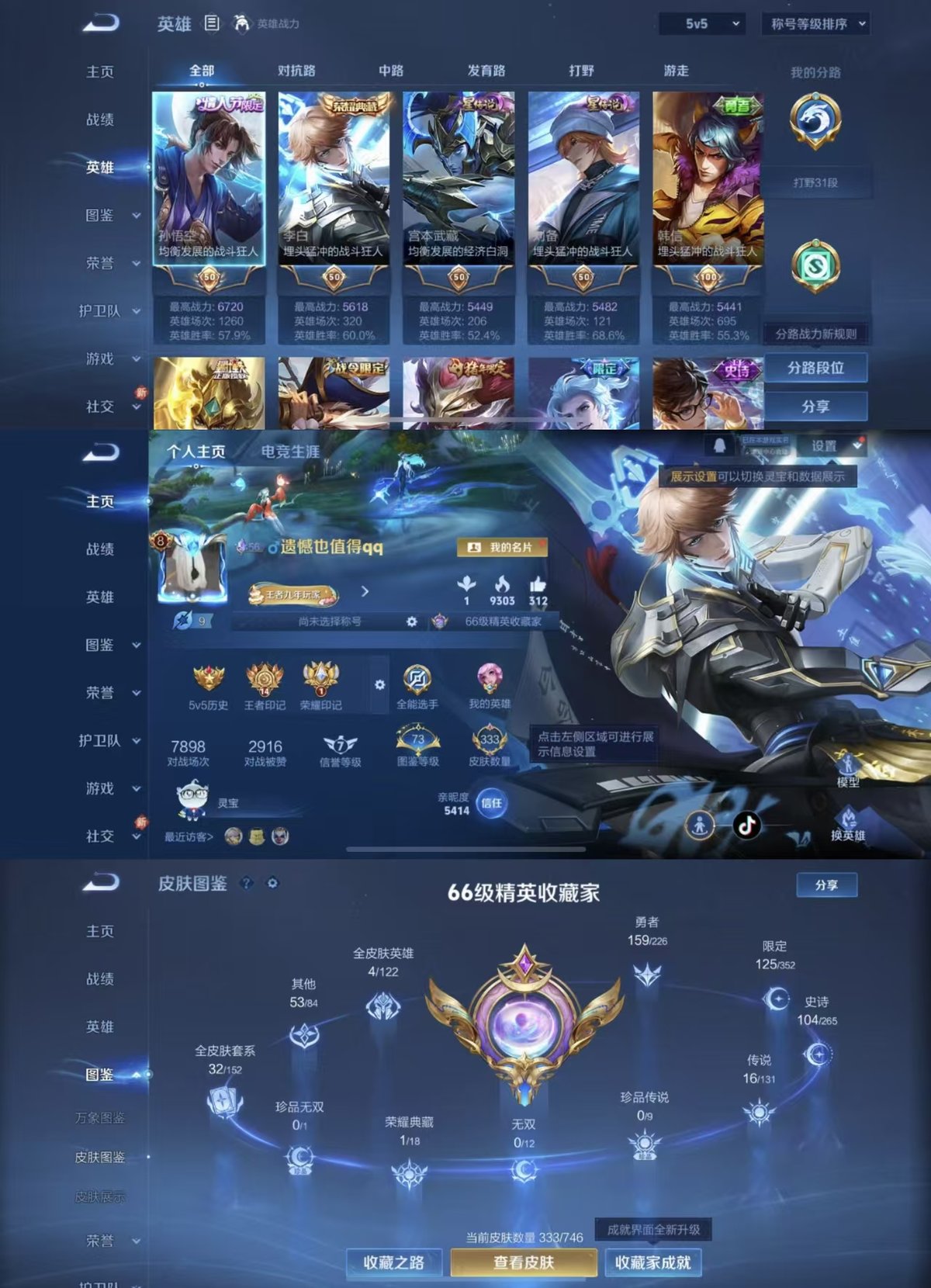 2284993-实名: 可修改 贵族等级: v8 英雄数: 127 皮肤数: 333 荣耀水晶: 鸣剑·曳影 传说皮: 黄金狮子座绛天战甲末日机甲-孙尚香地狱火地狱之眼时之恋人-刘备超时空战士-狄仁杰惊梅引神树通天 限定皮: 李小龙游园惊梦梁祝云端筑梦师时雨天司白晶晶天狼溯光者逐梦之音冰霜恋舞曲天狼运算者逐梦之影白虎志至尊宝大圣娶亲玉兔公主深海之