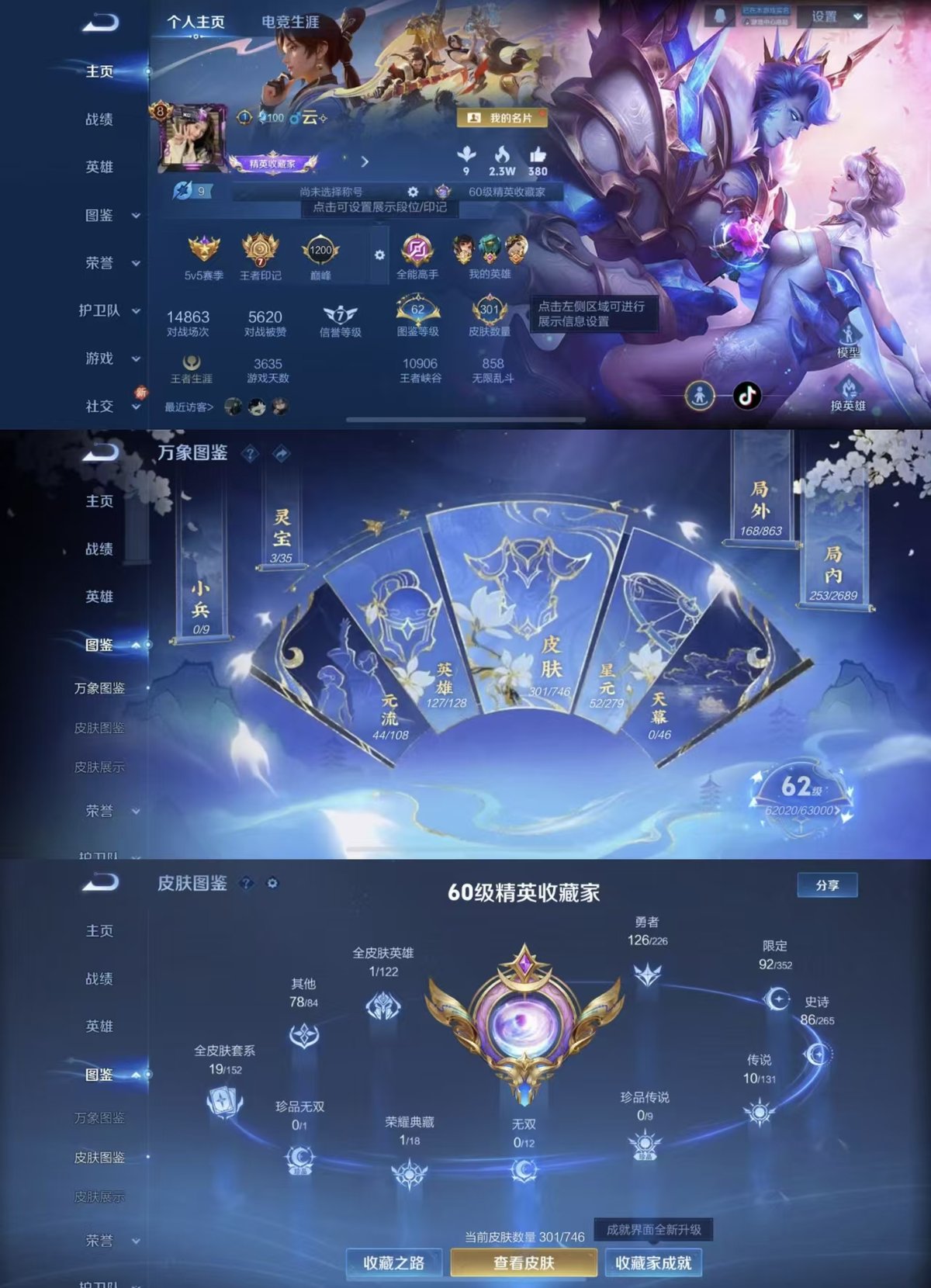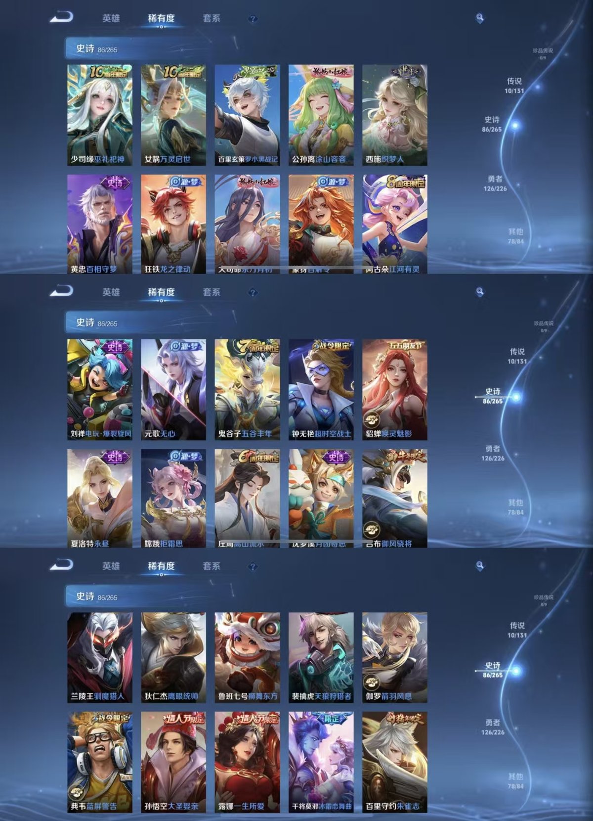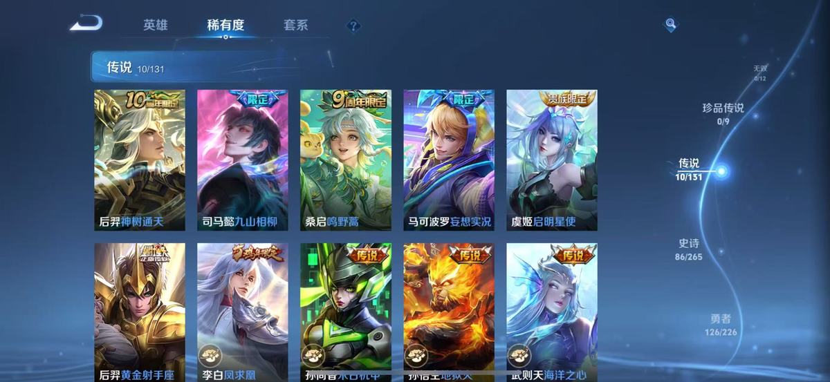 2285041-实名: 可修改 贵族等级: v8 英雄数: 127 皮肤数: 301 荣耀水晶: 武则天杀手不太冷 传说皮: 黄金射手座末日机甲-孙尚香地狱火海洋之心妄想实况九山相柳神树通天 限定皮: 梁祝御风骁将引擎之心天狼征服者天狼狩猎者冰霜恋舞曲逐梦之光天狼绘梦者凤求凰青龙志朱雀志凤凰于飞至尊宝一生所爱大圣娶亲高山流水五谷丰年鸣野蒿