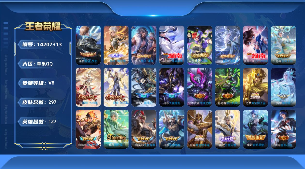 [14207313]可二次 贵族8-297皮1典藏18传说1无双5珍品传说-3个英雄全皮 苹果手q96区297皮1典藏18传说1无双5珍品传说v8 营地id326715799绝世王者【珍品传说皮肤】:兔狲·蓬尾器灵·落星盏时之奇旅江户川柯南怪盗基德【无双皮肤】:器灵·螭龙剑【荣耀典藏】:鸣剑·曳影【优质限定皮肤】:神威至尊宝天魔缭乱【传说皮肤】:黄金狮子座神树通天末日机