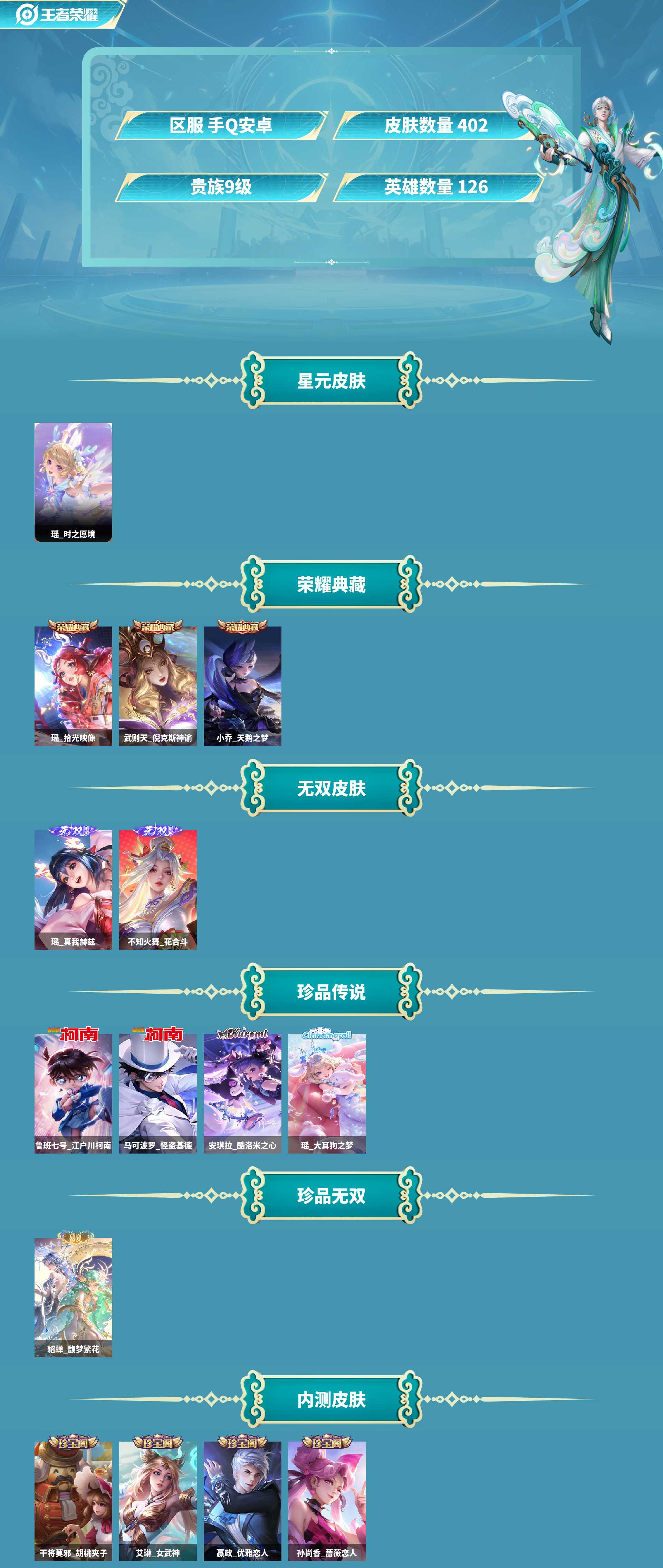 al633651 【特价v9小姐姐一手号403皮肤2无双1珍品无双全皮瑶带紫瑶3个天幕25传说瑶拾光映像,武则天倪克斯神谕,小乔天鹅之梦 武则天瑶真我赫兹,不知火舞花合斗 珍品传说:安琪拉酷洛米之心,瑶大耳狗之梦,马可波罗怪盗基德,鲁班七号江户川柯南 珍品无双:貂蝉馥梦繁花传说皮肤:李元芳飞鸢探春,后裔神树通天,后羿黄金射手座,杨玉环星之鸣奏,蔡文姬愿照福禄聚,妲己愿照众生和,桑启鸣野蒿,小乔山海琳琅生,王昭君映山客,铠曙光守护者,刘备时之恋人,朵莉亚心动手记,王昭君星穹之声,曜李,大乔挚爱花嫁,虞姬启明星使,诸葛亮武陵仙君,瑶时之祈愿,貂蝉遇见胡旋,王昭君乞巧织情,西施游龙清影,小乔音你心动,诸葛亮时雨天司,武则天海洋之心,貂蝉猫影幻舞,貂蝉仲夏夜之梦】 皮肤数401 皮肤价值330700 无双皮肤数2 传说皮肤数25 珍品传说皮数4 星传说皮肤数1 史诗皮肤数122 英雄数126 营地id336824979 贵族等级【文本】贵族9级 【贵族9级】 【可排位】 【是】 星元皮肤1 荣耀典藏3 无双皮肤2 珍品传说4 珍品无双1 内测皮肤4 年限皮肤8 限定皮肤147 赛季限定41 史诗皮肤122 战令限定40 勇者皮肤168 其他皮肤75 星元皮肤:瑶时之愿境; 荣耀典藏:瑶拾光映像,武则天倪克斯神谕,小乔天鹅之梦; 无双皮肤:瑶真我赫兹,不知火舞花合斗; 珍品传说:安琪拉酷洛米之心,瑶大耳狗之梦,马可波罗怪盗基德,鲁班七号江户川柯南; 珍品无双:貂蝉馥梦繁花; 内测皮肤:艾琳女武神,干将莫邪胡桃夹子,嬴政优雅恋人,孙尚香蔷薇恋人; 年限皮肤:蔡文姬愿照福禄聚,妲己愿照众生和,小乔山海琳琅生,瑶山海碧波行,百里守约朱雀志,杨玉环寅虎心曲,诸葛亮时雨天司,王昭君凤凰于飞; 限定皮肤:西施织梦人,鬼谷子克喵,朵莉亚幻珠鲛人,云缨赞萌露比,项羽苍威无极,西施至美乘鲤谣,西施玲珑珍味,白起死霸装,后羿石田雨龙,姬小满小满鸭,扁鹊灵蛊蚀心,貂蝉馥梦繁花,安琪拉酷洛米之心,瑶大耳狗之梦,亚瑟布丁狗之誓,狂铁龙之律动,钟馗虚灵犬护,阿轲化蝶舞,太乙真人华丽摇滚,杨玉环星之鸣奏,妲己灵卜魔法,蔡文姬愿照福禄聚,妲己愿照众生和,艾琳女武神,牛魔星界战将,马超访茗客,孙膑茶境仙,太乙真人谧流熔炉,马可波罗怪盗基德,东皇太一噬灭天穹,吕布逐霄战戟,鲁班七号江户川柯南,桑启鸣野蒿,小乔山海琳琅生,王昭君映山客,艾琳陌上桑,少司缘涂山红红,兰陵王驯魔猎人,蒙犽顽岩魄,蔡文姬夏日便利店,朵莉亚心动手记,虞姬夏日便利店,姜子牙天穹之誓,蒙恬荣光圣徽,刘邦剑破天穹,鬼谷子天穹祈灯,张良古海寻踪,鲁班大师探海日志,裴擒虎擒涛扼浪,暃星界游侠,干将莫邪胡桃夹子,瑶山海碧波行,桑启海盐诗旅,嫦娥暖冬兔眠,梦奇顽趣,钟无艳超时空战士,甄姬落雪兰心,元歌无心,上官婉儿神器万象笔,鬼谷子五谷丰年,王昭君星穹之声,妲己时之奇旅,李元芳云中旅人,妲己热情桑巴,狂铁电玩高手,百里守约朱雀志,沈梦溪大漠名商,曜李,王昭君午后时光,大乔挚爱花嫁,明世隐吟游魔法,白起夜都怪侠,虞姬启明星使,诸葛亮武陵仙君,兰陵王金庭之子,杨玉环寅虎心曲,瑶时之祈愿,达摩沙漠行僧,雅典娜黎明之约,甄姬女儿国国王,嫦娥拒霜思,干将莫邪真爱魔法,庄周高山流水,猪八戒猪悟能,苏烈千军破阵,貂蝉遇见胡旋,后羿圣弓游侠,嬴政优雅恋人,老夫子航海奇遇记,大乔白鹤梁神女,钟馗驱傩正仪,墨子神迹守卫,米莱狄胡桃异想国,程咬金演武夺筹,达摩星际陆战队,元歌云间偶戏,诸葛亮时雨天司,狄仁杰万华元夜,亚瑟潮玩骑士王,云中君纤云弄巧,