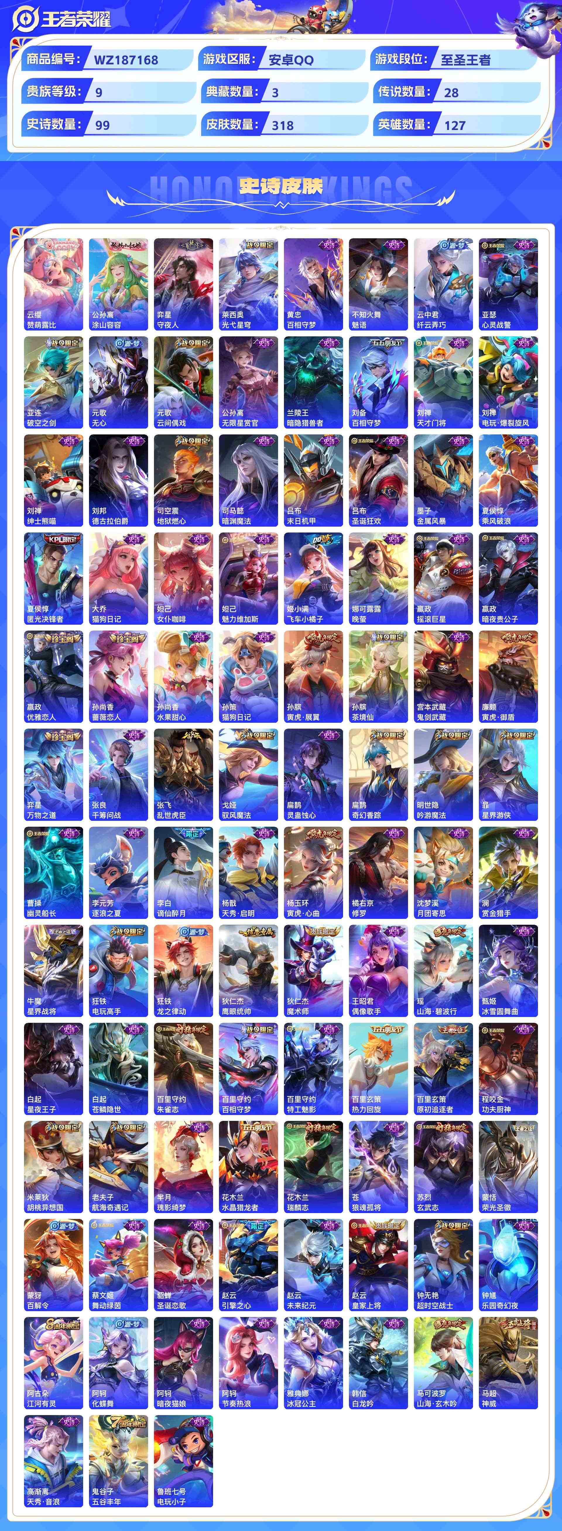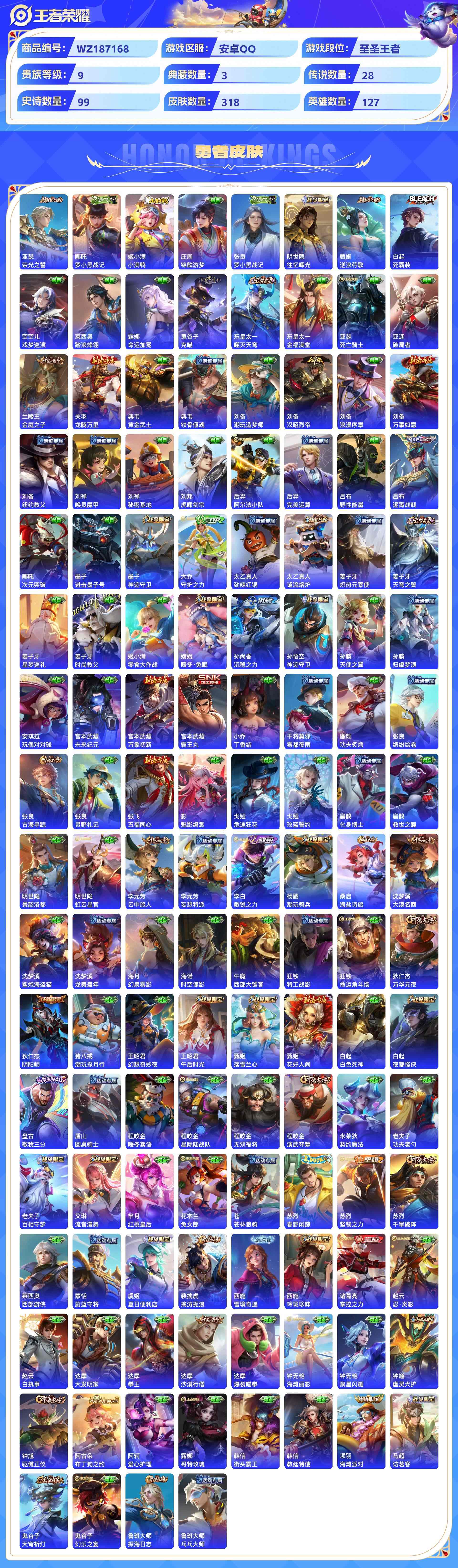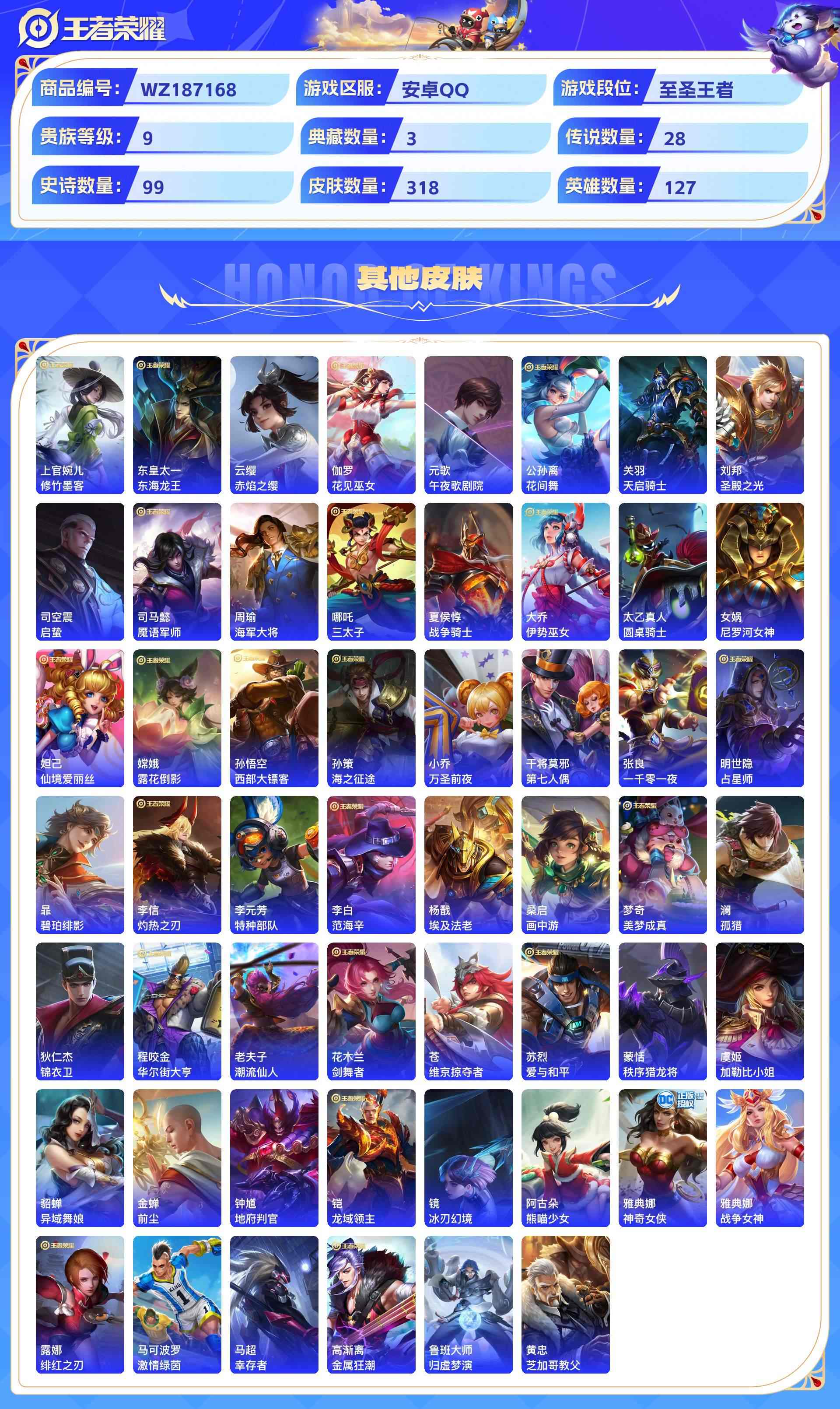 wz187168|极品号【荣耀典藏】星域神启银白咏叹调弑呛猎影【珍品传说】器灵·落星盏时之奇旅怪盗基德【传说皮肤】幻光神呛愿照·山河定无尽星芒浮生妄玄雷天君音你闪耀零号·赤焰齐天大圣末日机甲惊梅引地狱之眼山海·琳琅生久胜战神山海·苍雷引李 一念神魔山海·炽霜斩鸣野蒿安卓qq 贵族9级 318皮 3典藏 3珍品传说 28传说 99史诗3星传说26个性按键2天幕