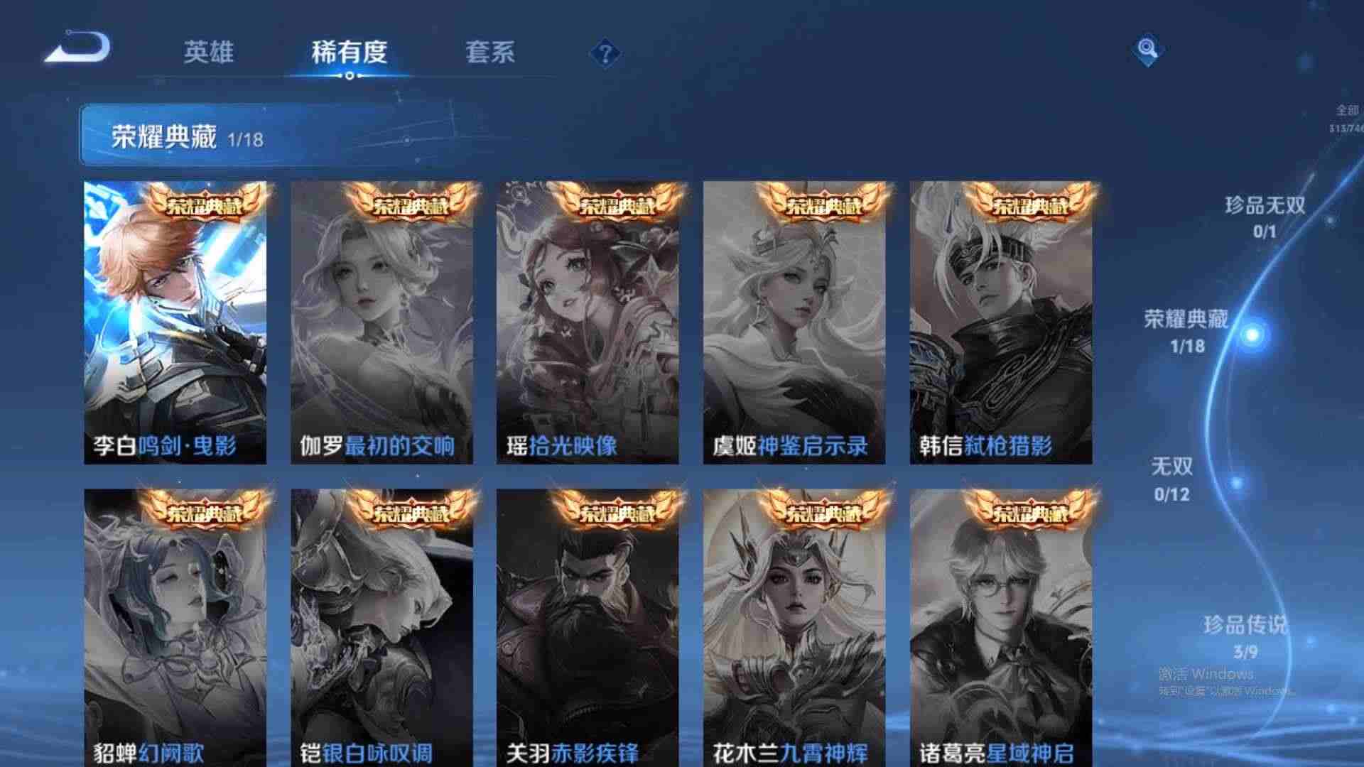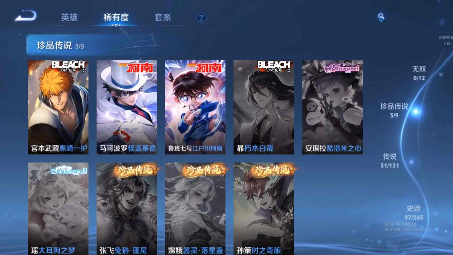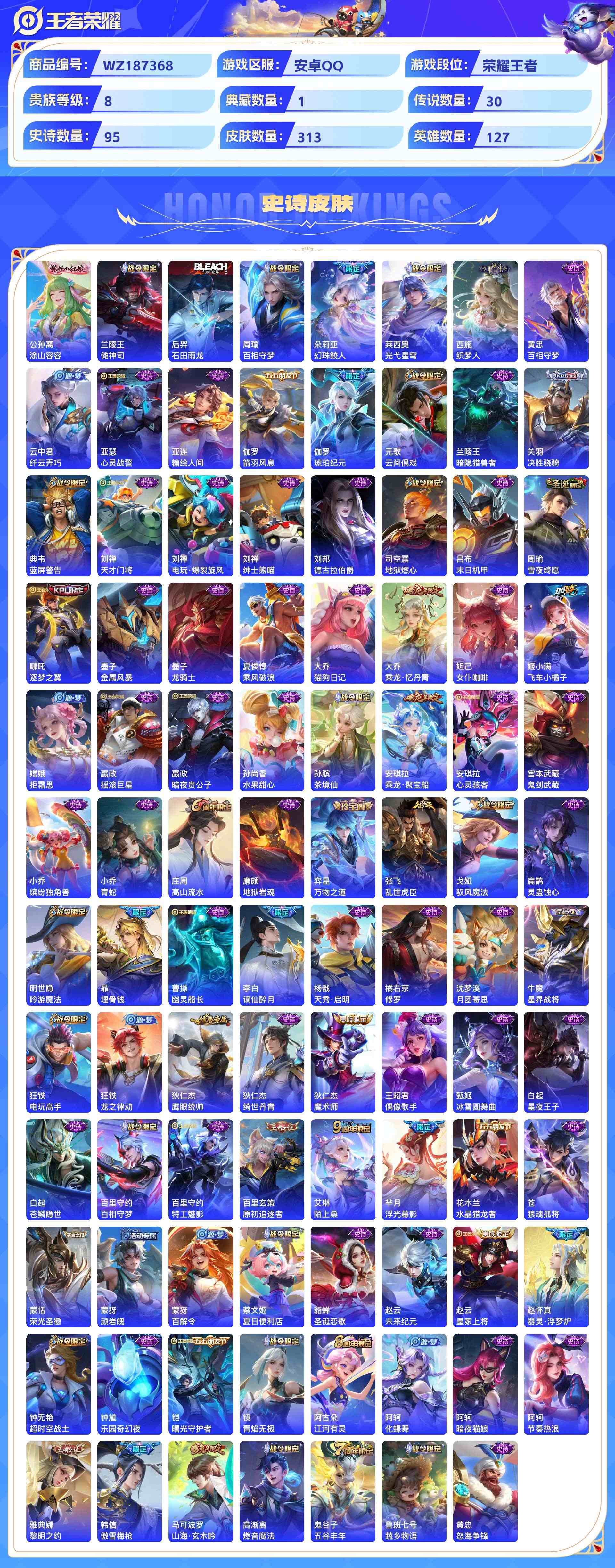 wz187368|精品号【荣耀典藏】鸣剑·曳影【珍品传说】黑崎一护怪盗基德江户川柯南【传说皮肤】绯月行幻光神呛云诺千山愿照·山河定黄金天蝎座霜北刀愿照·千秋盛愿照·众生和玄雷天君乘龙·问璇玑异界灵契安卓qq 贵族8级 313皮 1典藏 3珍品传说 30传说 95史诗1星传说51个性按键