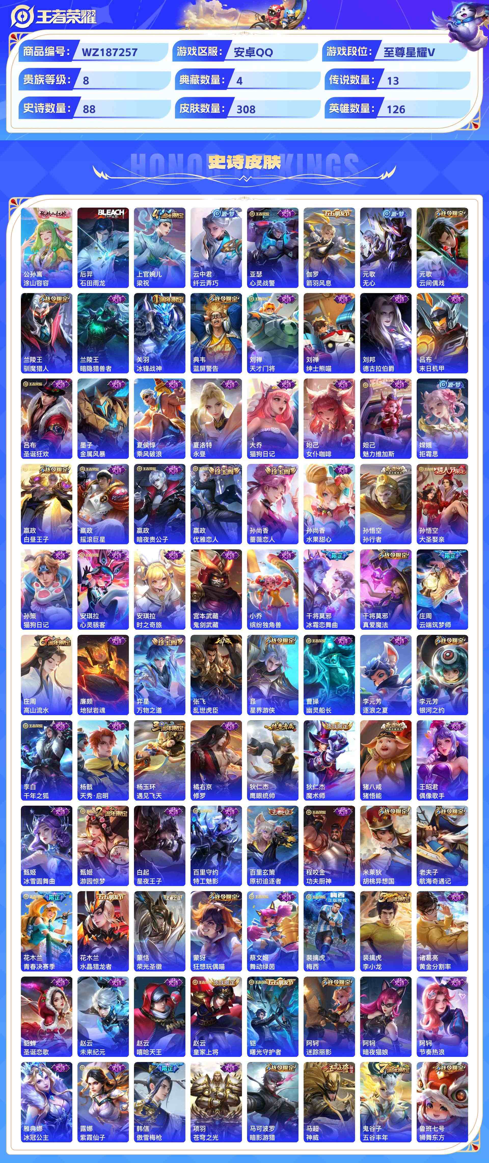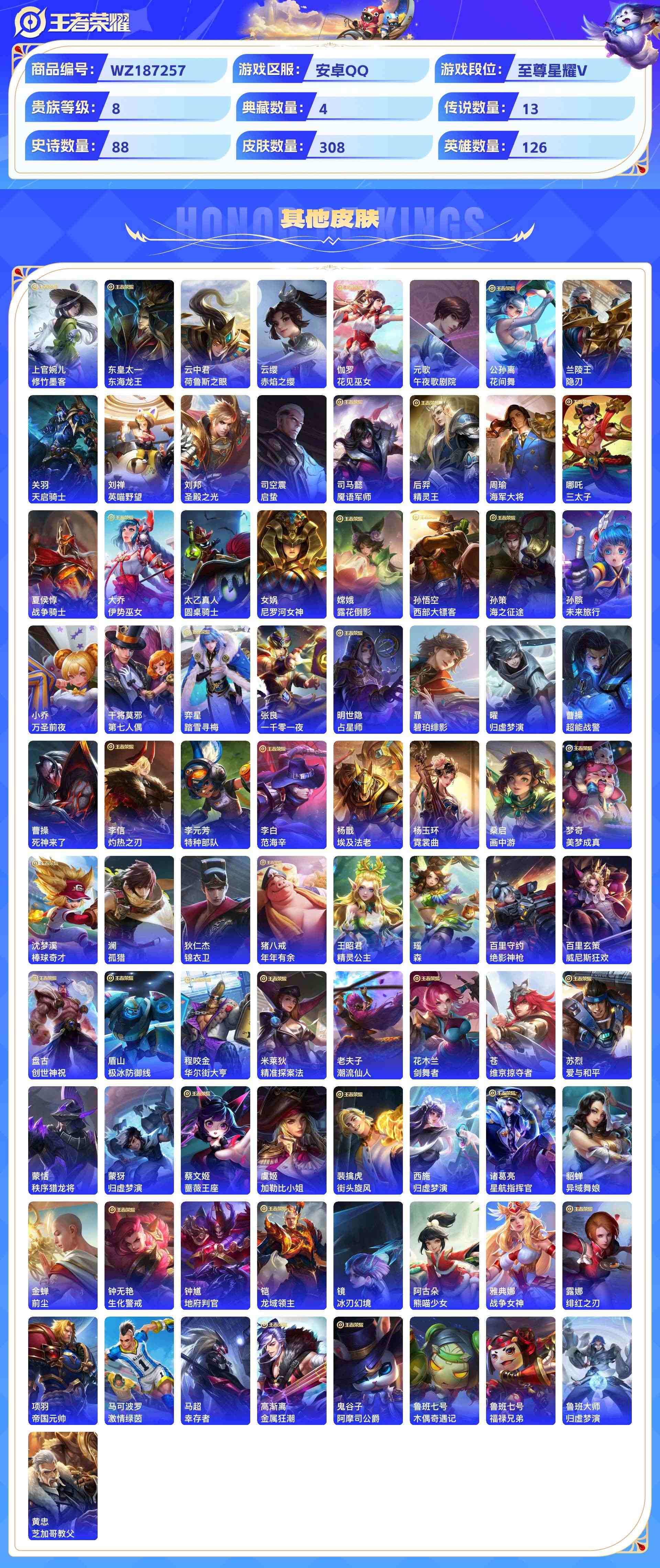 wz187257|精品金标号1金标(夏侯惇)【荣耀典藏】无限飓风号全息碎影鸣剑·曳影星空梦想【传说皮肤】黄金射手座末日机甲地狱火地狱之眼凤求凰诗剑行鸣野蒿超时空战士白虎志云霓雀翎启明星使时雨天司炽阳神光安卓qq 贵族8级 308皮 4典藏 13传说 88史诗天幕