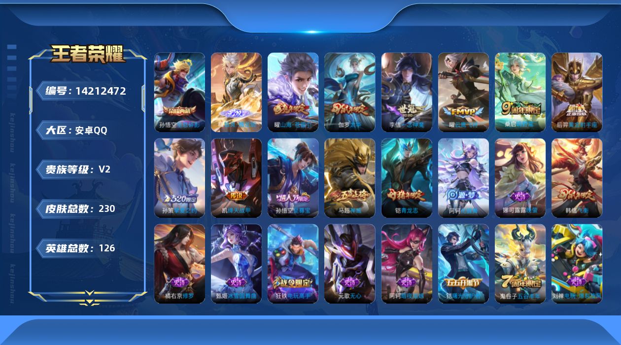[14212472]可二次 贵族7-230皮-1典藏-8传说-1无双-0珍品传说-珍品无双0-全皮1-灵宠改名卡1 禁榜到26年6月2日 安卓手q374区 营地id1721501545永恒钻石v【无双皮肤】:器灵·螭龙剑【荣耀典藏】:全息碎影【优质限定皮肤】:至尊宝山海·苍雷引神威【传说皮肤】:鸣野蒿山海·苍雷引云鹰飞将黄金射手座挚爱之约太华绛天战甲一念神魔【史诗皮肤】:星夜王
