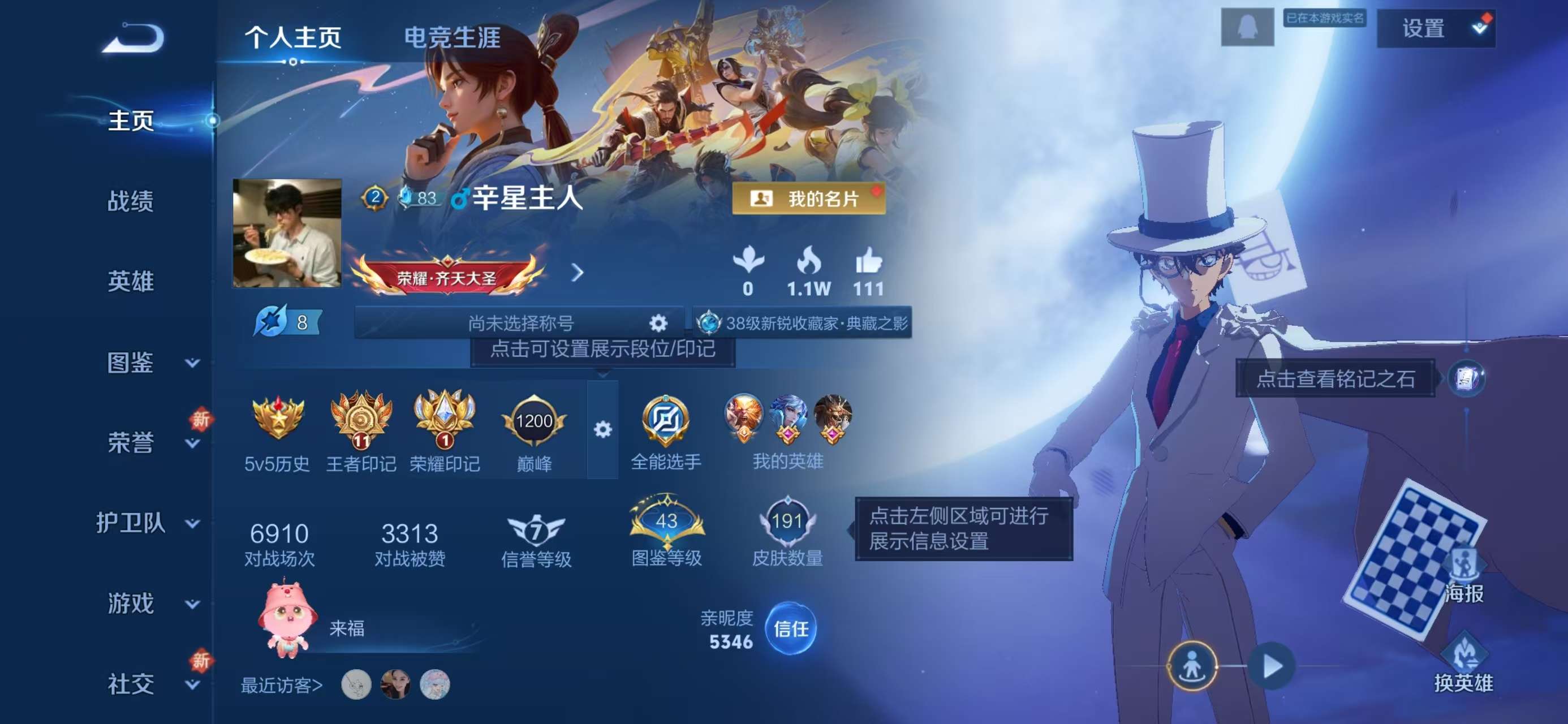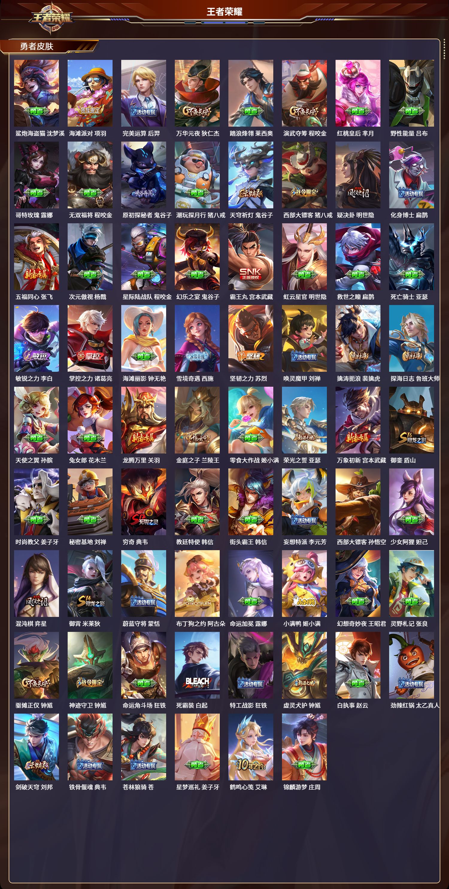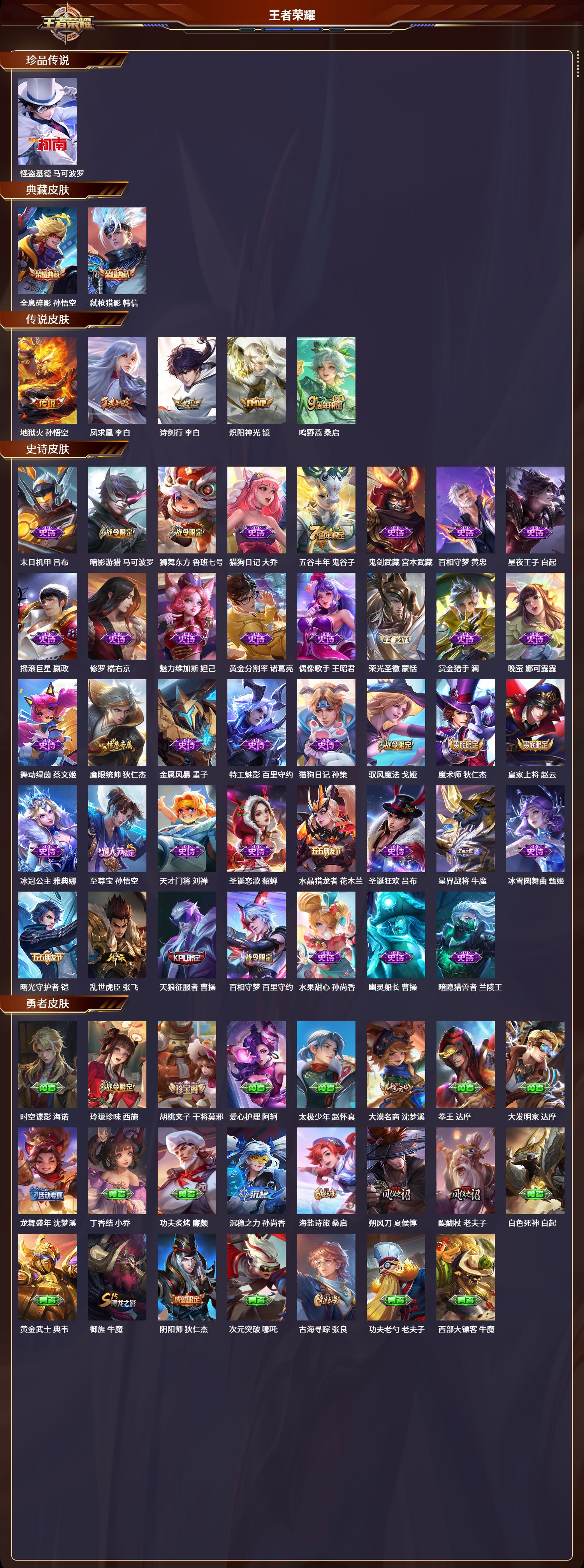 安卓qq/最强王者/191皮肤/126英雄/2典藏/0珍品无双/0无双/1珍品传说/5传说/39史诗/8稀有英雄【1 珍品传说】怪盗基德 马可波罗【2 典藏皮肤】全息碎影 孙悟空弑呛猎影 韩信【5 传说皮肤】地狱火 孙悟空凤求凰 李白诗剑行 李白炽阳神光 镜鸣野蒿 桑启【39 史诗皮肤】末日机甲 吕布暗影游猎 马可波罗狮舞东方 鲁班七号猫狗日记 大乔五谷