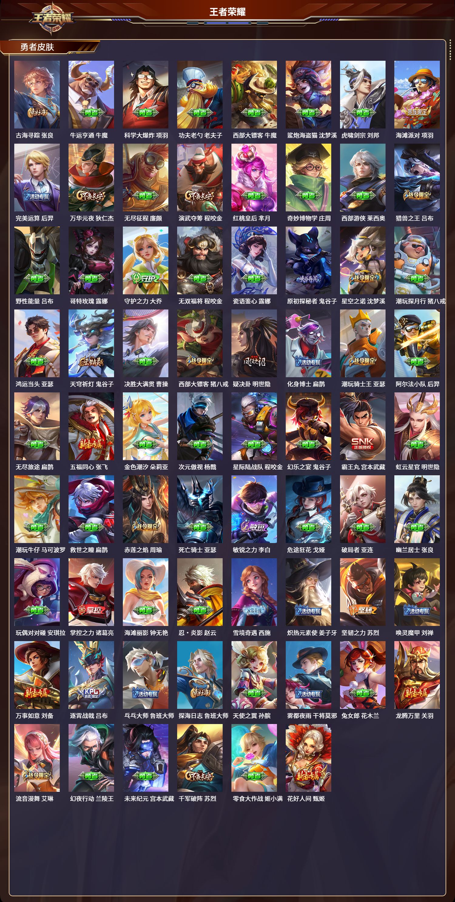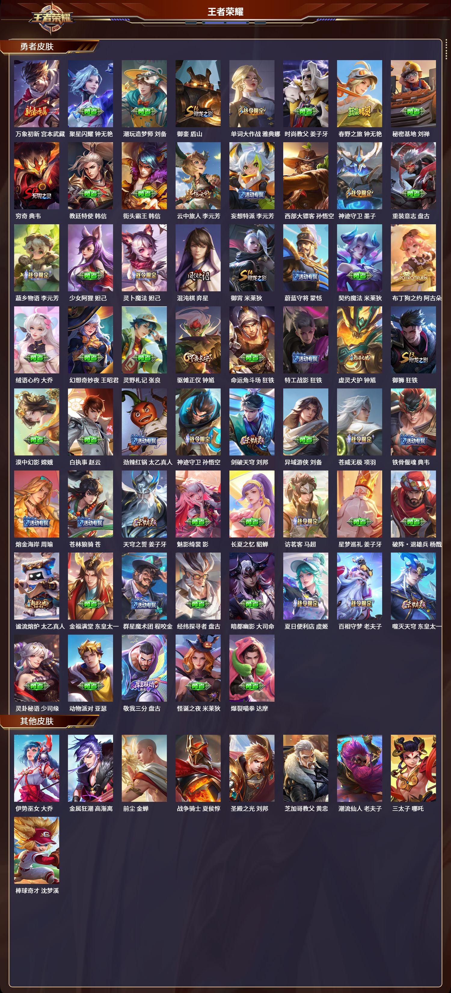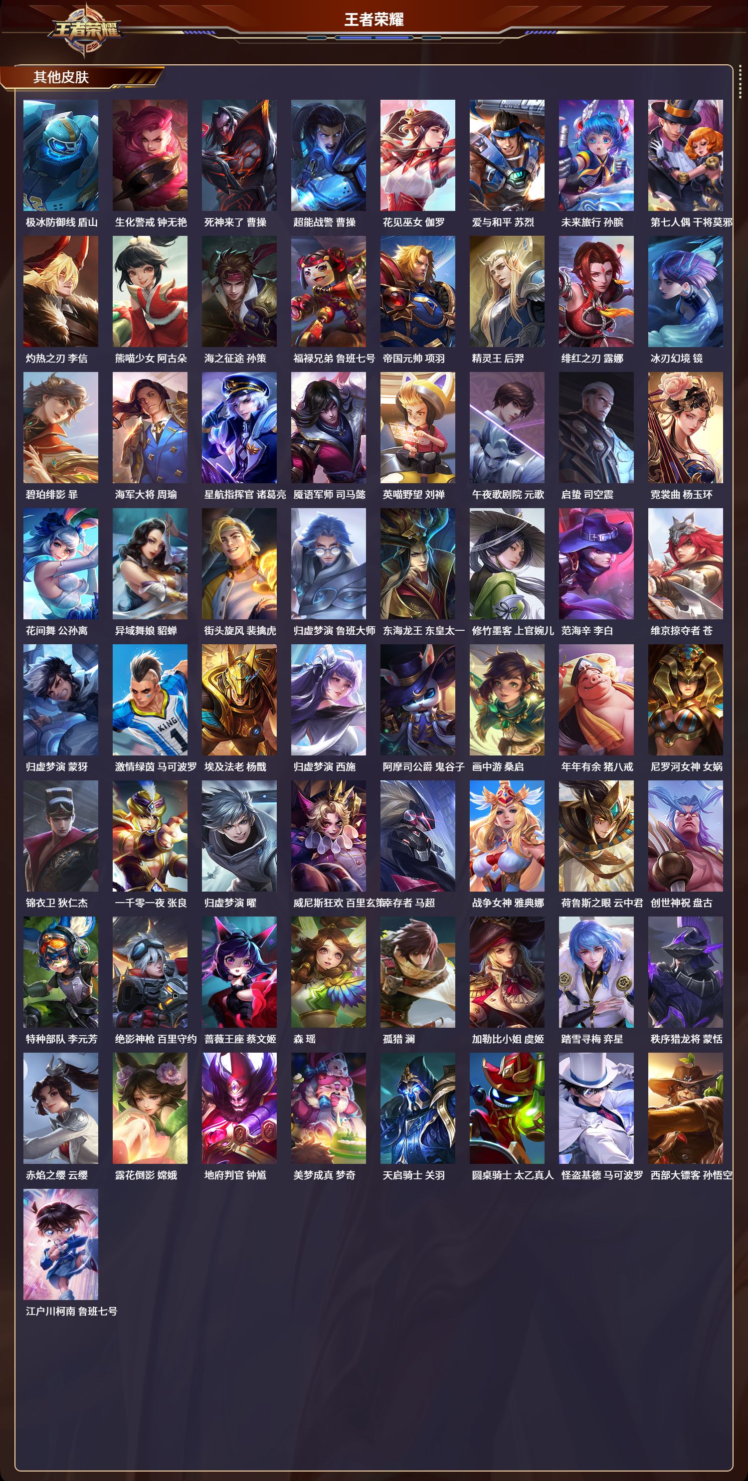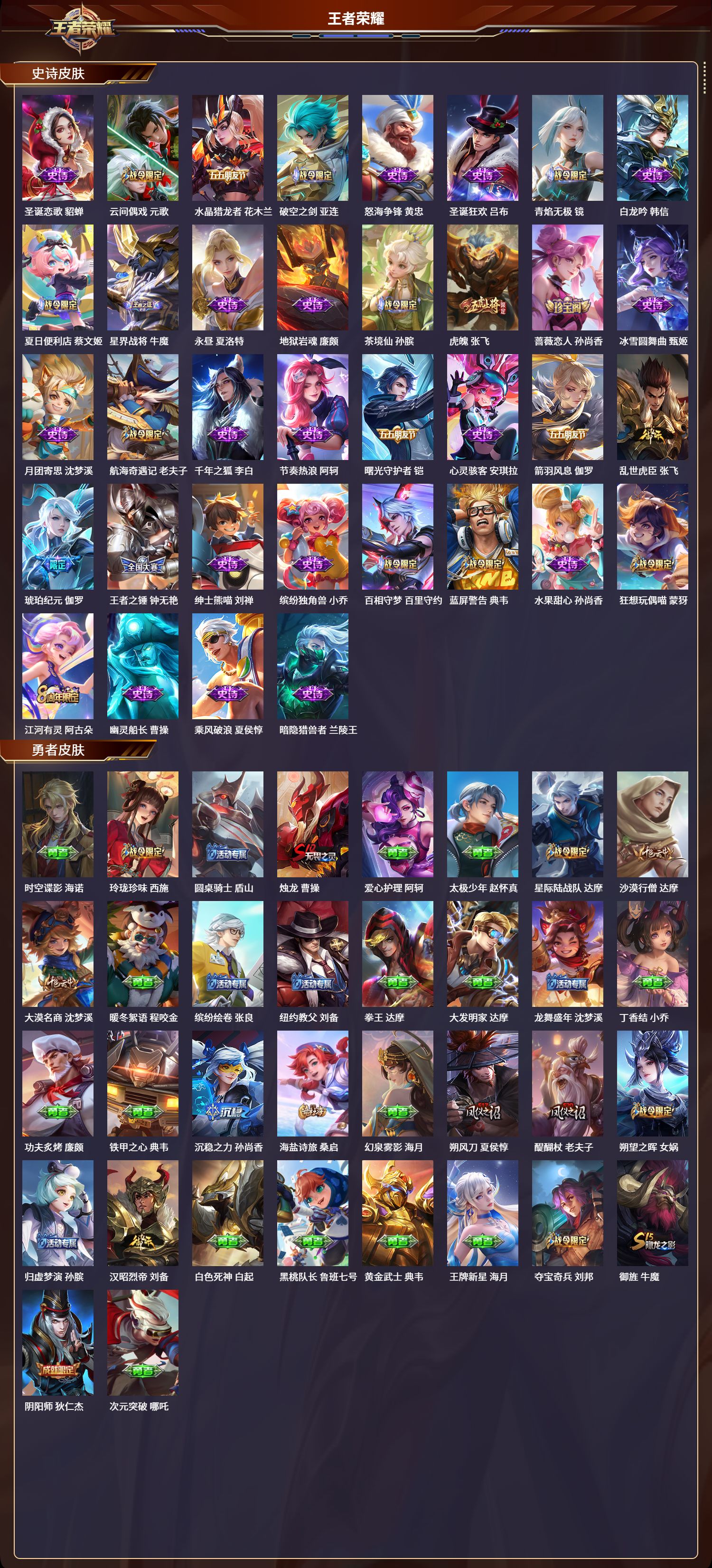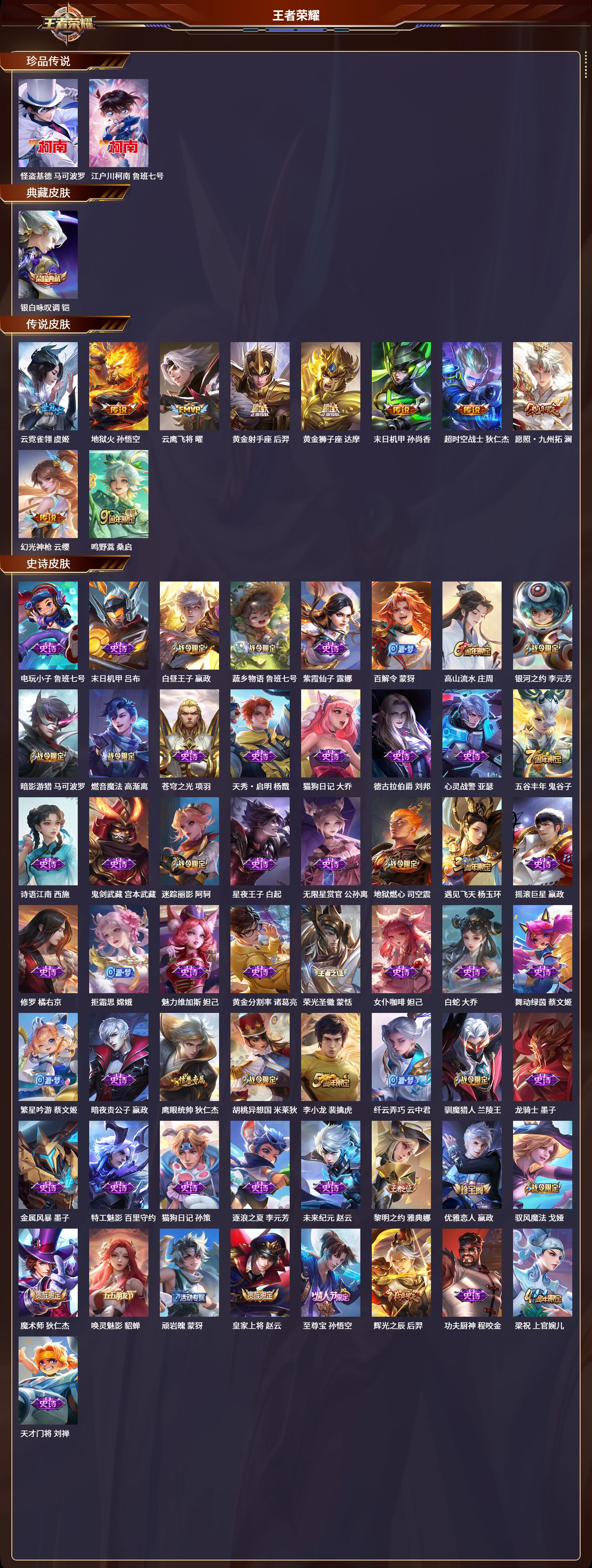 安卓qq/尊贵铂金/342皮肤/127英雄/1典藏/0珍品无双/0无双/2珍品传说/10传说/93史诗/9稀有英雄【2 珍品传说】怪盗基德 马可波罗江户川柯南 鲁班七号【1 典藏皮肤】银白咏叹调 铠【10 传说皮肤】云霓雀翎 虞姬地狱火 孙悟空云鹰飞将 曜黄金射手座 后羿黄金狮子座 达摩末日机甲 孙尚香超时空战士 狄仁杰愿照·九州拓 澜幻光神呛 云缨鸣野