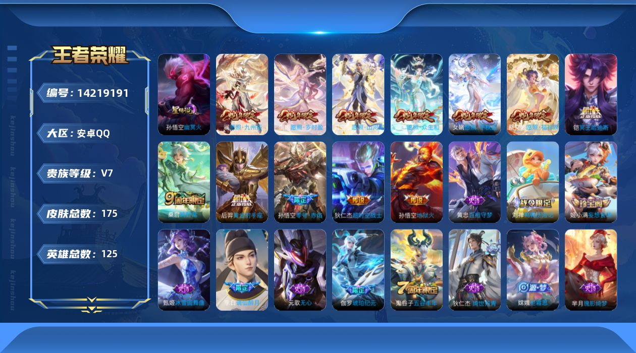 [14219191]蛇限满套,安卓q-v7-175皮肤-13传说-34史诗 【传说皮肤】:后羿神树通天,司空震愿照山河定,女娲愿照千秋盛,妲己愿照众生和,澜愿照九州拓,蔡文姬愿照福禄聚,虞姬愿照岁时盈,桑启鸣野蒿,铠冥王哈迪斯,孙悟空零号赤焰,后羿黄金射手座,孙悟空地狱火,狄仁杰超时空战士 【限定皮肤】:铠冥王哈迪斯,蔡文姬夏日便利店,大乔绒语心约,虞姬夏日便利店,姜子牙天穹之誓,李白谪仙醉月,狄仁杰阴阳师,赵云皇家上将,墨子神迹守卫,孙尚香蔷薇恋人,元歌无心,夏侯惇朔风刀,狄仁杰魔术师,狄仁杰万华元夜,达摩沙漠行僧,项羽海滩派对,程咬金演武夺筹,兰陵王金庭之子,亚瑟潮玩骑士王,孙悟空零号赤焰,牛魔御旌,李元芳云中旅人,雅典娜单词大作战,鬼谷子原初探秘者,鬼谷子五谷丰年,弈星混沌棋,沈梦溪大漠名商,裴擒虎擒涛扼浪,狂铁御狮,米莱狄御霄,云中君纤云弄巧,盾山御銮,嫦娥拒霜思,鲁班大师探海日志,桑启海盐诗旅,阿古朵江河有灵,张良古海寻踪,蒙犽百解令,鬼谷子天穹祈灯,伽罗琥珀纪元,姬小满妄想食味,沈梦溪龙舞盛年,刘邦剑破天穹,刘备异域游侠,周瑜熔金海岸 【赛季限定】:夏侯惇朔风刀,狄仁杰万华元夜,达摩沙漠行僧,程咬金演武夺筹,兰陵王金庭之子,张良古海寻踪,牛魔御旌,李元芳云中旅人,鬼谷子原初探秘者,弈星混沌棋,沈梦溪大漠名商,裴擒虎擒涛扼浪,狂铁御狮,米莱狄御霄,盾山御銮,鲁班大师探海日志,桑启海盐诗旅,鬼谷子天穹祈灯,刘邦剑破天穹,姜子牙天穹之誓 【战令限定】:墨子神迹守卫,蔡文姬夏日便利店,虞姬夏日便利店,亚瑟潮玩骑士王,雅典娜单词大作战 【史诗皮肤】:赵云皇家上将,甄姬冰雪圆舞曲,狄仁杰魔术师,宫本武藏鬼剑武藏,孙尚香蔷薇恋人,孙尚香水果甜心,嬴政摇滚巨星,妲己魅力维加斯,墨子金属风暴,吕布圣诞狂欢,李白千年之狐,张飞乱世虎臣,诸葛亮黄金分割率,雅典娜冰冠公主,安琪拉心灵骇客,程咬金功夫厨神,白起星夜王子,狄仁杰鹰眼统帅,云中君纤云弄巧,嫦娥拒霜思,鬼谷子五谷丰年,元歌无心,阿古朵江河有灵,蒙犽百解令,伽罗琥珀纪元,姬小满妄想食味,黄忠怒海争锋,蔡文姬夏日便利店,李白谪仙醉月,孙膑茶境仙,狄仁杰绮世丹青,芈月瑰影绮梦,刘禅鸭鸭历险记,黄忠百相守梦 【其他皮肤】:项羽海滩派对,韩信教廷特使,露娜哥特玫瑰,阿轲爱心护理,芈月红桃皇后,牛魔西部大镖客,庄周鲤鱼之梦,宫本武藏未来纪元,安琪拉