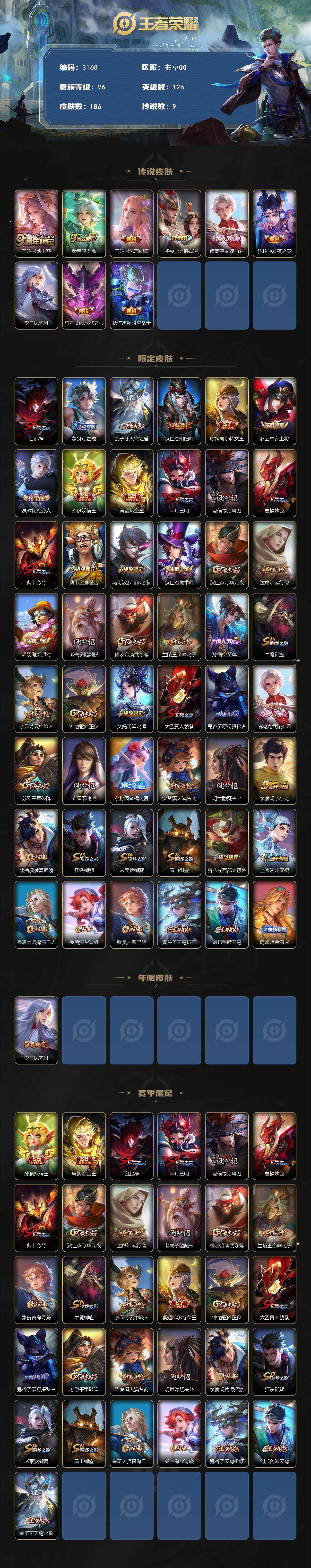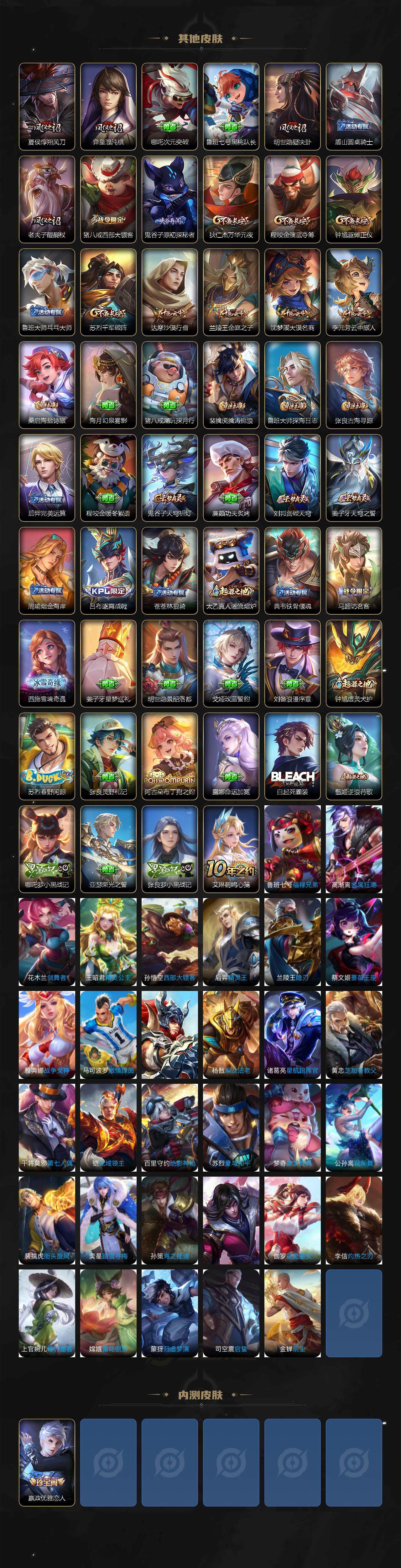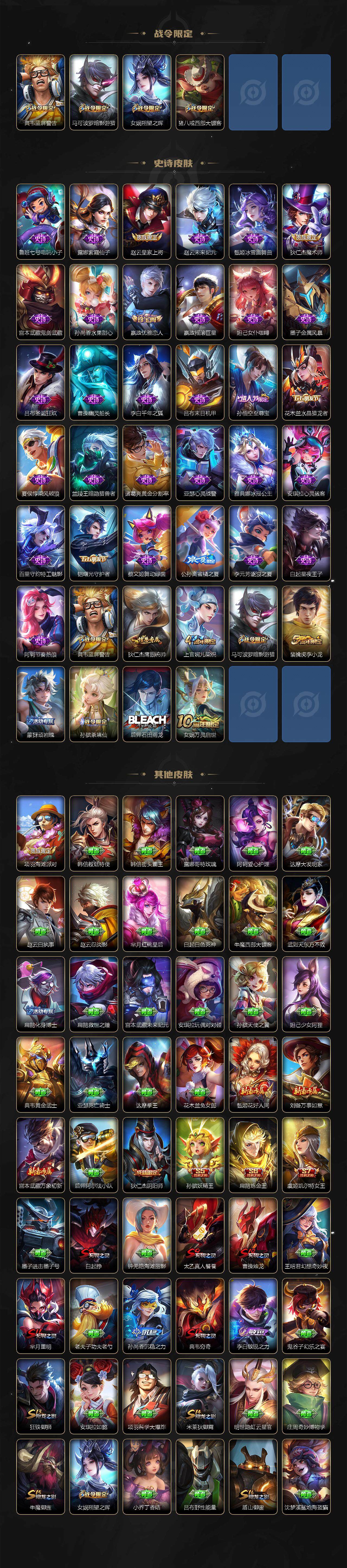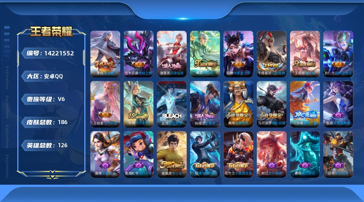 [14221552]安卓q-v5-最强王者段位-126英雄-186皮肤-9传说-40史诗 【传说皮肤】:王昭君映山客,桑启鸣野蒿,王昭君乞巧织情,干将莫邪久胜战神,诸葛亮武陵仙君,貂蝉仲夏夜之梦,李白凤求凰,宫本武藏地狱之眼,狄仁杰超时空战士 【限定皮肤】:白起狰,蒙犽顽岩魄,姜子牙天穹之誓,狄仁杰阴阳师,虞姬凯尔特女王,赵云皇家上将,嬴政优雅恋人,孙膑妖精王,扁鹊炼金王,芈月重明,夏侯惇朔风刀,曹操烛龙,典韦穷奇,典韦蓝屏警告,马可波罗暗影游猎,狄仁杰魔术师,狄仁杰万华元夜,达摩沙漠行僧,项羽海滩派对,老夫子醍醐杖,程咬金演武夺筹,兰陵王金庭之子,孙悟空至尊宝,牛魔御旌,李元芳云中旅人,钟馗驱傩正仪,女娲朔望之晖,太乙真人饕餮,鬼谷子原初探秘者,诸葛亮武陵仙君,苏烈千军破阵,弈星混沌棋,公孙离蜜橘之夏,沈梦溪大漠名商,明世隐疑决卦,裴擒虎李小龙,裴擒虎擒涛扼浪,狂铁御狮,米莱狄御霄,盾山御銮,猪八戒西部大镖客,上官婉儿梁祝,鲁班大师探海日志,桑启海盐诗旅,张良古海寻踪,鬼谷子天穹祈灯,刘邦剑破天穹,周瑜熔金海岸 【年限皮肤】:李白凤求凰 【赛季限定】:孙膑妖精王,扁鹊炼金王,白起狰,芈月重明,夏侯惇朔风刀,曹操烛龙,典韦穷奇,狄仁杰万华元夜,达摩沙漠行僧,老夫子醍醐杖,程咬金演武夺筹,兰陵王金庭之子,张良古海寻踪,牛魔御旌,李元芳云中旅人,虞姬凯尔特女王,钟馗驱傩正仪,太乙真人饕餮,鬼谷子原初探秘者,苏烈千军破阵,弈星混沌棋,沈梦溪大漠名商,明世隐疑决卦,裴擒虎擒涛扼浪,狂铁御狮,米莱狄御霄,盾山御銮,鲁班大师探海日志,桑启海盐诗旅,鬼谷子天穹祈灯,刘邦剑破天穹,姜子牙天穹之誓 【战令限定】:典韦蓝屏警告,马可波罗暗影游猎,女娲朔望之晖,猪八戒西部大镖客 【史诗皮肤】:鲁班七号电玩小子,露娜紫霞仙子,赵云皇家上将,赵云未来纪元,甄姬冰雪圆舞曲,狄仁杰魔术师,宫本武藏鬼剑武藏,孙尚香水果甜心,嬴政优雅恋人,嬴政摇滚巨星,妲己女仆咖啡,墨子金属风暴,吕布圣诞狂欢,曹操幽灵船长,李白千年之狐,吕布末日机甲,孙悟空至尊宝,花木兰水晶猎龙者,夏侯惇乘风破浪,兰陵王暗隐猎兽者,诸葛亮黄金分割率,亚瑟心灵战警,雅典娜冰冠公主,安琪拉心灵骇客,百里守约特工魅影,铠曙光守护者,蔡文姬舞动绿茵,公孙离蜜橘之夏,李元芳逐浪之夏,白起星夜王子,阿轲节奏热浪,典韦蓝屏警告,狄仁杰鹰眼统帅,上官婉儿梁祝,马可