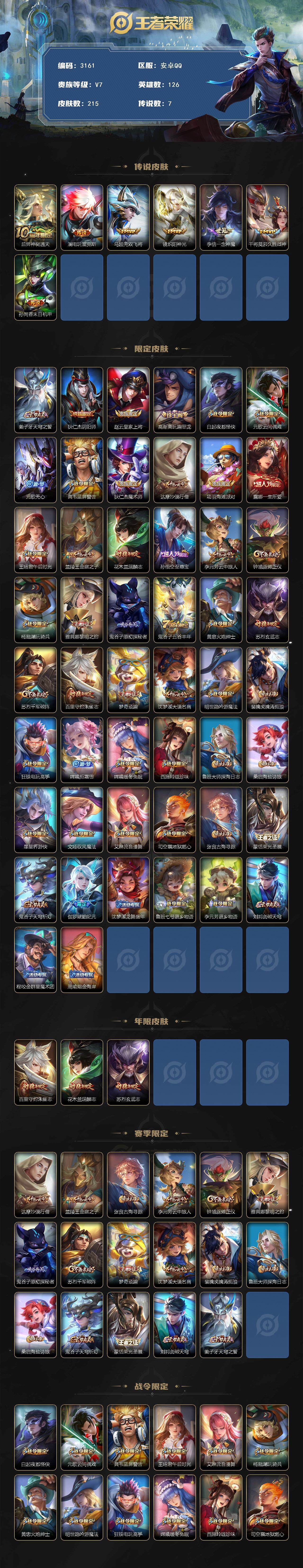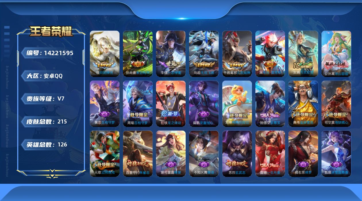 [14221595]安卓q-v7-最强王者段位-126英雄-215皮肤-7传说-64史诗 【英雄全皮】:鬼谷子全皮 【传说皮肤】:后羿神树通天,澜电玩雷克斯,马超无双飞将,镜炽阳神光,李信一念神魔,干将莫邪久胜战神,孙尚香末日机甲 【限定皮肤】:姜子牙天穹之誓,狄仁杰阴阳师,赵云皇家上将,高渐离玩趣恶龙,白起夜都怪侠,元歌云间偶戏,元歌无心,典韦蓝屏警告,狄仁杰魔术师,达摩沙漠行僧,项羽海滩派对,露娜一生所爱,王昭君午后时光,兰陵王金庭之子,花木兰瑞麟志,孙悟空至尊宝,李元芳云中旅人,钟馗驱傩正仪,杨戬潮玩骑兵,雅典娜黎明之约,鬼谷子原初探秘者,鬼谷子五谷丰年,黄忠火炮绅士,苏烈玄武志,苏烈千军破阵,百里守约朱雀志,梦奇顽趣,沈梦溪大漠名商,明世隐吟游魔法,裴擒虎擒涛扼浪,狂铁电玩高手,嫦娥拒霜思,嫦娥暖冬兔眠,西施玲珑珍味,鲁班大师探海日志,桑启海盐诗旅,暃星界游侠,戈娅驭风魔法,艾琳流音漫舞,司空震地狱燃心,张良古海寻踪,蒙恬荣光圣徽,鬼谷子天穹祈灯,伽罗琥珀纪元,沈梦溪龙舞盛年,鲁班七号蔬乡物语,李元芳蔬乡物语,刘邦剑破天穹,程咬金群星魔术团,周瑜熔金海岸 【年限皮肤】:百里守约朱雀志,花木兰瑞麟志,苏烈玄武志 【赛季限定】:达摩沙漠行僧,兰陵王金庭之子,张良古海寻踪,李元芳云中旅人,钟馗驱傩正仪,雅典娜黎明之约,鬼谷子原初探秘者,苏烈千军破阵,梦奇顽趣,沈梦溪大漠名商,裴擒虎擒涛扼浪,鲁班大师探海日志,桑启海盐诗旅,鬼谷子天穹祈灯,蒙恬荣光圣徽,刘邦剑破天穹,姜子牙天穹之誓 【战令限定】:白起夜都怪侠,元歌云间偶戏,典韦蓝屏警告,王昭君午后时光,艾琳流音漫舞,杨戬潮玩骑兵,黄忠火炮绅士,明世隐吟游魔法,狂铁电玩高手,嫦娥暖冬兔眠,西施玲珑珍味,司空震地狱燃心,暃星界游侠,戈娅驭风魔法,鲁班七号蔬乡物语,李元芳蔬乡物语 【史诗皮肤】:鲁班七号电玩小子,赵云皇家上将,甄姬冰雪圆舞曲,王昭君偶像歌手,狄仁杰魔术师,宫本武藏鬼剑武藏,孙尚香水果甜心,嬴政摇滚巨星,妲己魅力维加斯,妲己女仆咖啡,墨子金属风暴,刘禅绅士熊喵,曹操幽灵船长,吕布末日机甲,张飞乱世虎臣,孙悟空至尊宝,花木兰水晶猎龙者,夏侯惇乘风破浪,小乔缤纷独角兽,兰陵王暗隐猎兽者,诸葛亮黄金分割率,安琪拉心灵骇客,百里守约特工魅影,铠曙光守护者,白起星夜王子,阿轲节奏热浪,孙策猫狗日记,百里守约朱雀志,露娜一生所爱,苏烈玄