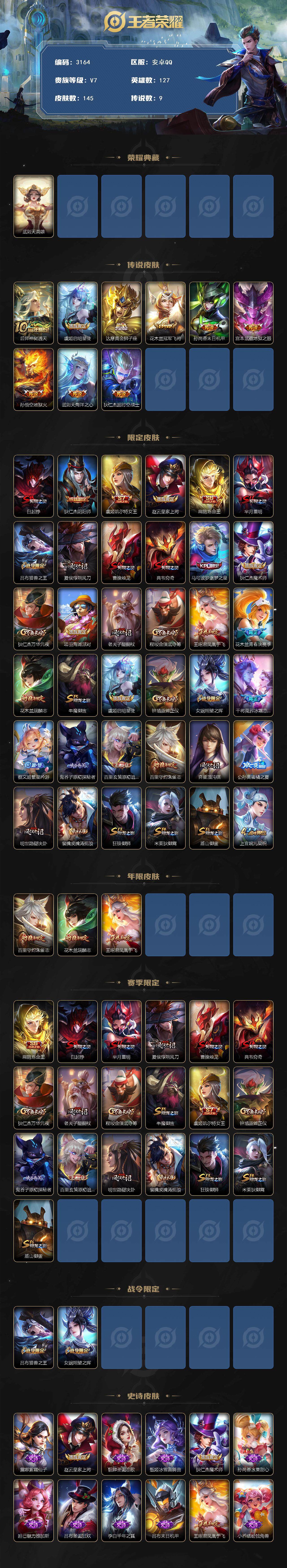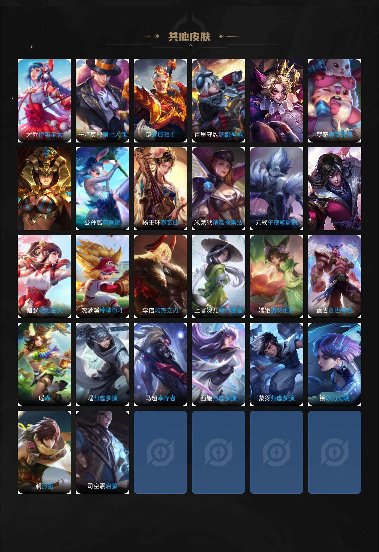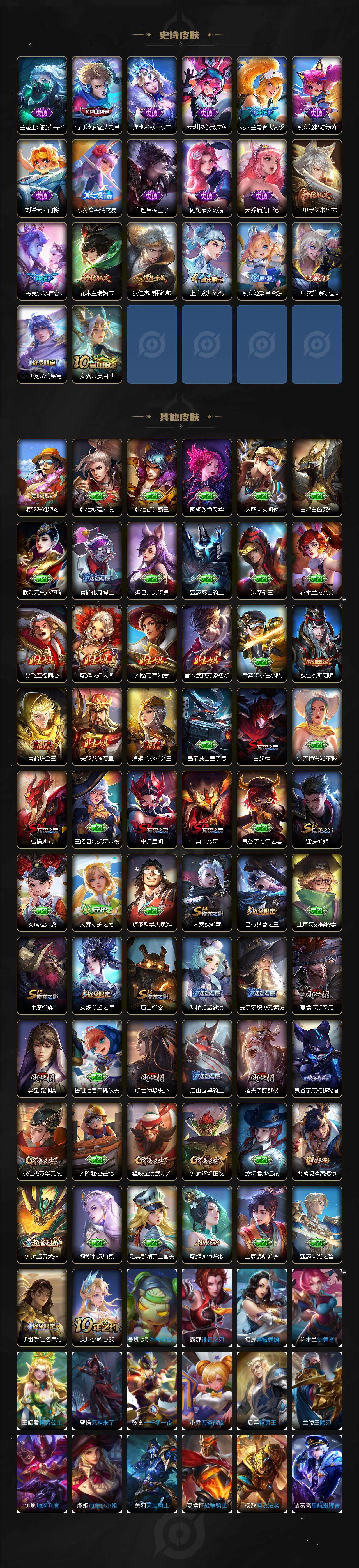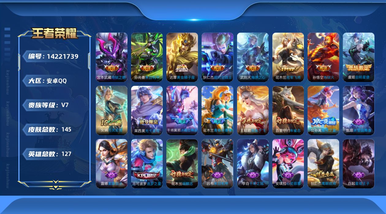 [14221739]安卓q-v7-最强王者段位-127英雄-145皮肤-1典藏英雄-9传说-32史诗 【荣耀典藏】:武则天英雄 【传说皮肤】:后羿神树通天,虞姬启明星使,达摩黄金狮子座,花木兰冠军飞将,孙尚香末日机甲,宫本武藏地狱之眼,孙悟空地狱火,武则天海洋之心,狄仁杰超时空战士 【限定皮肤】:白起狰,狄仁杰阴阳师,虞姬凯尔特女王,赵云皇家上将,扁鹊炼金王,芈月重明,吕布猎兽之王,夏侯惇朔风刀,曹操烛龙,典韦穷奇,马可波罗逐梦之星,狄仁杰魔术师,狄仁杰万华元夜,项羽海滩派对,老夫子醍醐杖,程咬金演武夺筹,王昭君凤凰于飞,花木兰青春决赛季,花木兰瑞麟志,牛魔御旌,虞姬启明星使,钟馗驱傩正仪,女娲朔望之晖,干将莫邪冰霜恋舞曲,蔡文姬繁星吟游,鬼谷子原初探秘者,百里玄策原初追逐者,百里守约朱雀志,弈星混沌棋,公孙离蜜橘之夏,明世隐疑决卦,裴擒虎擒涛扼浪,狂铁御狮,米莱狄御霄,盾山御銮,上官婉儿梁祝 【年限皮肤】:百里守约朱雀志,花木兰瑞麟志,王昭君凤凰于飞 【赛季限定】:扁鹊炼金王,白起狰,芈月重明,夏侯惇朔风刀,曹操烛龙,典韦穷奇,狄仁杰万华元夜,老夫子醍醐杖,程咬金演武夺筹,牛魔御旌,虞姬凯尔特女王,钟馗驱傩正仪,鬼谷子原初探秘者,百里玄策原初追逐者,弈星混沌棋,明世隐疑决卦,裴擒虎擒涛扼浪,狂铁御狮,米莱狄御霄,盾山御銮 【战令限定】:吕布猎兽之王,女娲朔望之晖 【史诗皮肤】:露娜紫霞仙子,赵云皇家上将,貂蝉圣诞恋歌,甄姬冰雪圆舞曲,狄仁杰魔术师,孙尚香水果甜心,妲己魅力维加斯,吕布圣诞狂欢,李白千年之狐,吕布末日机甲,王昭君凤凰于飞,小乔缤纷独角兽,兰陵王暗隐猎兽者,马可波罗逐梦之星,雅典娜冰冠公主,安琪拉心灵骇客,花木兰青春决赛季,蔡文姬舞动绿茵,刘禅天才门将,公孙离蜜橘之夏,白起星夜王子,阿轲节奏热浪,大乔猫狗日记,百里守约朱雀志,干将莫邪冰霜恋舞曲,花木兰瑞麟志,狄仁杰鹰眼统帅,上官婉儿梁祝,蔡文姬繁星吟游,百里玄策原初追逐者,莱西奥光弋星穹,女娲万灵启世 【其他皮肤】:项羽海滩派对,韩信教廷特使,韩信街头霸王,阿轲致命风华,达摩大发明家,白起白色死神,武则天东方不败,扁鹊化身博士,妲己少女阿狸,亚瑟死亡骑士,达摩拳王,花木兰兔女郎,张飞五福同心,甄姬花好人间,刘备万事如意,宫本武藏万象初新,后羿阿尔法小队,狄仁杰阴阳师,扁鹊炼金王,关羽龙腾万里,虞姬凯尔特女王,墨子进击墨