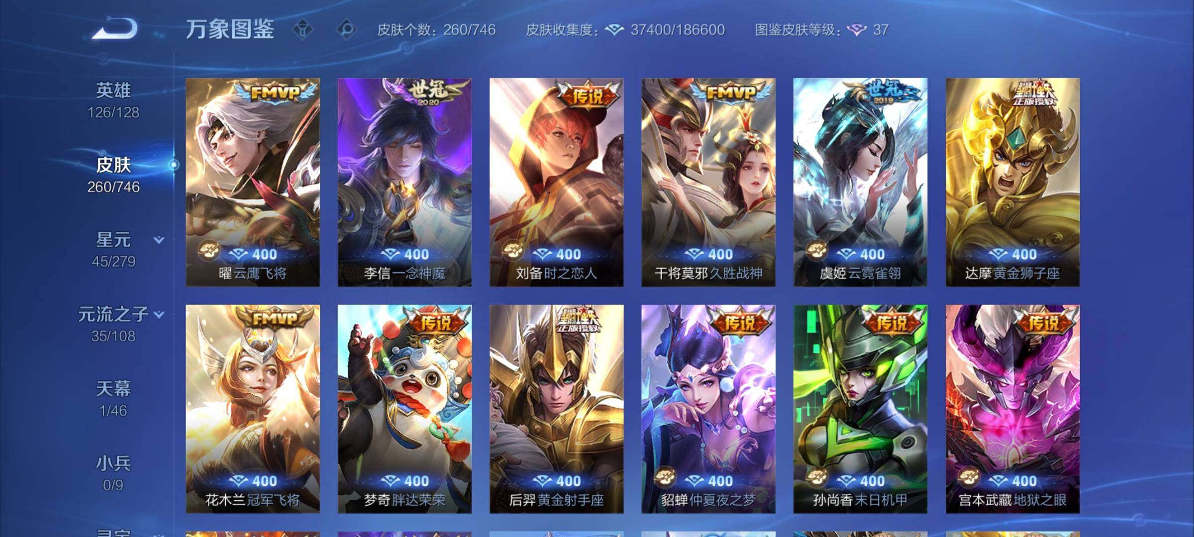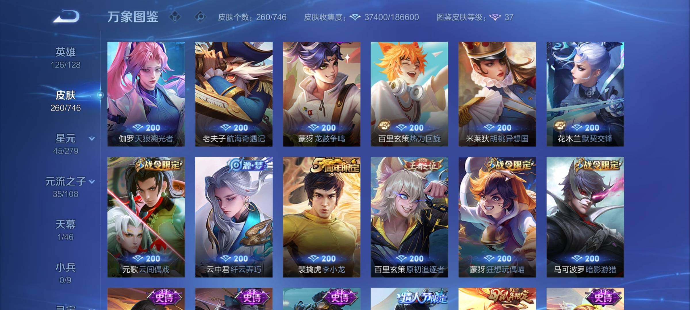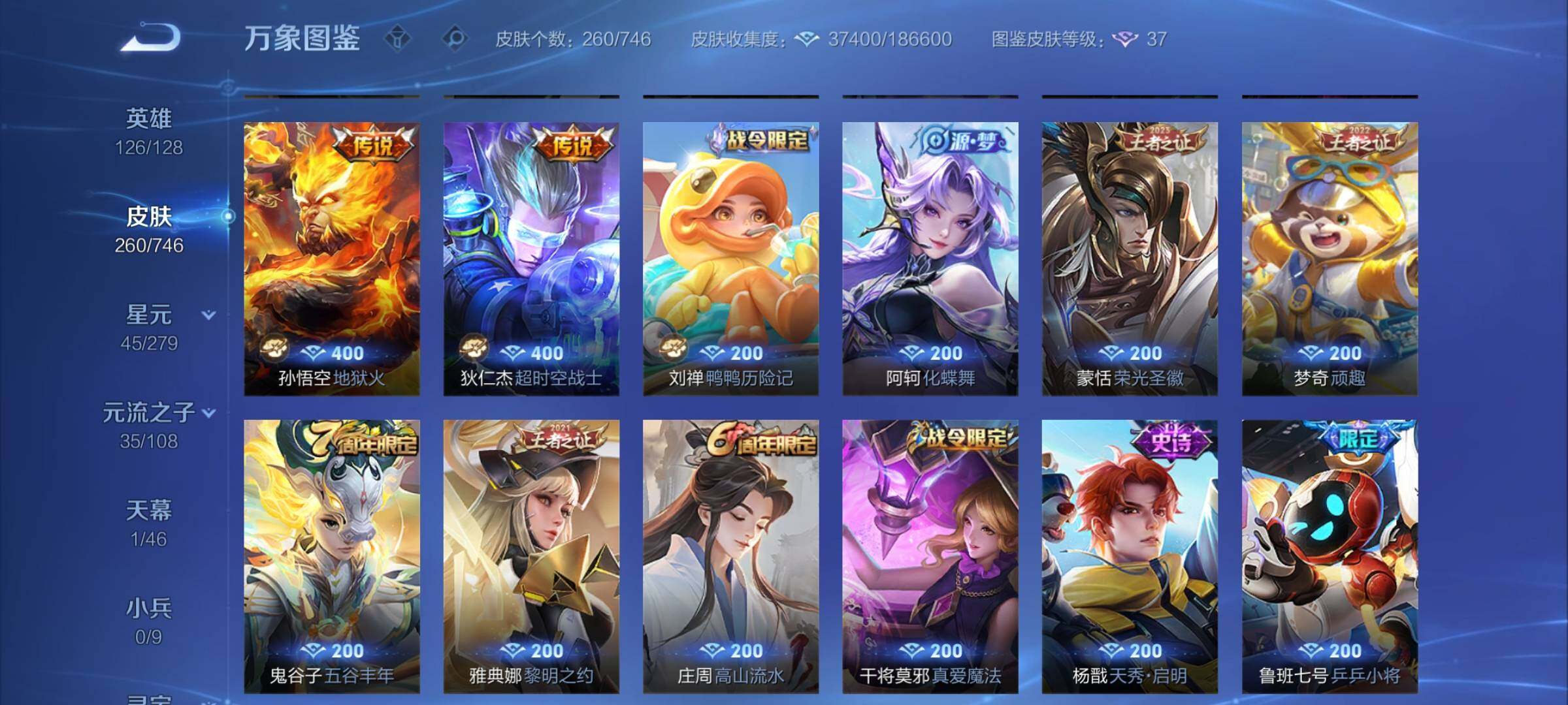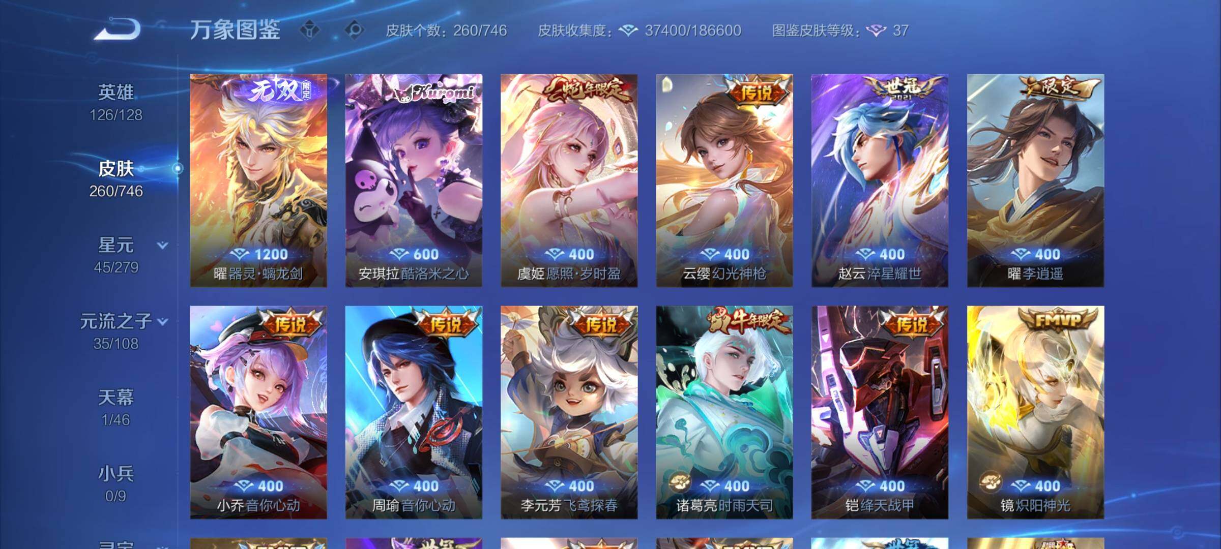 【高性价比·曜器灵螭龙剑·金标猴子·酷洛米之心·愿照岁时盈·淬星耀世·曜李·时雨天司·铠绛天战甲·炽阳神光·云鹰飞将·一念神魔·云霓雀翎·朱雀志·乒乒小将·可二次】w6108-安卓wx-126英雄-260皮肤-16王者印记-300铭文-贵族积分2w【贵族7】【1无双·1珍品传说·3星传说·24传说·1天幕·5按键·230幸运值】【因赛季更新游戏段付以上号为准!】 【无双皮肤】:曜器灵螭
