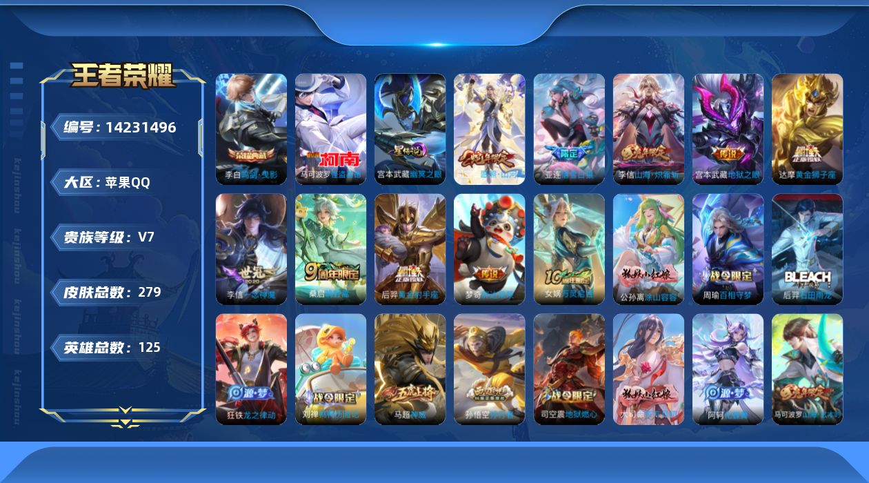 [14231496]可二次【店主推荐捡漏号!可直接换绑】万战亚连,对抗路48段,苹果q-v7-最强王者段位-125英雄-279皮肤-1典藏皮肤-1珍品传说-1星传说-9传说-90史诗 【英雄全皮】:李信全皮,亚连全皮,蒙恬全皮,司空震全皮,影全皮,姬小满全皮 【荣耀典藏】:李白鸣剑曳影 【珍品传说】:马可波罗怪盗基德 【传说皮肤】:司空震愿照山河定,桑启鸣野蒿,亚连落雪白狼,李信山海炽霜斩,李信一念神魔,达摩黄金狮子座,梦奇胖达荣荣,后羿黄金射手座,宫本武藏地狱之眼 【限定皮肤】:大乔绒语心约,姜子牙天穹之誓,狄仁杰阴阳师,赵云皇家上将,墨子神迹守卫,孙尚香蔷薇恋人,庄周高山流水,高渐离玩趣恶龙,钟无艳超时空战士,白起夜都怪侠,芈月幻夜卜梦,元歌云间偶戏,元歌无心,甄姬落雪兰心,马可波罗山海玄木吟,狄仁杰魔术师,狄仁杰万华元夜,达摩星际陆战队,达摩沙漠行僧,项羽海滩派对,老夫子航海奇遇记,程咬金演武夺筹,兰陵王金庭之子,亚瑟潮玩骑士王,孙悟空孙行者,后羿圣弓游侠,李元芳云中旅人,钟馗神迹守卫,钟馗驱傩正仪,杨戬潮玩骑兵,女娲朔望之晖,干将莫邪真爱魔法,雅典娜单词大作战,雅典娜黎明之约,鬼谷子五谷丰年,黄忠火炮绅士,苏烈千军破阵,百里玄策原初追逐者,梦奇顽趣,沈梦溪大漠名商,明世隐吟游魔法,裴擒虎李小龙,裴擒虎擒涛扼浪,米莱狄胡桃异想国,云中君纤云弄巧,李信山海炽霜斩,猪八戒西部大镖客,嫦娥拒霜思,嫦娥暖冬兔眠,鲁班大师探海日志,桑启海盐诗旅,暃星界游侠,艾琳流音漫舞,司空震地狱燃心,阿古朵江河有灵,张良古海寻踪,蒙犽百解令,蒙恬荣光圣徽,高渐离燃音魔法,妲己灵卜魔法,鬼谷子天穹祈灯,姬小满妄想食味,亚连落雪白狼,沈梦溪龙舞盛年,刘邦剑破天穹,程咬金群星魔术团,项羽苍威无极,周瑜熔金海岸 【年限皮肤】:马超神威,马可波罗山海玄木吟,李信山海炽霜斩 【赛季限定】:狄仁杰万华元夜,达摩沙漠行僧,程咬金演武夺筹,兰陵王金庭之子,张良古海寻踪,李元芳云中旅人,钟馗驱傩正仪,雅典娜黎明之约,苏烈千军破阵,百里玄策原初追逐者,梦奇顽趣,沈梦溪大漠名商,裴擒虎擒涛扼浪,鲁班大师探海日志,桑启海盐诗旅,鬼谷子天穹祈灯,蒙恬荣光圣徽,刘邦剑破天穹,姜子牙天穹之誓 【战令限定】:墨子神迹守卫,钟无艳超时空战士,白起夜都怪侠,芈月幻夜卜梦,元歌云间偶戏,甄姬落雪兰心,达摩星际陆战队,老夫子航海奇遇记,艾琳流