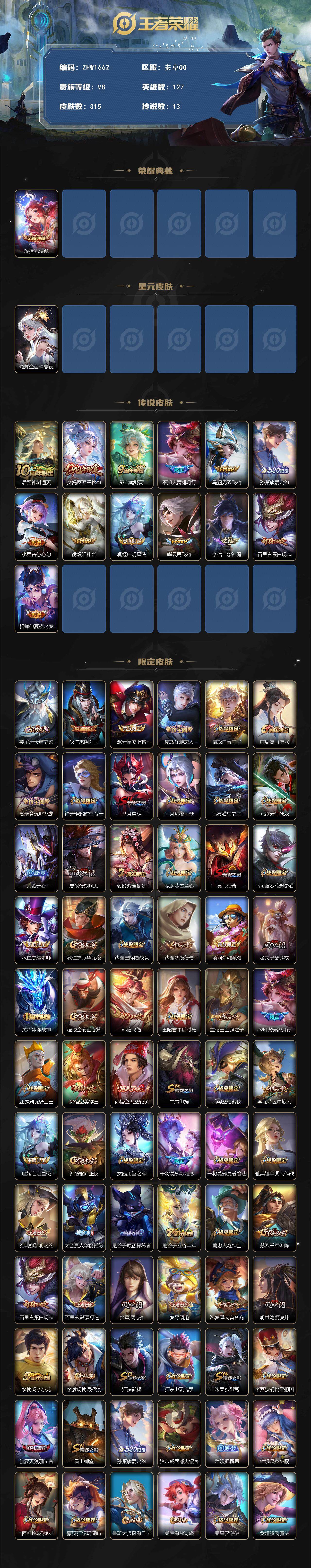 [14231822]可二次【店主推荐捡漏号!可直接换绑】安卓q-v8-最强王者段位-127英雄-315皮肤-1典藏皮肤-13传说-84史诗-1星元 【英雄全皮】:孙权全皮,狂铁全皮,影全皮 【荣耀典藏】:瑶拾光映像 【传说皮肤】:后羿神树通天,女娲愿照千秋盛,桑启鸣野蒿,不知火舞绯月行,马超无双飞将,孙策挚爱之约,小乔音你心动,镜炽阳神光,虞姬启明星使,曜云鹰飞将,李信一念神魔,百里玄策白虎志,貂蝉仲夏夜之梦 【限定皮肤】:姜子牙天穹之誓,狄仁杰阴阳师,赵云皇家上将,嬴政优雅恋人,嬴政白昼王子,庄周高山流水,高渐离玩趣恶龙,钟无艳超时空战士,芈月重明,芈月幻夜卜梦,吕布猎兽之王,元歌云间偶戏,元歌无心,夏侯惇朔风刀,甄姬游园惊梦,甄姬落雪兰心,典韦穷奇,马可波罗暗影游猎,狄仁杰魔术师,狄仁杰万华元夜,达摩星际陆战队,达摩沙漠行僧,项羽海滩派对,老夫子醍醐杖,关羽冰锋战神,程咬金演武夺筹,韩信飞衡,王昭君午后时光,兰陵王金庭之子,不知火舞绯月行,亚瑟潮玩骑士王,孙悟空美猴王,孙悟空大圣娶亲,牛魔御旌,后羿圣弓游侠,李元芳云中旅人,虞姬启明星使,钟馗驱傩正仪,女娲朔望之晖,干将莫邪冰霜恋舞曲,干将莫邪真爱魔法,雅典娜单词大作战,雅典娜黎明之约,太乙真人华丽摇滚,鬼谷子原初探秘者,鬼谷子五谷丰年,黄忠火炮绅士,苏烈千军破阵,百里玄策白虎志,百里玄策原初追逐者,弈星混沌棋,梦奇顽趣,沈梦溪大漠名商,明世隐疑决卦,裴擒虎李小龙,裴擒虎擒涛扼浪,狂铁御狮,狂铁电玩高手,米莱狄御霄,米莱狄胡桃异想国,伽罗天狼溯光者,盾山御銮,孙策挚爱之约,猪八戒西部大镖客,嫦娥拒霜思,嫦娥暖冬兔眠,西施玲珑珍味,蒙犽狂想玩偶喵,鲁班大师探海日志,桑启海盐诗旅,暃星界游侠,戈娅驭风魔法,阿古朵江河有灵,张良古海寻踪,蒙恬荣光圣徽,鬼谷子天穹祈灯,姬小满妄想食味,沈梦溪龙舞盛年,刘邦剑破天穹,周瑜熔金海岸 【年限皮肤】:百里玄策白虎志,孙悟空美猴王,韩信飞衡 【赛季限定】:芈月重明,夏侯惇朔风刀,典韦穷奇,狄仁杰万华元夜,达摩沙漠行僧,老夫子醍醐杖,程咬金演武夺筹,兰陵王金庭之子,张良古海寻踪,牛魔御旌,李元芳云中旅人,钟馗驱傩正仪,雅典娜黎明之约,鬼谷子原初探秘者,苏烈千军破阵,百里玄策原初追逐者,弈星混沌棋,梦奇顽趣,沈梦溪大漠名商,明世隐疑决卦,裴擒虎擒涛扼浪,狂铁御狮,米莱狄御霄,盾山御銮,鲁班大师探海日志,