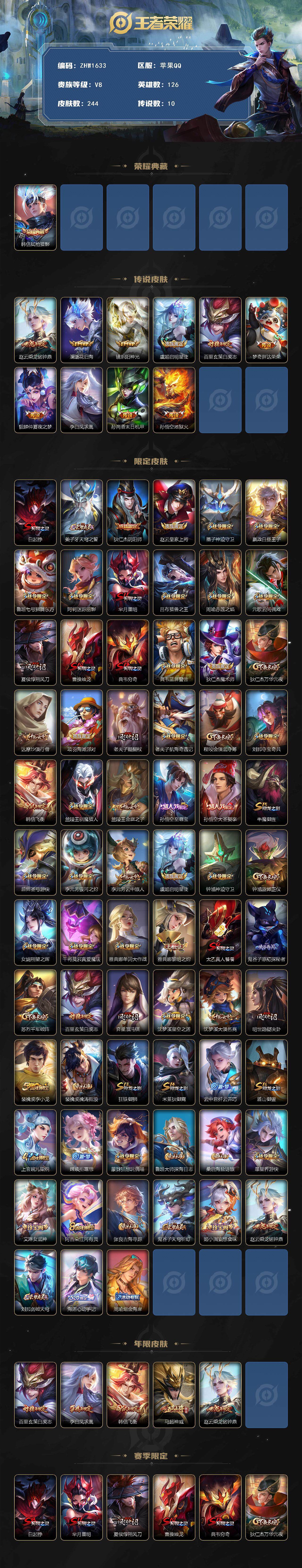 【店主推荐捡漏号!可直接换绑】,,苹果q-v8-至尊星耀iv段位-126英雄-244皮肤-1典藏皮肤-1星传说-10传说-64史诗 【荣耀典藏】:韩信弑呛猎影 【传说皮肤】:赵云乘龙铭钟鼎,澜逐花归海,镜炽阳神光,虞姬启明星使,百里玄策白虎志,梦奇胖达荣荣,貂蝉仲夏夜之梦,李白凤求凰,孙尚香末日机甲,孙悟空地狱火 【限定皮肤】:白起狰,姜子牙天穹之誓,狄仁杰阴阳师,赵云皇家上将,墨子神迹守卫,嬴政白昼王子,鲁班七号狮舞东方,阿轲迷踪丽影,芈月重明,吕布猎兽之王,周瑜赤莲之焰,元歌云间偶戏,夏侯惇朔风刀,曹操烛龙,典韦穷奇,典韦蓝屏警告,狄仁杰魔术师,狄仁杰万华元夜,达摩沙漠行僧,项羽海滩派对,老夫子醍醐杖,老夫子航海奇遇记,程咬金演武夺筹,刘邦夺宝奇兵,韩信飞衡,兰陵王驯魔猎人,兰陵王金庭之子,孙悟空至尊宝,孙悟空大圣娶亲,牛魔御旌,后羿圣弓游侠,李元芳银河之约,李元芳云中旅人,虞姬启明星使,钟馗神迹守卫,钟馗驱傩正仪,女娲朔望之晖,干将莫邪真爱魔法,雅典娜单词大作战,雅典娜黎明之约,太乙真人饕餮,鬼谷子原初探秘者,苏烈千军破阵,百里玄策白虎志,弈星混沌棋,沈梦溪星空之诺,沈梦溪大漠名商,明世隐疑决卦,裴擒虎李小龙,裴擒虎擒涛扼浪,狂铁御狮,米莱狄御霄,云中君纤云弄巧,盾山御銮,上官婉儿梁祝,嫦娥拒霜思,蒙犽狂想玩偶喵,鲁班大师探海日志,桑启海盐诗旅,暃星界游侠,艾琳女武神,阿古朵江河有灵,张良古海寻踪,鬼谷子天穹祈灯,姬小满妄想食味,赵云乘龙铭钟鼎,刘邦剑破天穹,海诺心动手记,周瑜熔金海岸 【年限皮肤】:百里玄策白虎志,李白凤求凰,韩信飞衡,马超神威,赵云乘龙铭钟鼎 【赛季限定】:白起狰,芈月重明,夏侯惇朔风刀,曹操烛龙,典韦穷奇,狄仁杰万华元夜,达摩沙漠行僧,老夫子醍醐杖,程咬金演武夺筹,兰陵王金庭之子,张良古海寻踪,牛魔御旌,李元芳云中旅人,钟馗驱傩正仪,雅典娜黎明之约,太乙真人饕餮,鬼谷子原初探秘者,苏烈千军破阵,弈星混沌棋,沈梦溪大漠名商,明世隐疑决卦,裴擒虎擒涛扼浪,狂铁御狮,米莱狄御霄,盾山御銮,鲁班大师探海日志,桑启海盐诗旅,鬼谷子天穹祈灯,刘邦剑破天穹,姜子牙天穹之誓 【战令限定】:墨子神迹守卫,嬴政白昼王子,鲁班七号狮舞东方,阿轲迷踪丽影,吕布猎兽之王,周瑜赤莲之焰,元歌云间偶戏,典韦蓝屏警告,老夫子航海奇遇记,刘邦夺宝奇兵,兰陵王驯魔猎人,后羿圣弓游侠,李元芳银河之约,钟馗神迹守卫,女娲朔望之晖,干将莫邪真爱魔法,雅典娜单词大作战,沈梦溪星空之诺,蒙犽狂想玩偶喵,暃星界游侠 【史诗皮肤】:露娜紫霞仙子,阿轲暗夜猫娘,赵云皇家上将,赵云未来纪元,甄姬冰雪圆舞曲,王昭君偶像歌手,狄仁杰魔术师,宫本武藏鬼剑武藏,孙尚香水果甜心,妲己魅力维加斯,妲己女仆咖啡,墨子龙骑士,墨子金属风暴,吕布圣诞狂欢,曹操幽灵船长,李白千年之狐,吕布末日机甲,张飞乱世虎臣,韩信白龙吟,孙悟空至尊宝,花木兰水晶猎龙者,刘邦德古拉伯爵,夏侯惇乘风破浪,兰陵王暗隐猎兽者,诸葛亮黄金分割率,雅典娜冰冠公主,百里守约特工魅影,铠曙光守护者,李元芳逐浪之夏,白起星夜王子,阿轲节奏热浪,嬴政白昼王子,孙悟空大圣娶亲,典韦蓝屏警告,伽罗箭羽风息,鲁班七号狮舞东方,狄仁杰鹰眼统帅,兰陵王驯魔猎人,上官婉儿梁祝,李元芳银河之约,娜可露露晚萤,韩信飞衡,阿轲迷踪丽影,橘右京修罗,马超神威,蒙犽狂想玩偶喵,裴擒虎李小龙,云中君纤云弄巧,元歌云间偶戏,老夫子航海奇遇记,干将莫邪真爱魔法,嫦娥拒霜思,雅典娜黎明之约,艾琳奇遇舞章,暃星界游侠,阿古朵江河有灵,姬小满妄想食味,海诺心动手记,黄忠怒海争锋,孙膑茶境仙,阿轲化蝶舞,周瑜百相守梦,黄忠百相守梦,公孙离涂山容容 【其他皮肤】:项羽海滩派对,韩信教廷特使,韩信街头霸王,露娜哥特玫瑰,阿轲致命风华,达摩大发明家,赵云忍炎影,艾琳女武神,程咬金爱与正义,牛魔西部大镖客,扁鹊化身博士,安琪拉玩偶对对碰,孙膑天使之翼,妲己少女阿狸,典韦黄金武士,亚瑟死亡骑士,达摩拳王,花木兰兔女郎,后羿阿尔法小队,狄仁杰阴阳师,刘备纽约教父,刘备汉昭烈帝,关羽龙腾万里,墨子进击墨子号,白起狰,钟无艳海滩丽影,太乙真人饕餮,宫本武藏霸王丸,曹操烛龙,王昭君幻想奇妙夜,芈月重明,老夫子功夫老勺,牛魔制霸全明星,典韦穷奇,诸葛亮掌控之力,鬼谷子幻乐之宴,狂铁御狮,安琪拉如懿,米莱狄御霄,吕布猎兽之王,明世隐虹云星官,庄周奇妙博物学,牛魔御旌,女娲朔望之晖,小乔丁香结,钟馗神迹守卫,盾山御銮,孙膑归虚梦演,沈梦溪鲨炮海盗猫,姜子牙炽热元素使,夏侯惇朔风刀,周瑜赤莲之焰,沈梦溪星空之诺,弈星混沌棋,哪吒次元突破,明世隐疑决卦,刘邦夺宝奇兵,盾山圆桌骑士,老夫子醍醐杖,狂铁特工战影,鬼谷子原初探秘者,雅典娜单词大作战,狄仁杰万华元夜,刘禅秘密基地,露娜瓷语鉴心,程咬金演武夺筹,张良缤纷绘卷,钟馗驱傩正仪,墨子神迹守卫,鲁班大师乓乓大师,苏烈千军破阵,后羿圣弓游侠,典韦铁甲之心,妲己紫罗兰之誓,达摩沙漠行僧,程咬金无双福将,兰陵王金庭之子,沈梦溪大漠名商,李元芳云中旅人,桑启海盐诗旅,猪八戒潮玩探月行,裴擒虎擒涛扼浪,莱西奥西部游侠,鲁班大师探海日志,姬小满零食大作战,张良古海寻踪,亚连破局者,曹操决胜大满贯,后羿完美运算,鬼谷子天穹祈灯,廉颇功夫炙烤,刘邦剑破天穹,大司